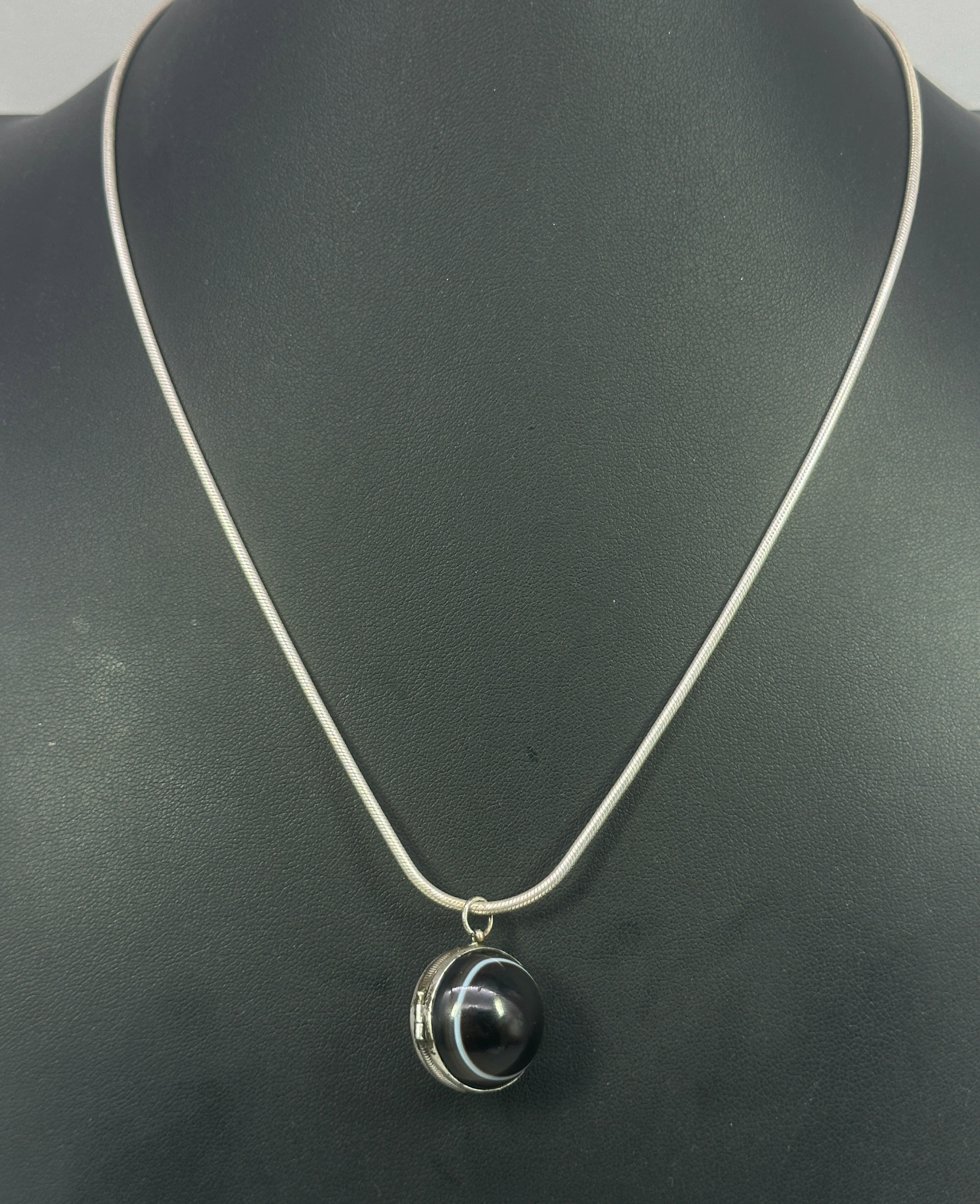 This is a very unusual sperical keepsake locket that features two bulleye agate stones that create a perfect sphere. It is perfect for a lock of hair or a tiny portrait. It is paired with a modern snack chain. This is Scottish and is unmarked.| Size: | Diameter of locket is 20mm, Necklace is 50 cm long. |