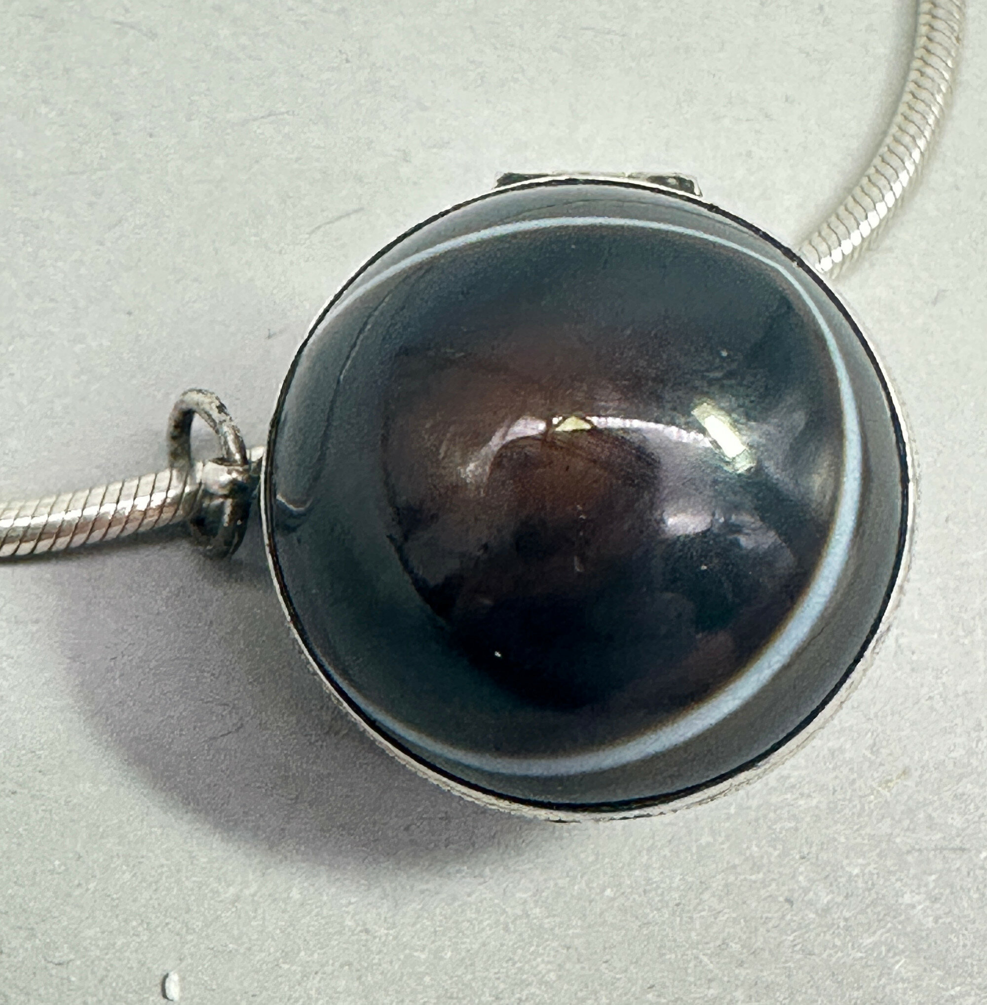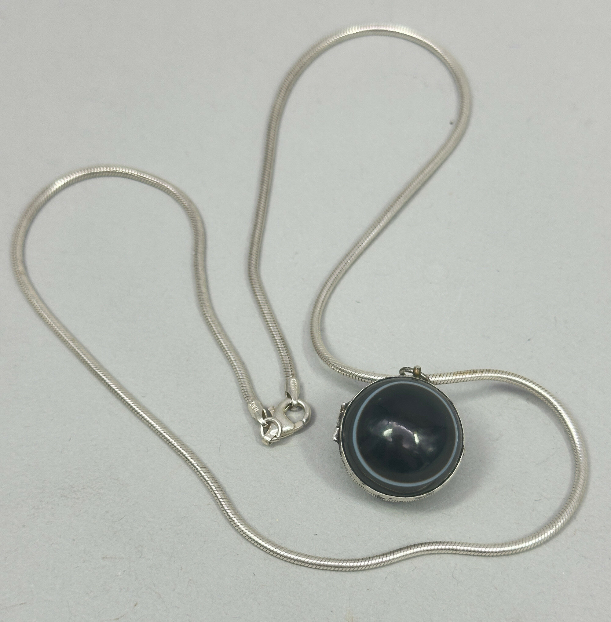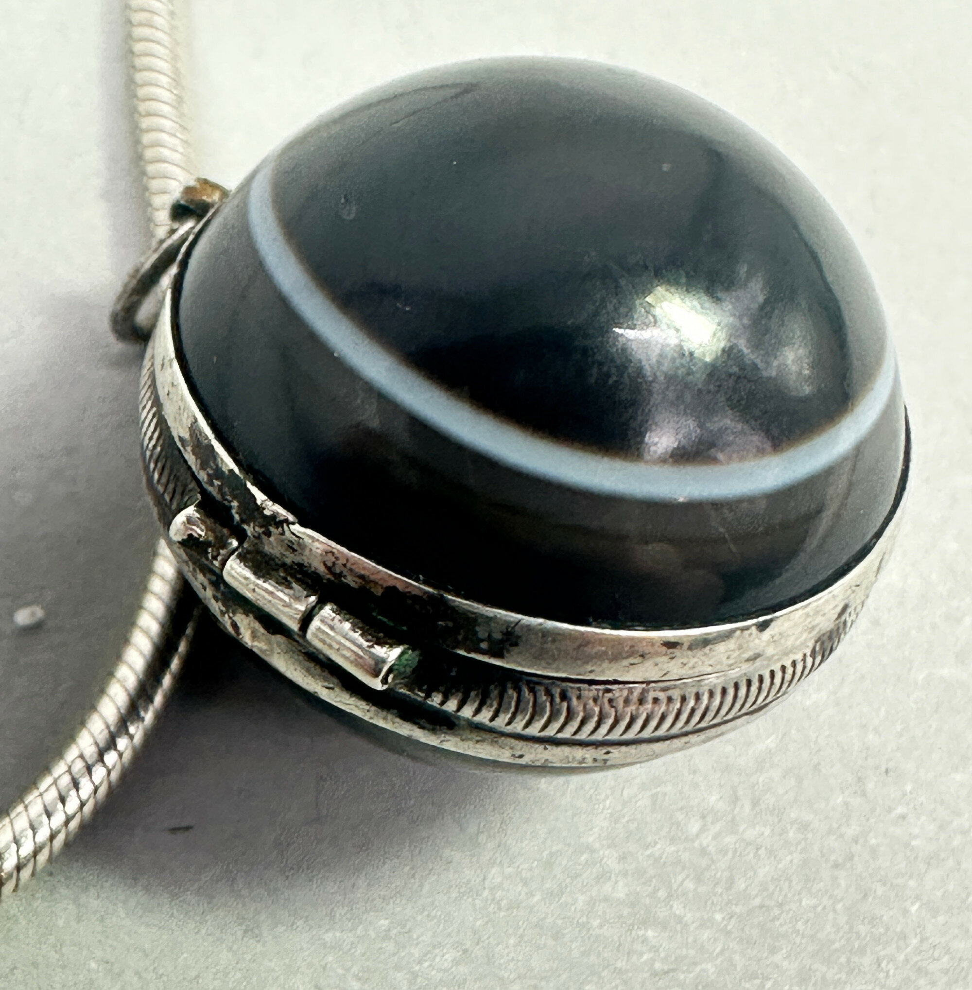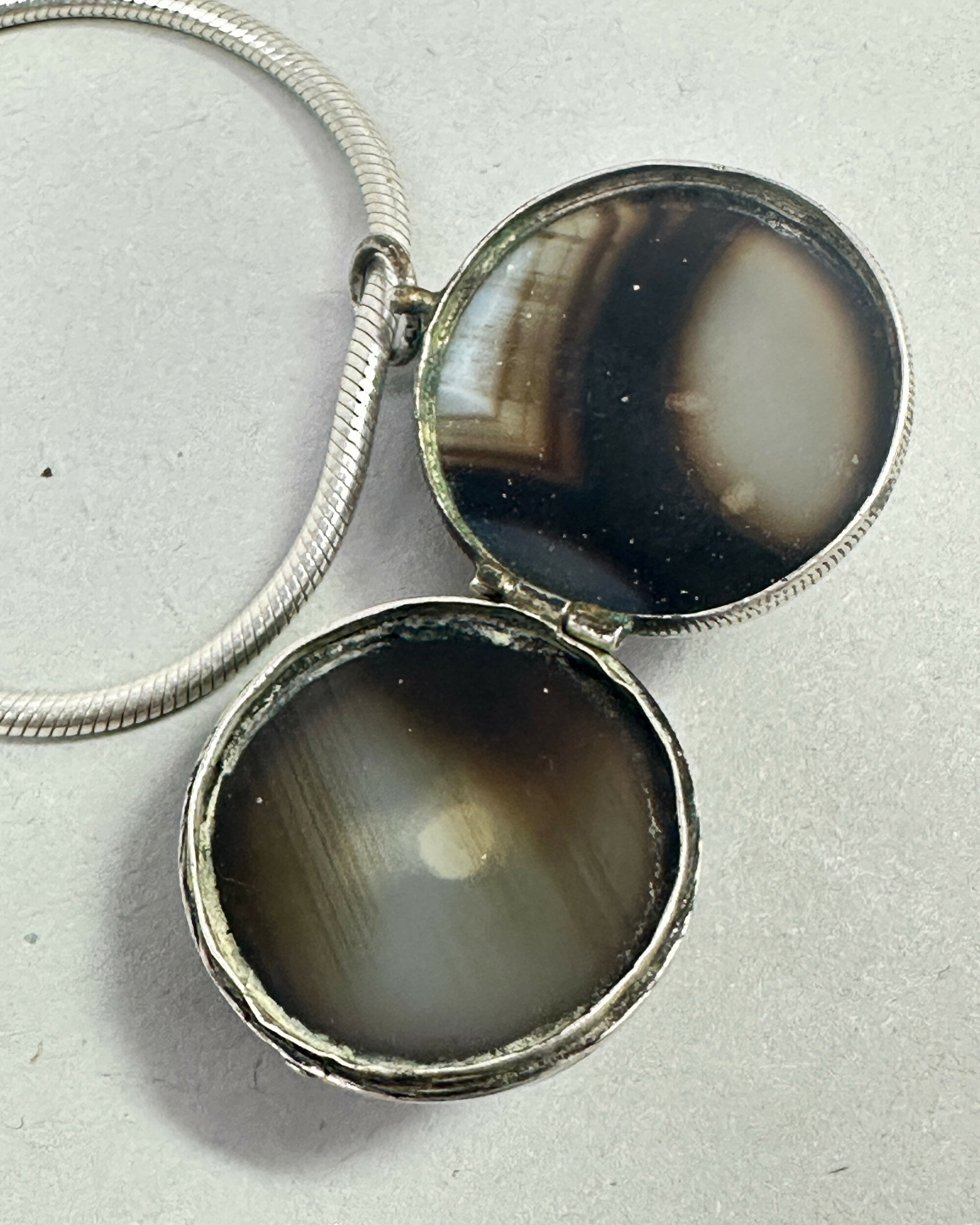 Art Deco bullseye agate sperical locket on modern chain c1920