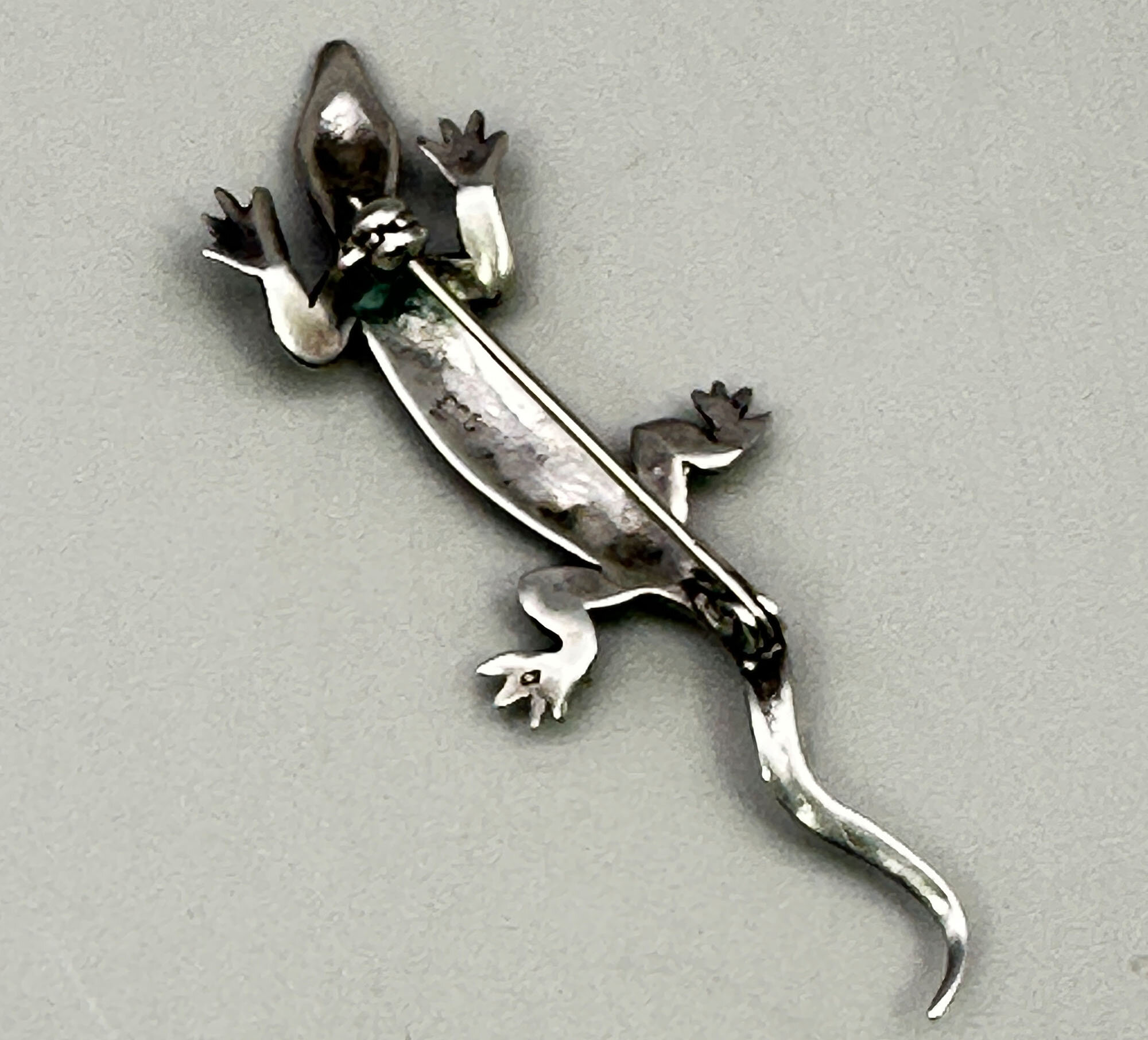 This is a very delicate brooch in the form of lizard.It has quite detailed enamel work set with marcasite stones.| Size: | 61 x 20 mm |