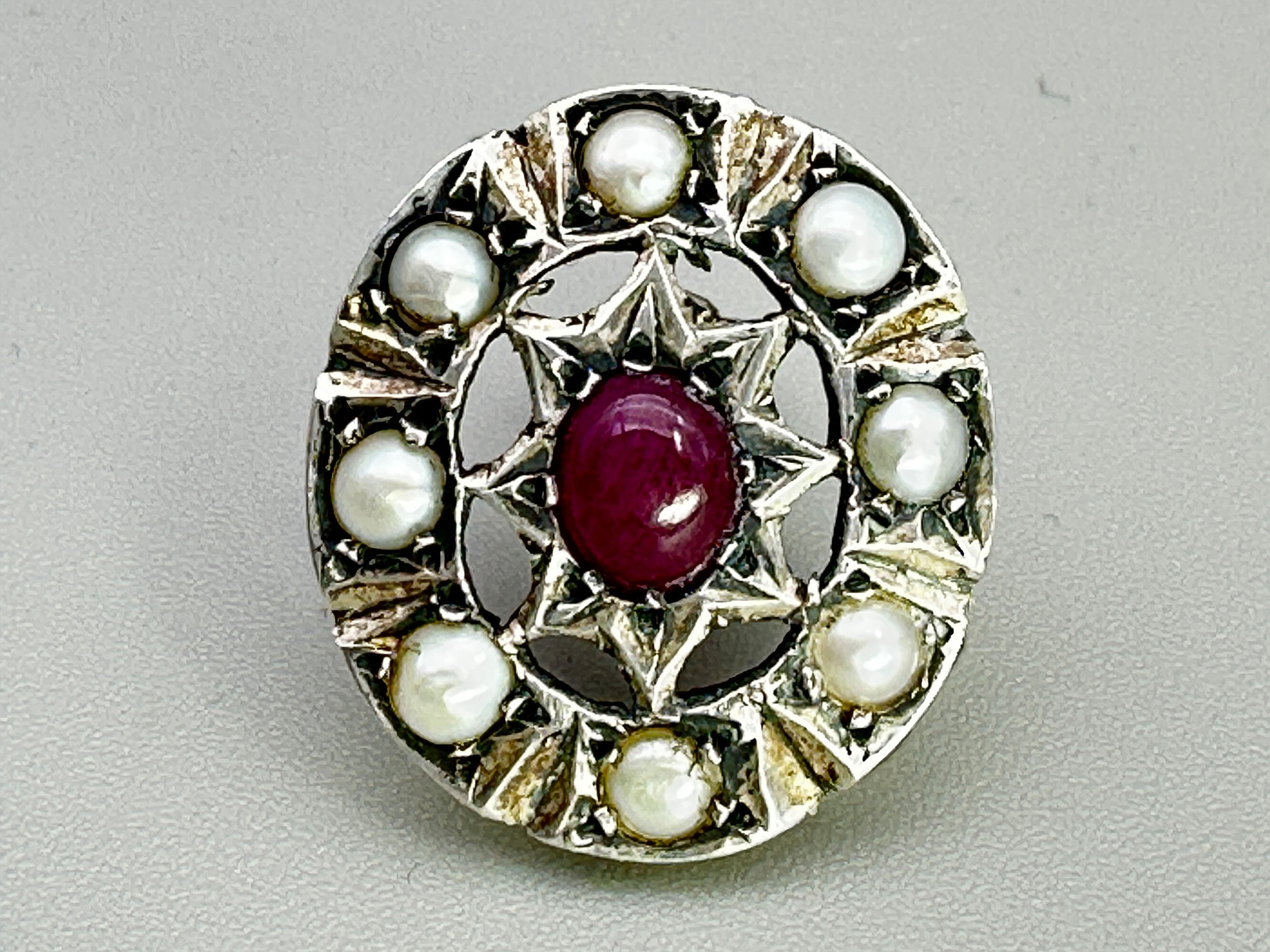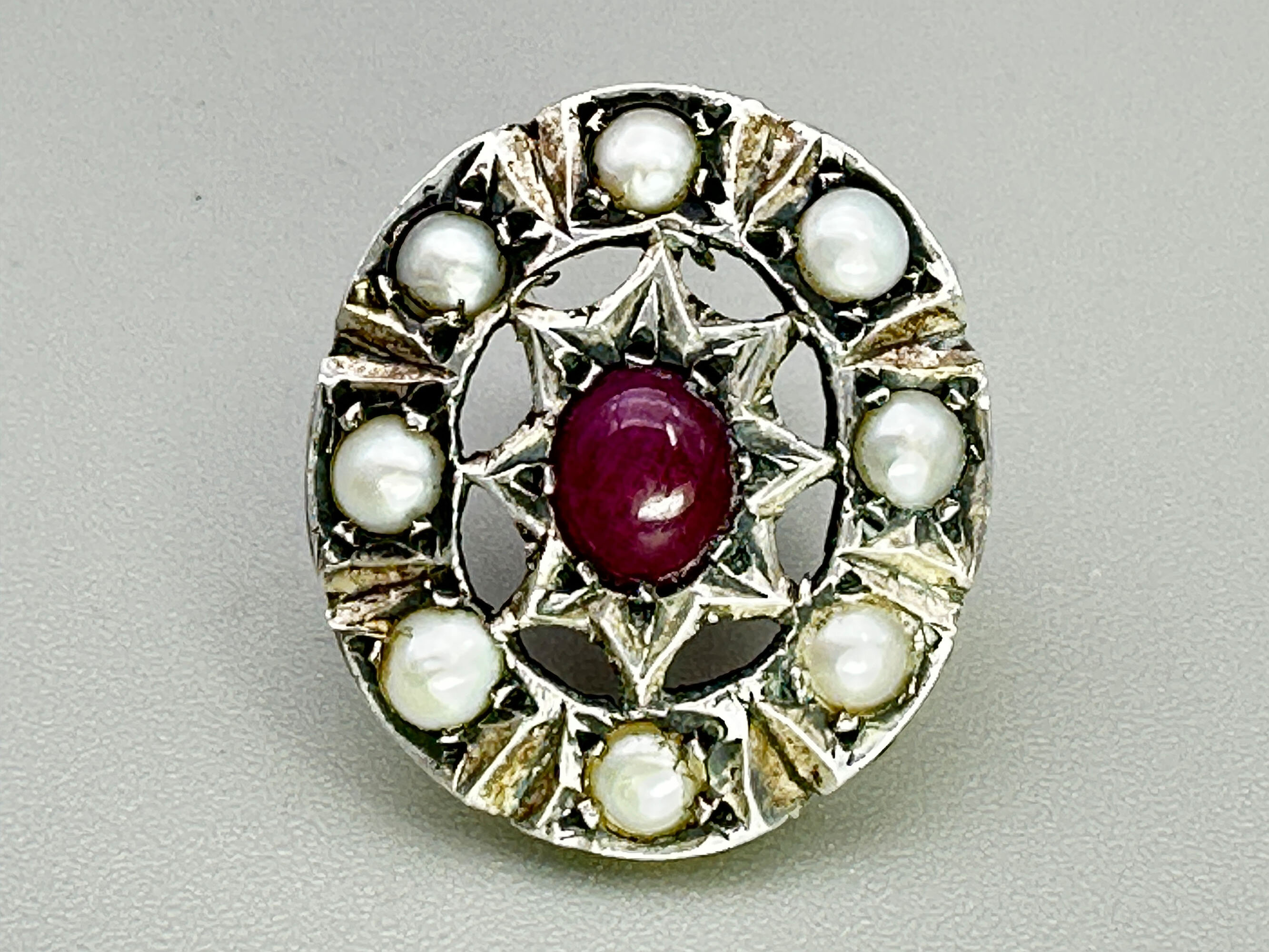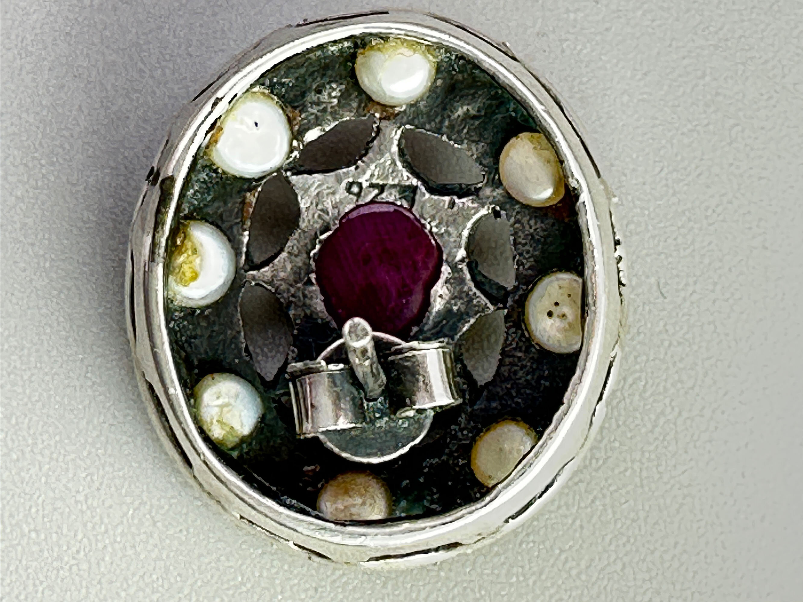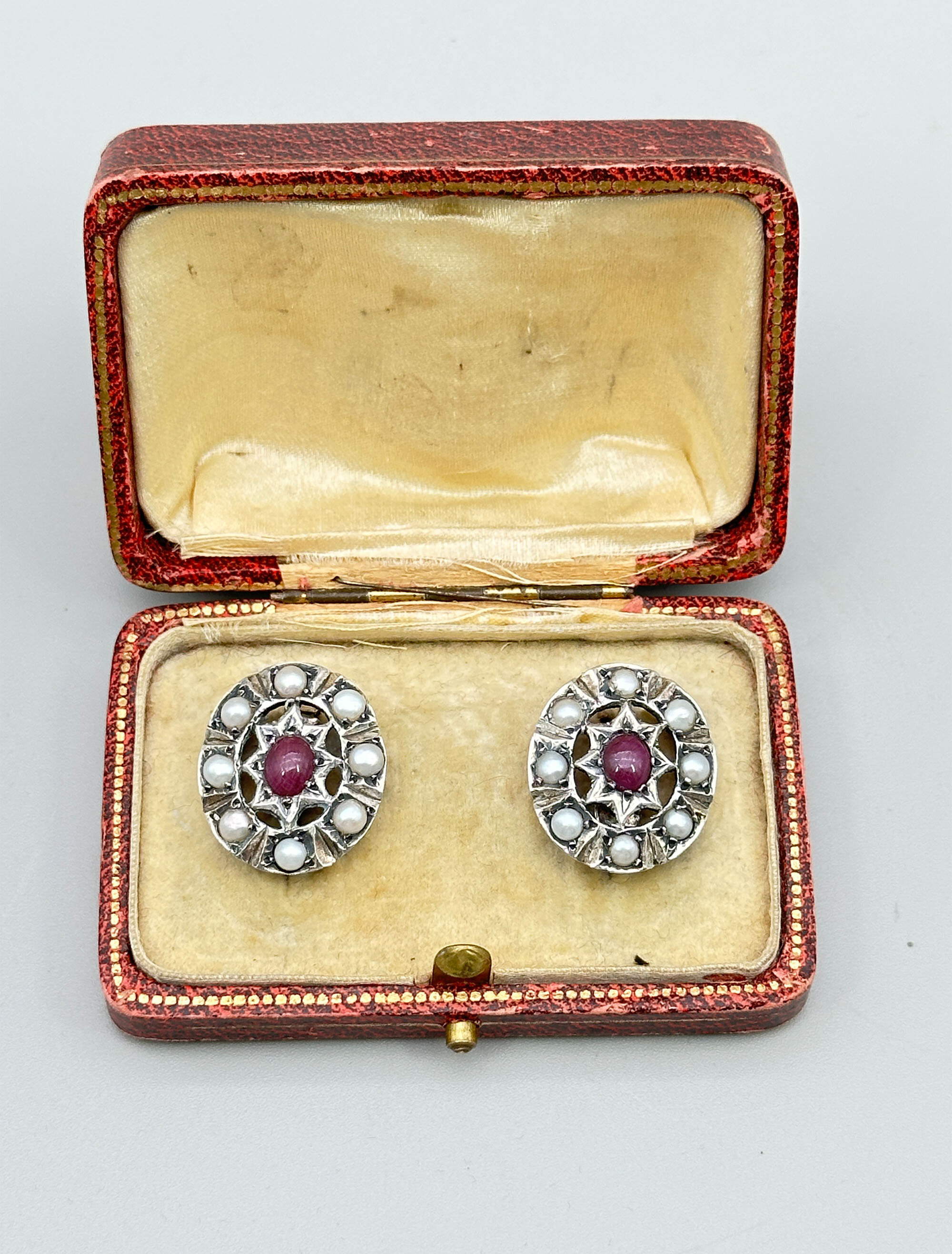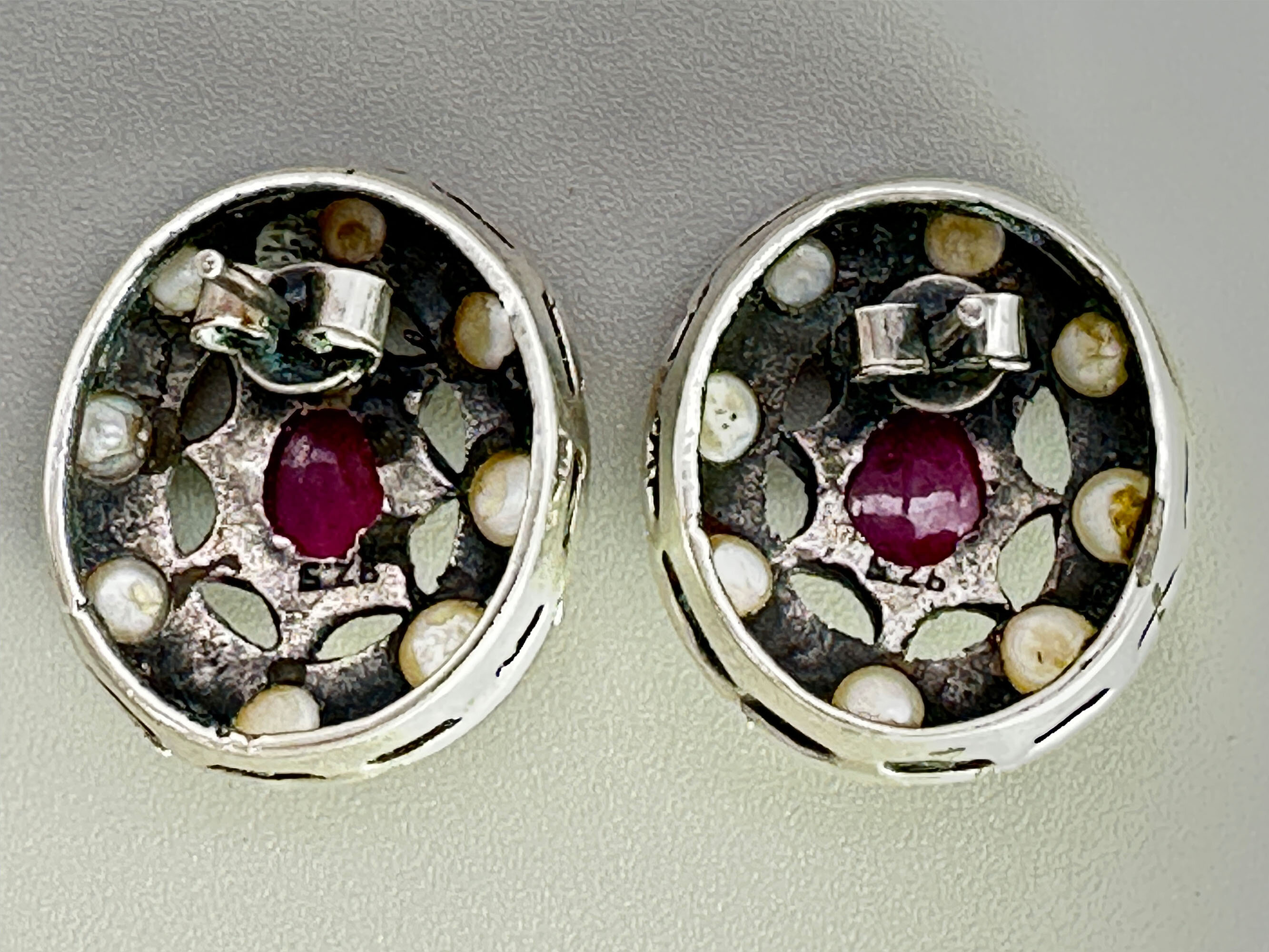 These are a wonderful pair of earrings that are in a shield design. These are set with ruby cabachons and freshwater cut pearls. They are marked 925.| Size: | 22.5 x 20.6 mm |