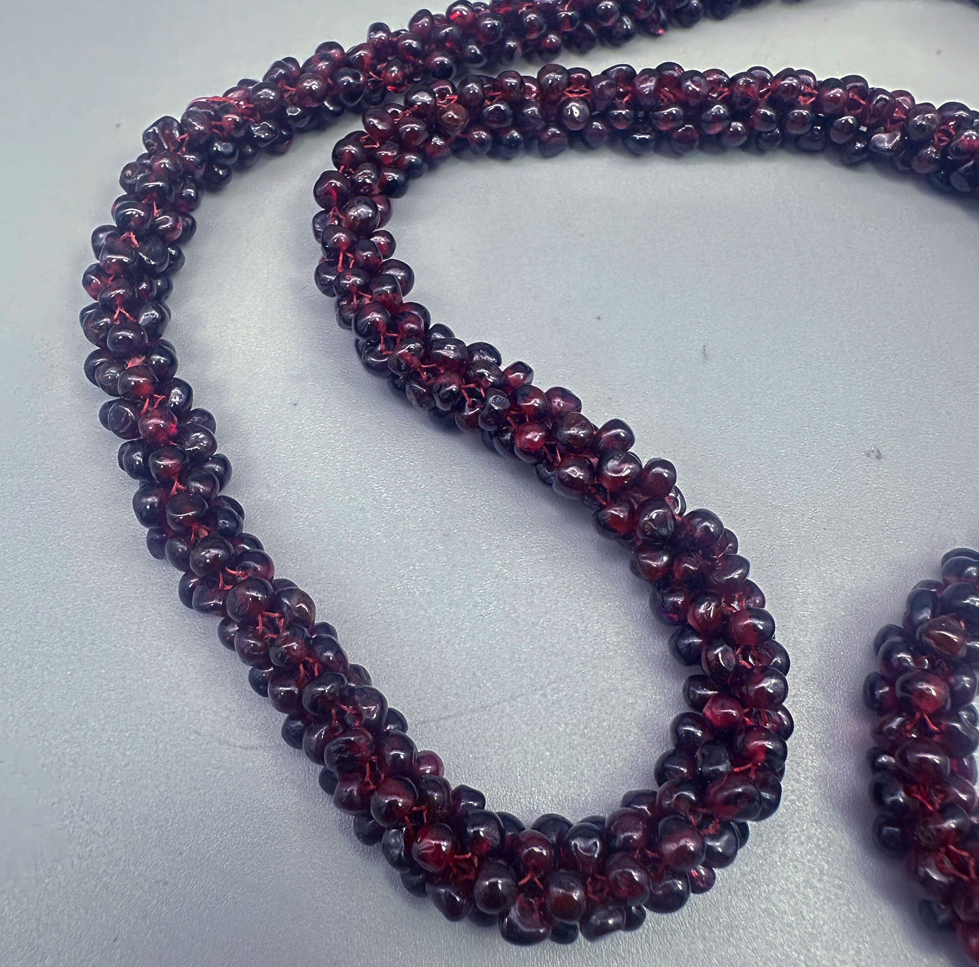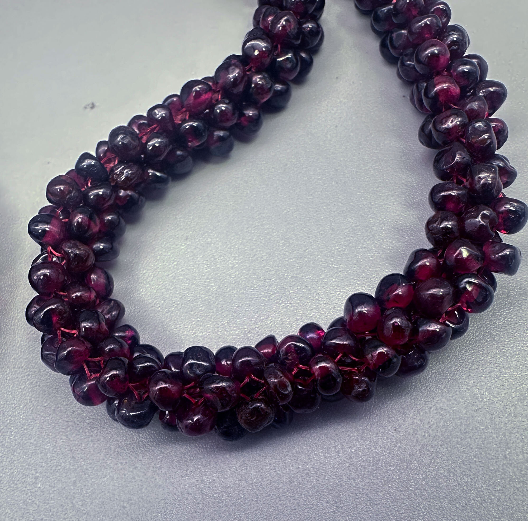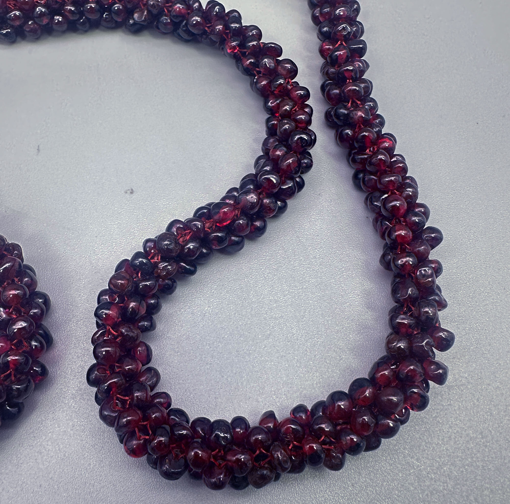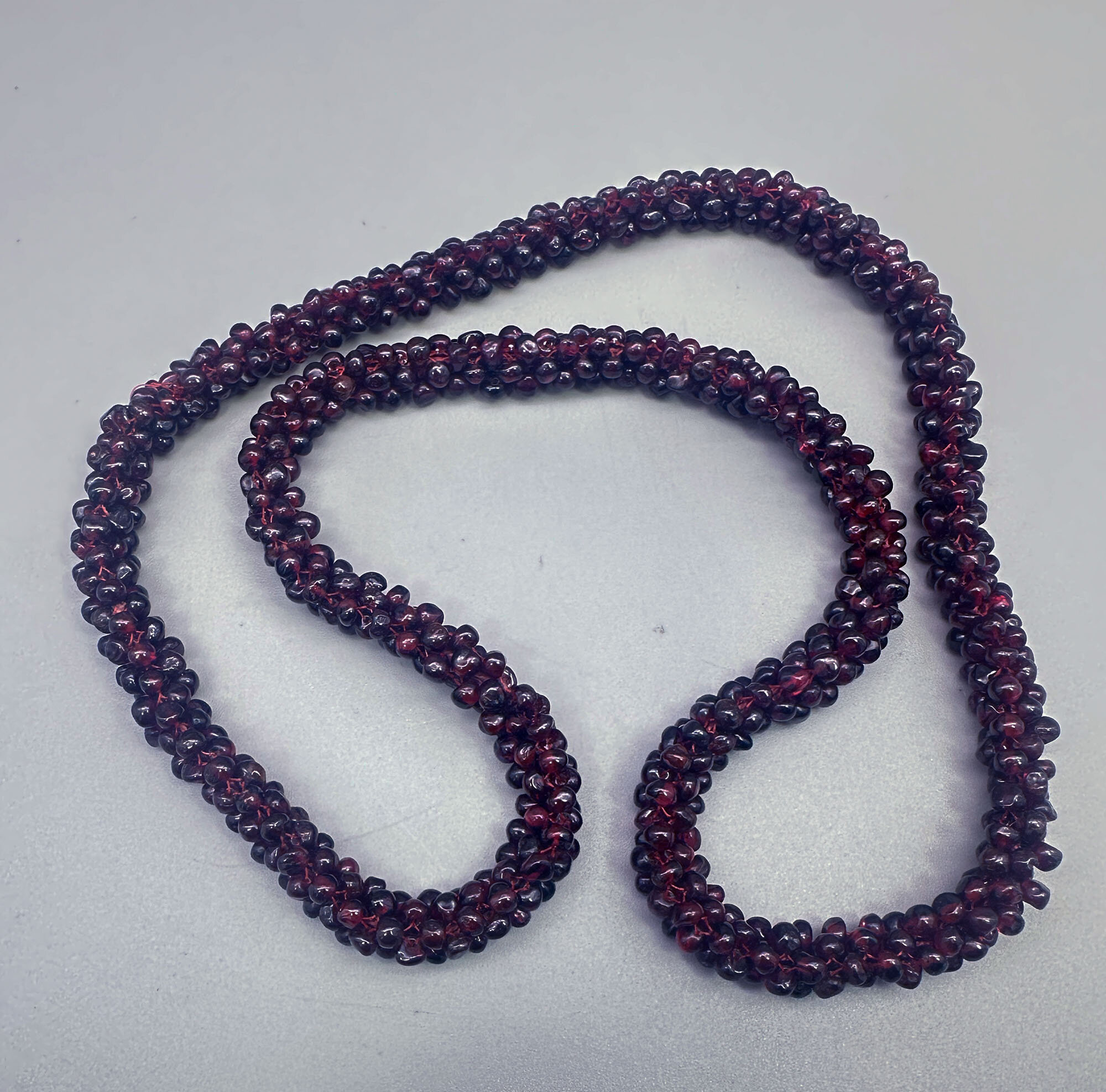 This is a very striking necklace comprising numerious small garnet beads woven together. This necklace goes over the head so does not have a clasp. Garnets like these are from India where they have quite a tradition working with these beads.| Size: | 6.6 mm wide, 64 cm long |