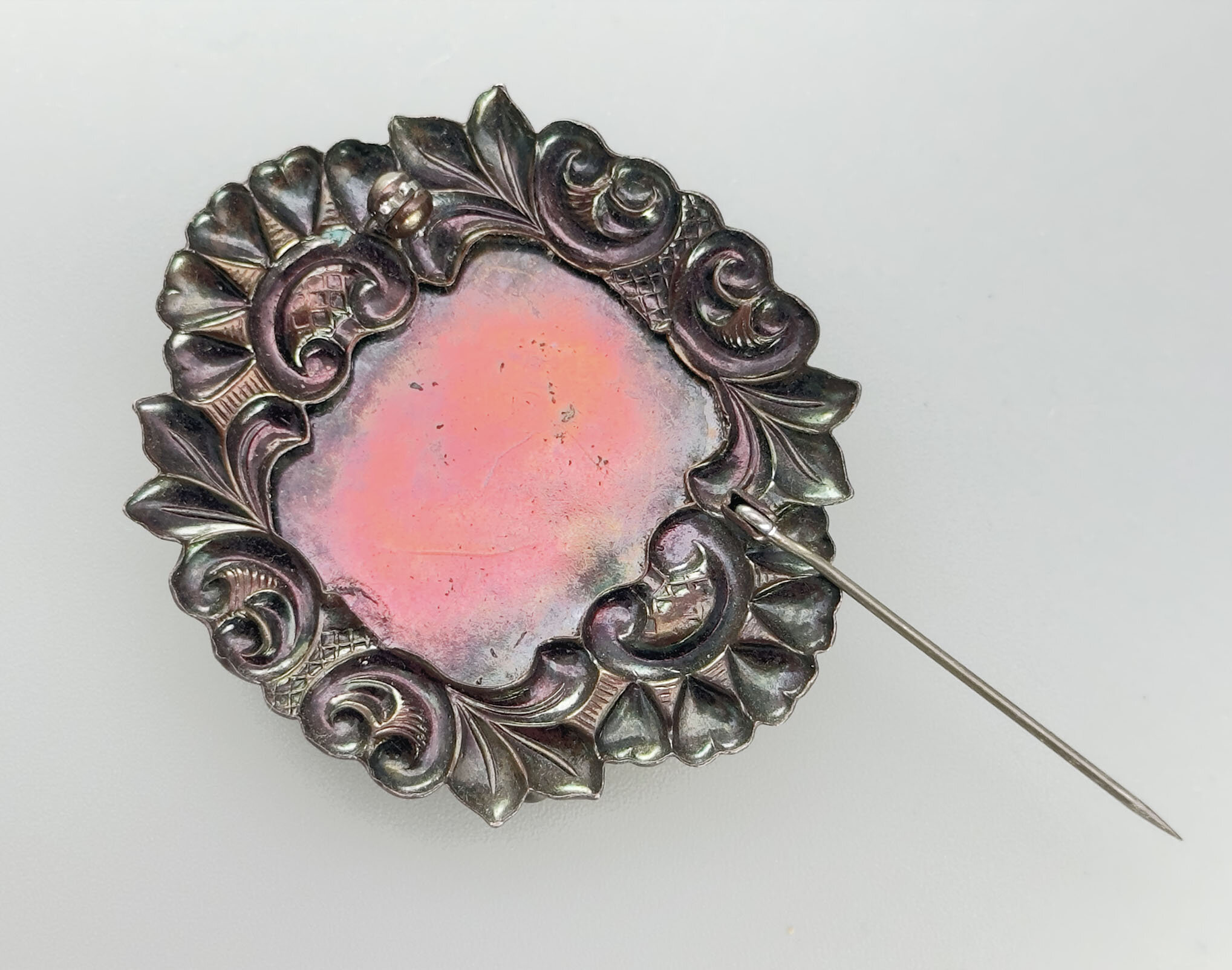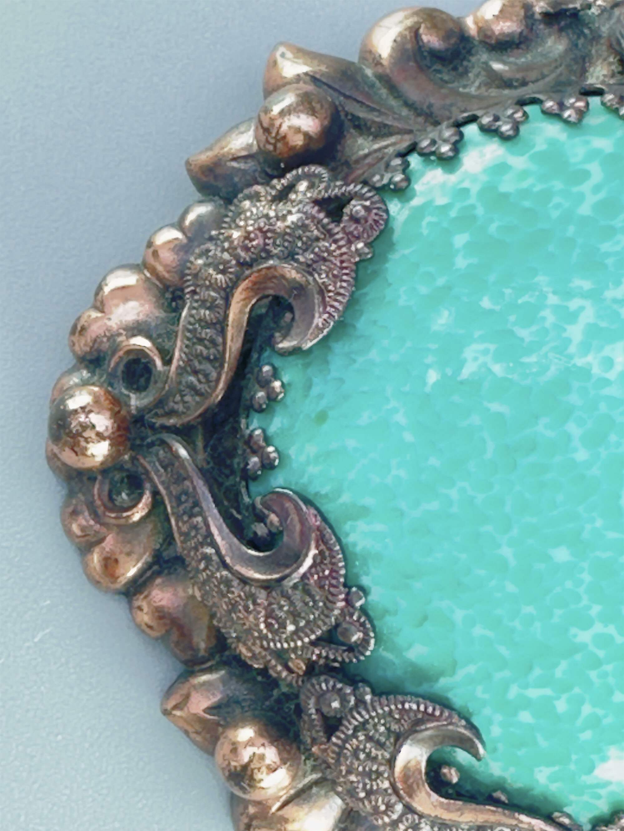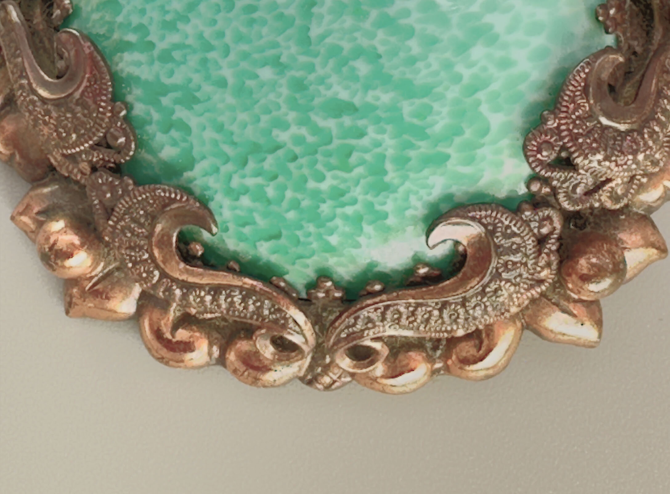 This is a very dramatic brooch that features a very intricate copper setting set with a very large Peking glass stone. The setting has a blackened effect that is somehow Victorian and modern at the same time. Another find for vintage collectors.| Size: | 47.5 x 55 cm |