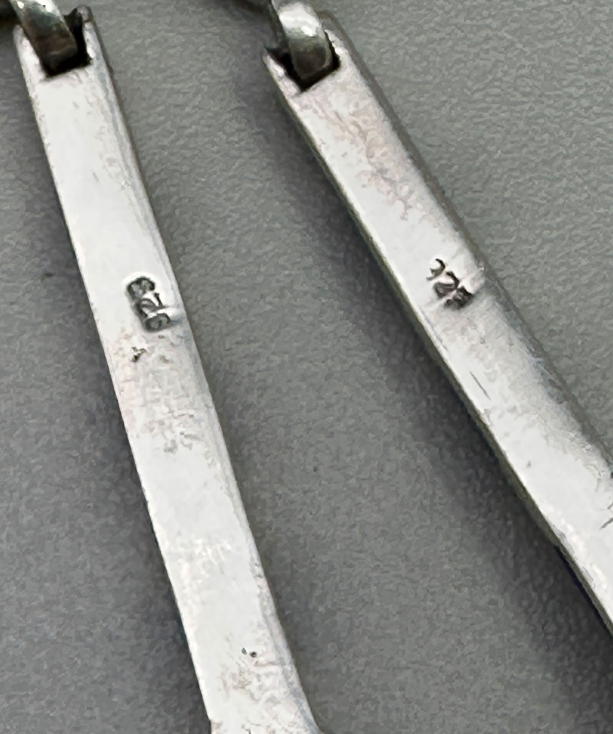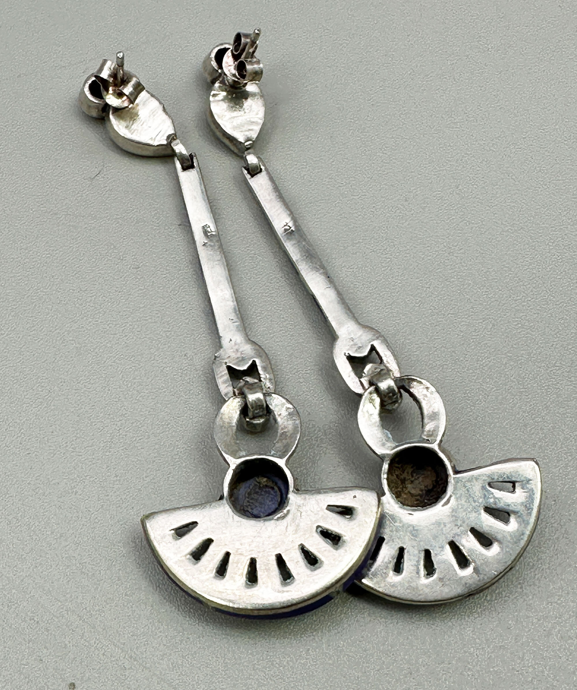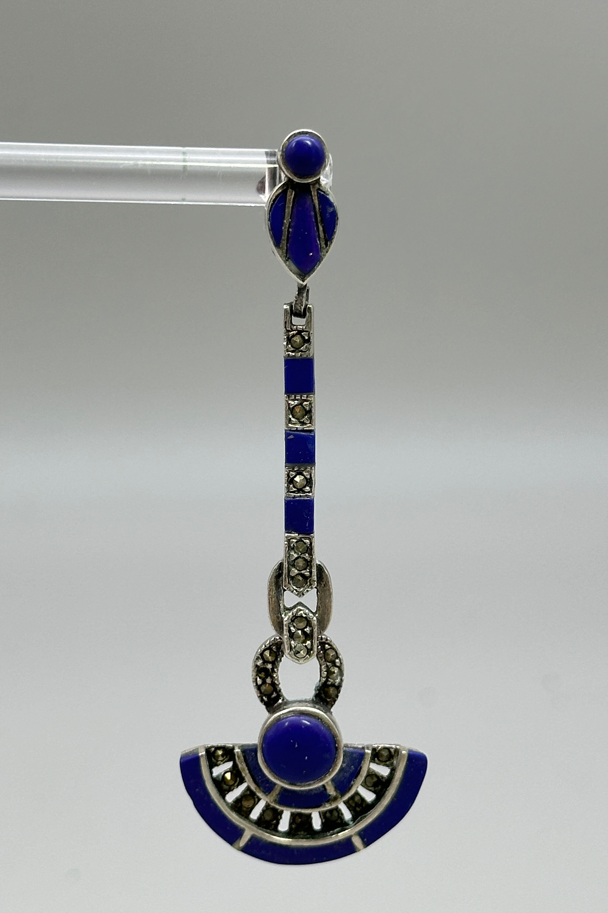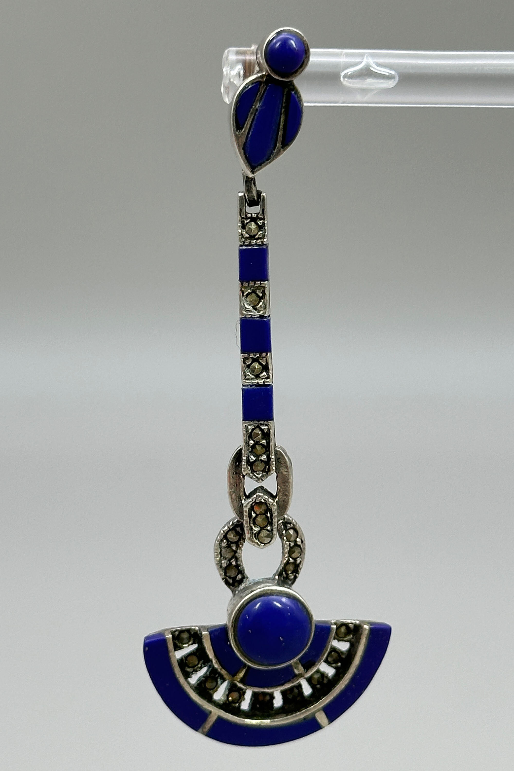 This is a pair of earrings in the Art Deco style. Art Deco designs have always been reproduced as they remain so popular. These are a very high quality example of this. The have an intricate design that is set with lapis and marcasite stones. They are marked 925.| Size: | 67 x 23 mm |