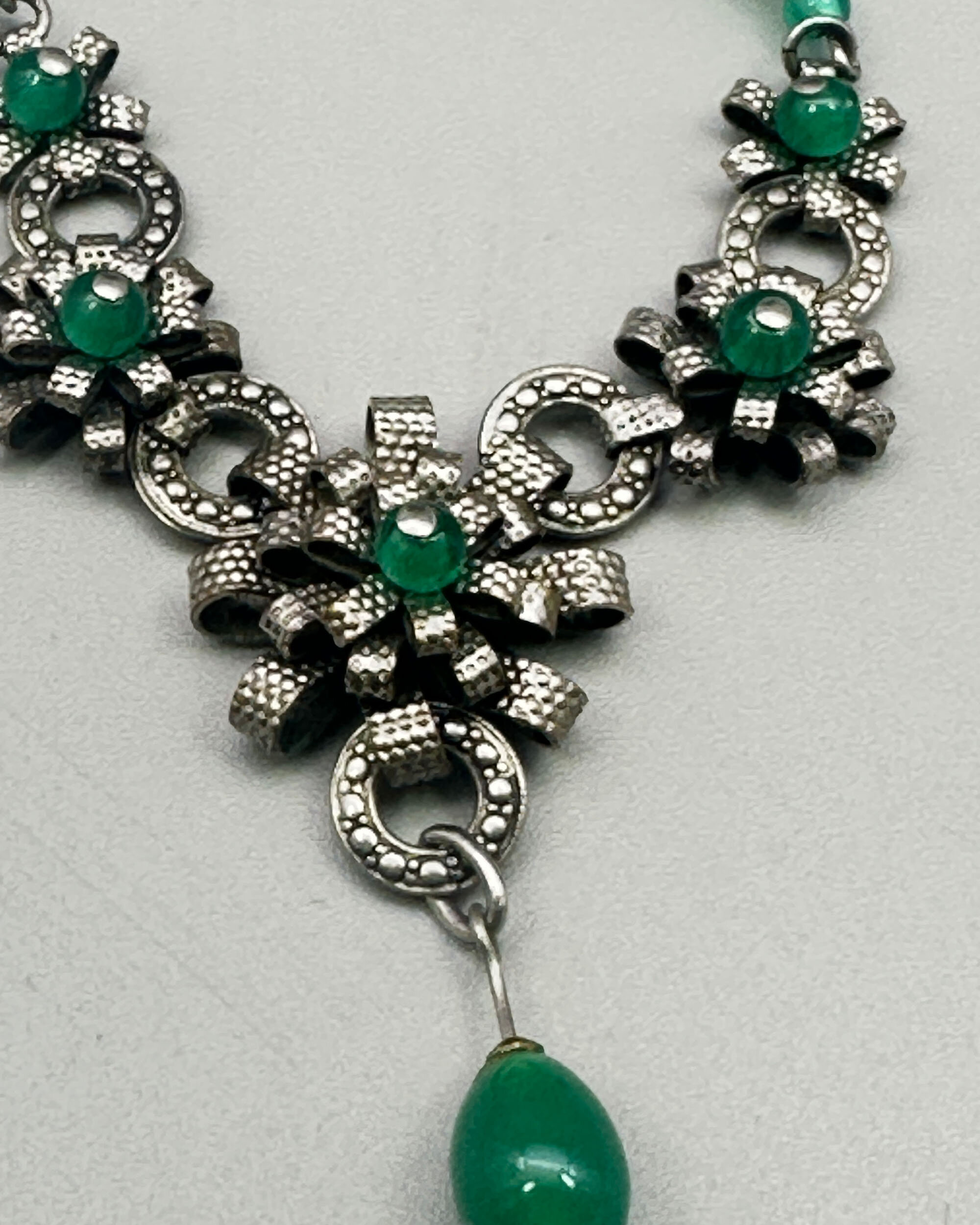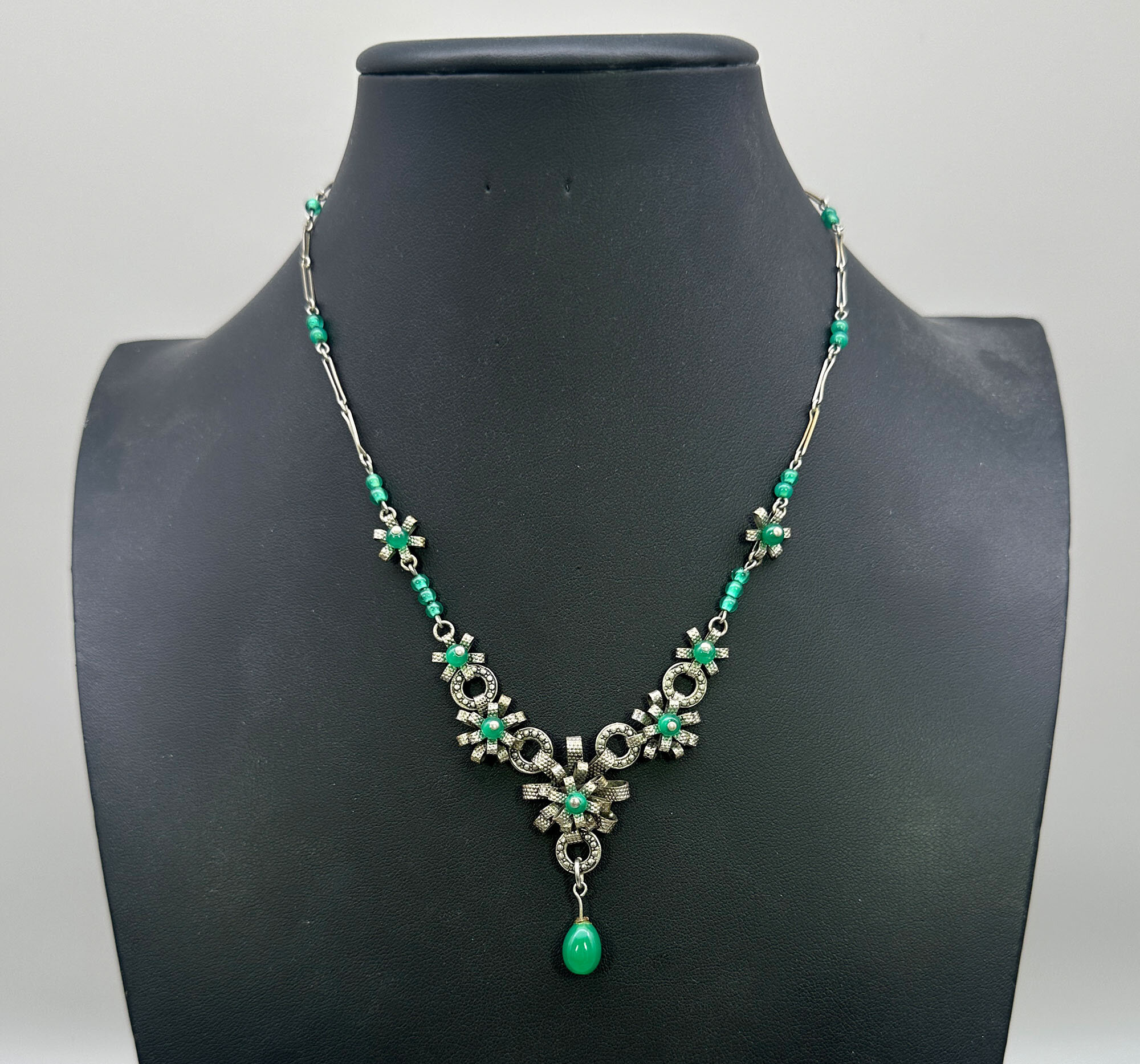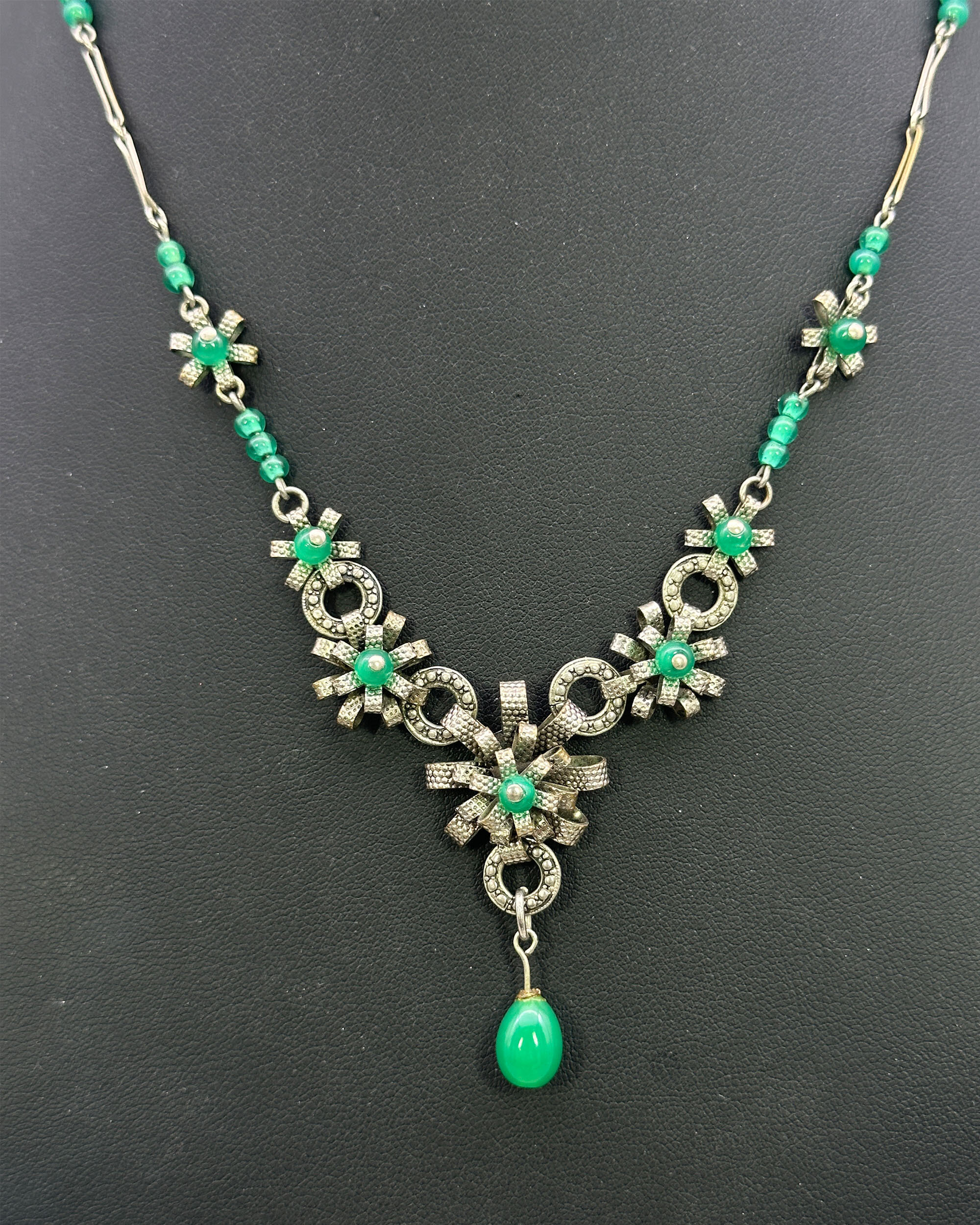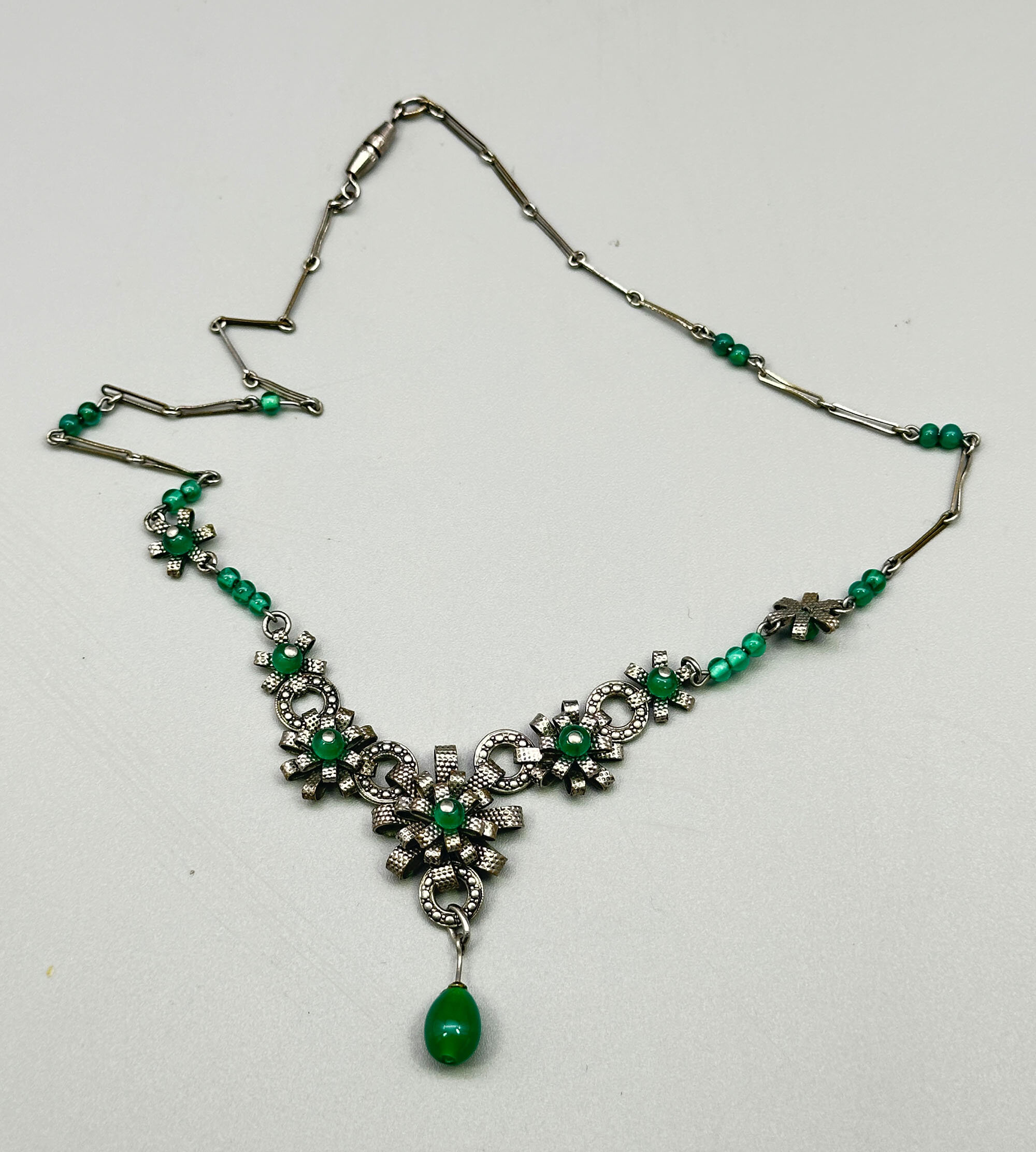 Louis Rousselet was born in 1892 and apprenticed to M.Rousseau at the age of eight, where he learnt the techniques of lampwork beads. He set up a shop in Paris in 1922 and began the manufacture of glass beads and jewellery being joined by his daughter in the 1940s. Rousselet Jewellery became well known and production continued until 1975 when the last trained craftsman retired. Rousselet died in 1980.This necklace comprises three delicately modelled silvered metal stylised flower heads with green glass beads at the centre, joined on either side by further glass beads and flower heads and then a chain with fine metal and glass bead links.