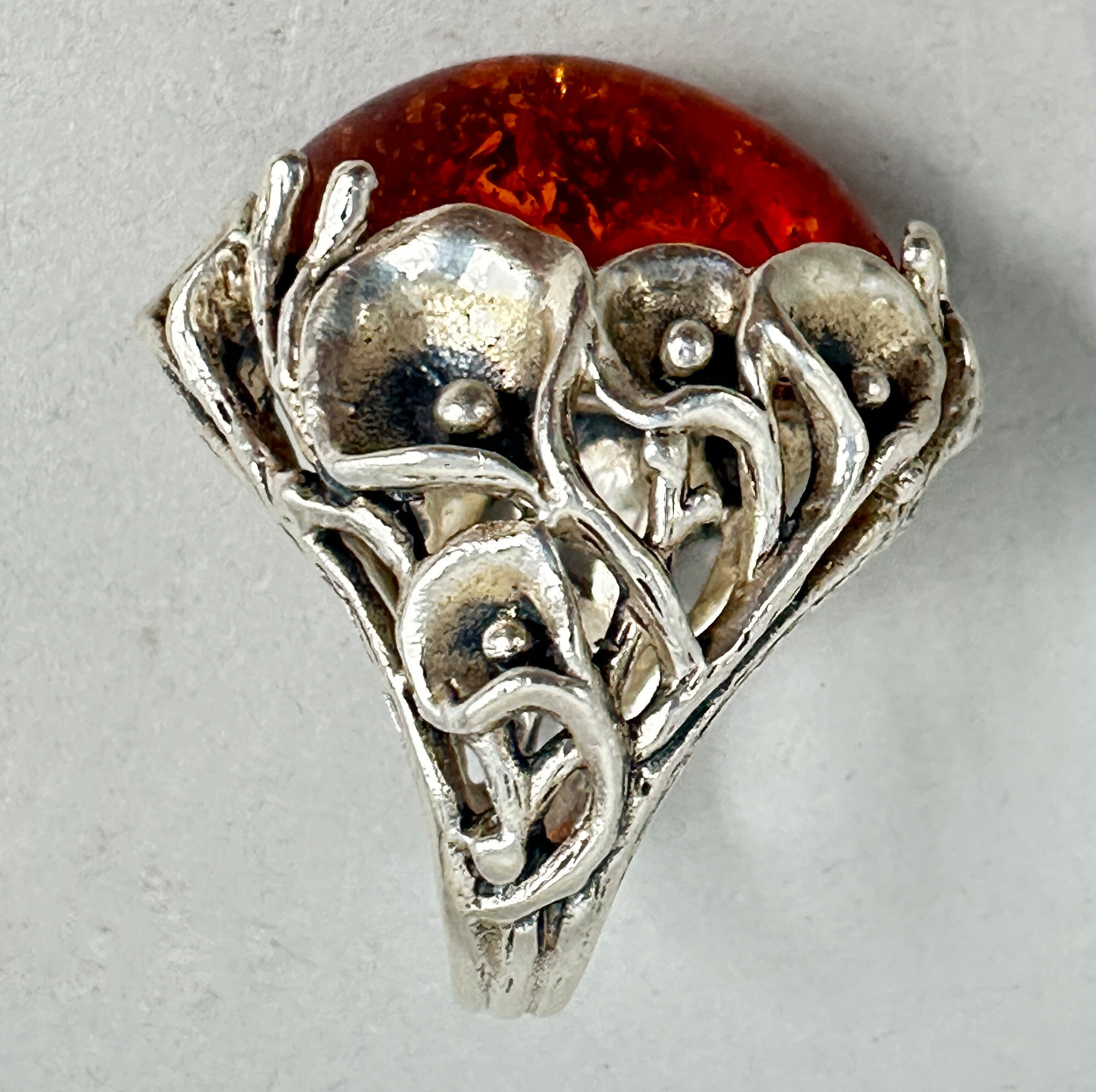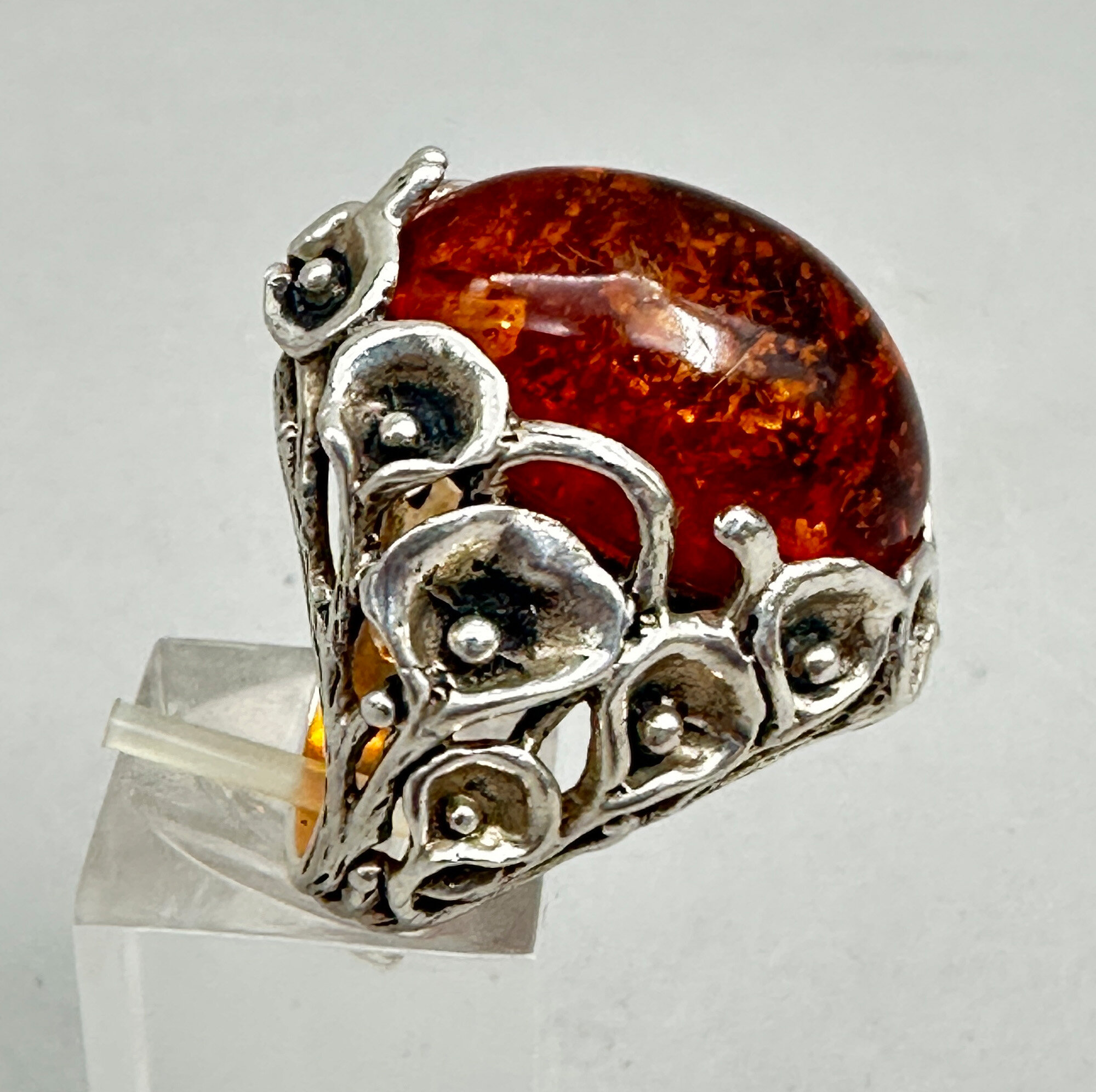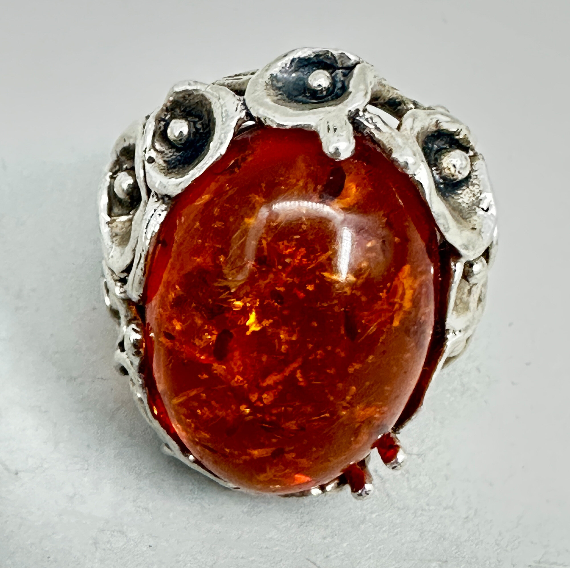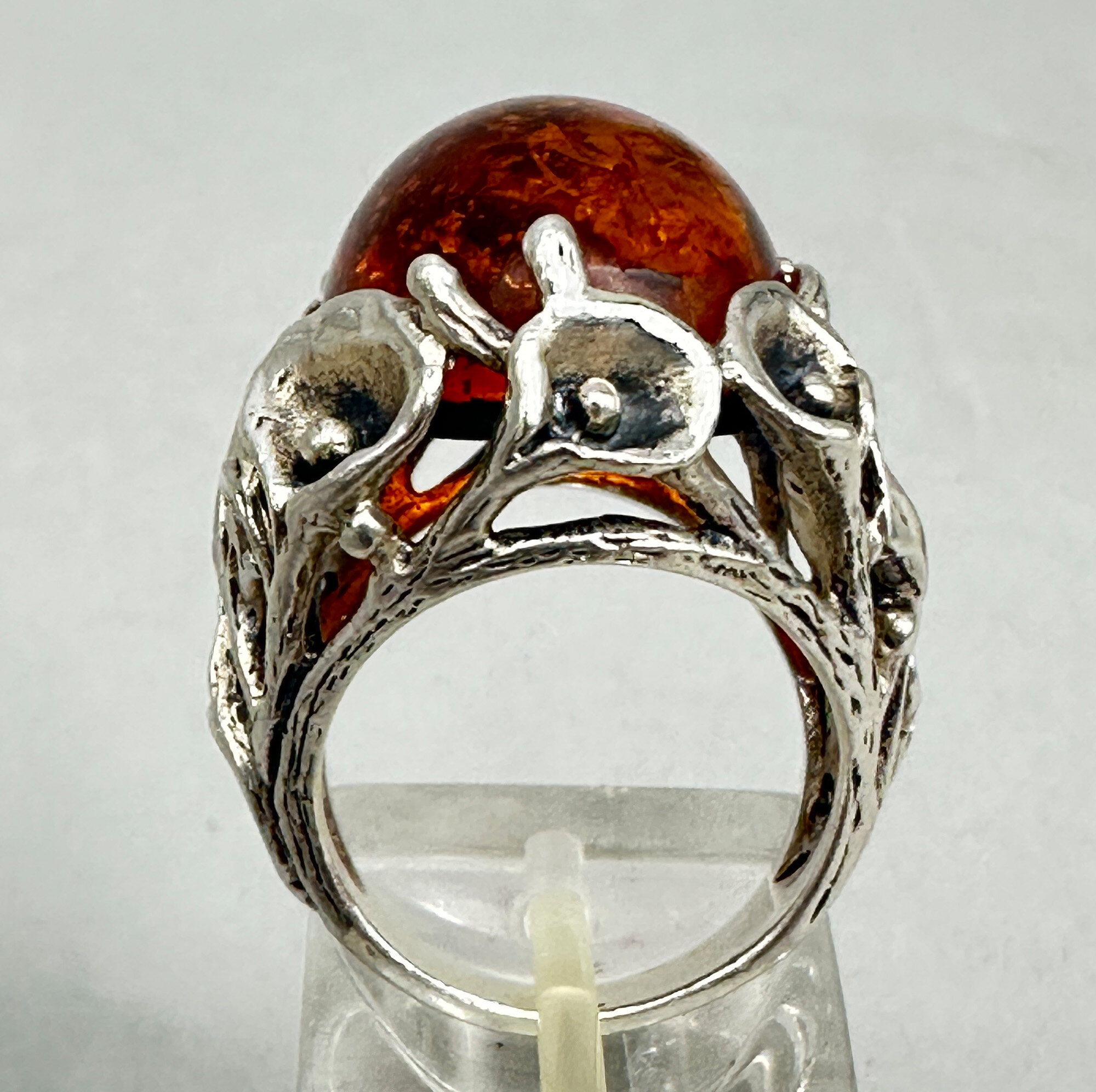 This is a glowing ring with a very large cabachon amber stone. It is set in a very unique way surrounded with silver calla lilys. It is gorgeous and marked 925.| Size: | UK size N, US 7.5, Table 29.5 x 19.2 mm |