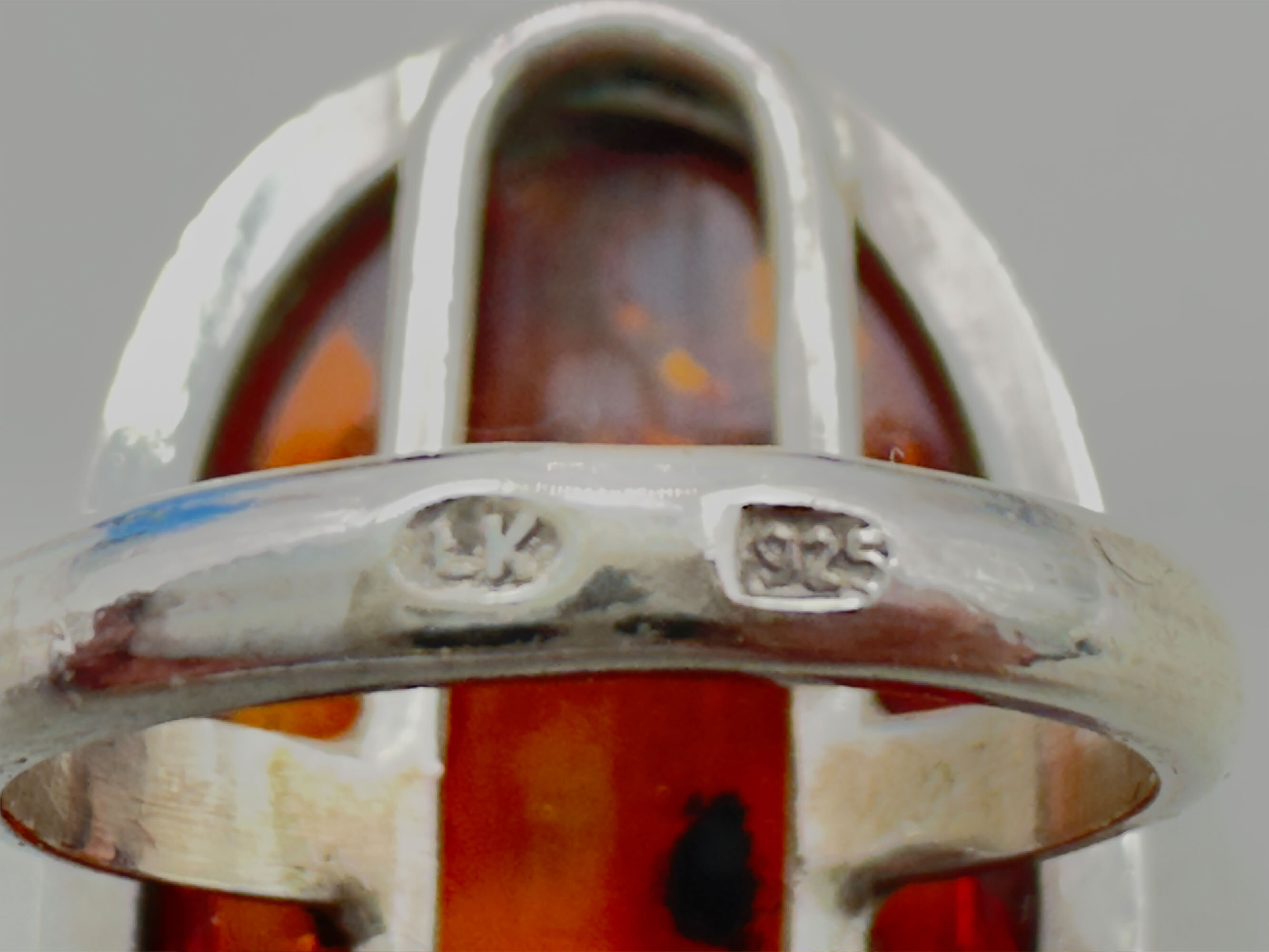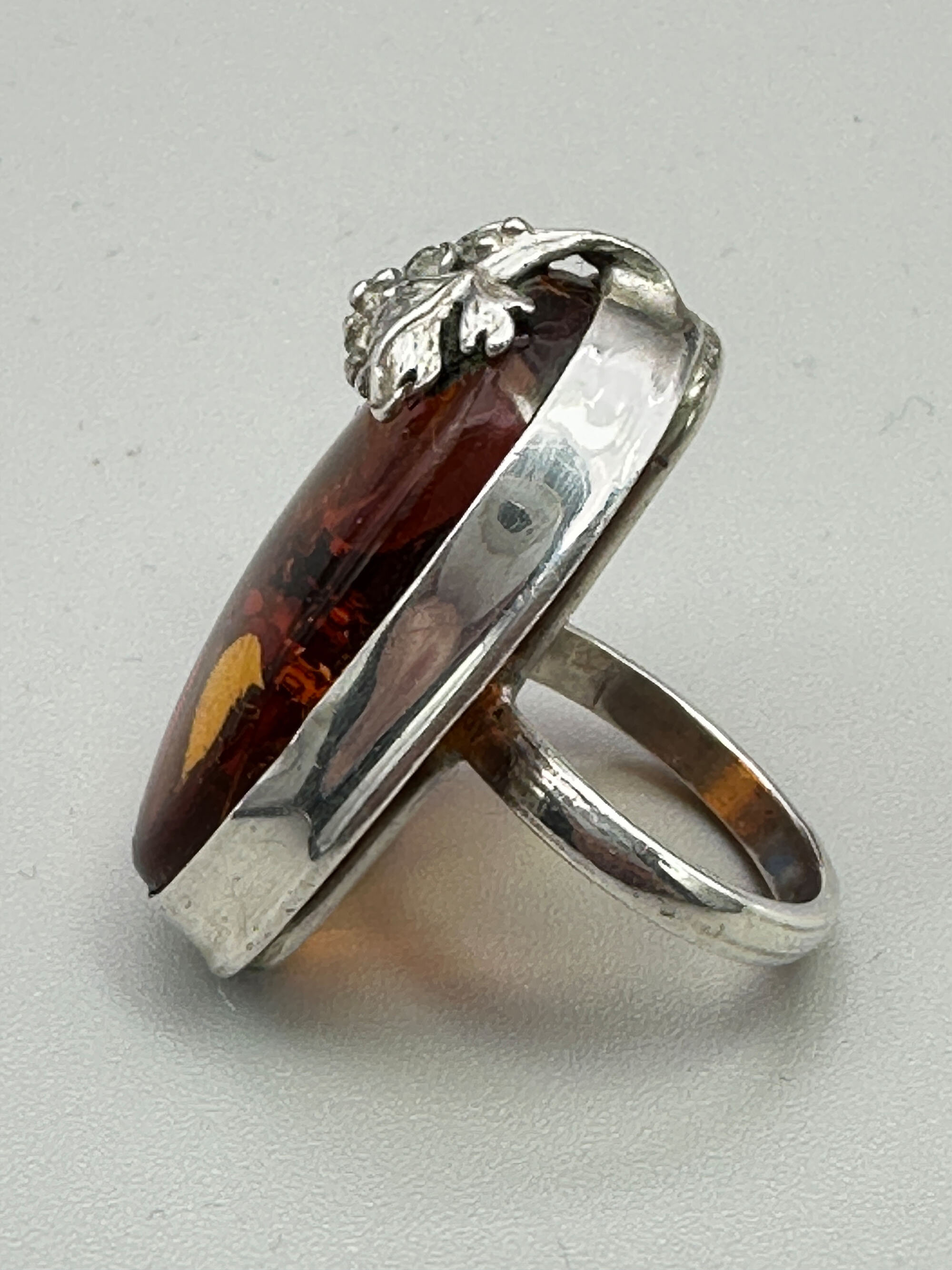 This is a large statement ring set with a very good quality cognac amber stone. It is set wrapped with a grape vine. It is marked LK 925 and is most likely from Scandinavia or Eastern Europe.| Size: | 31.2 x 18.7 mm, UK K US 6 |