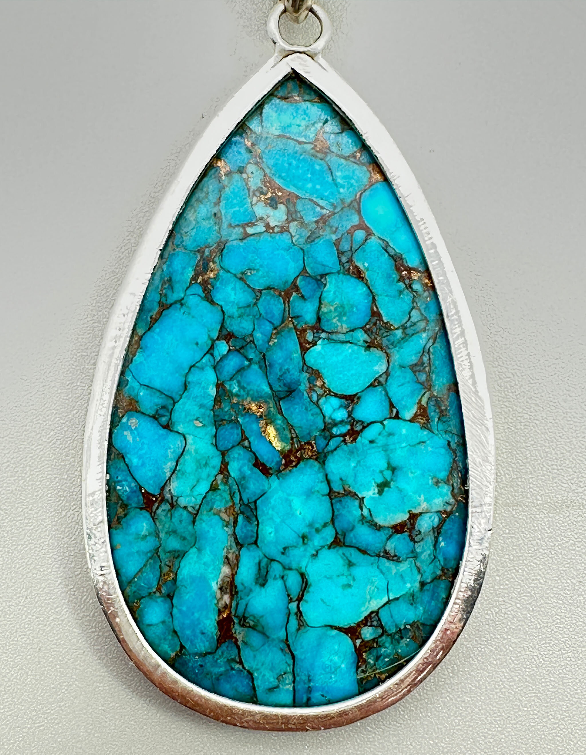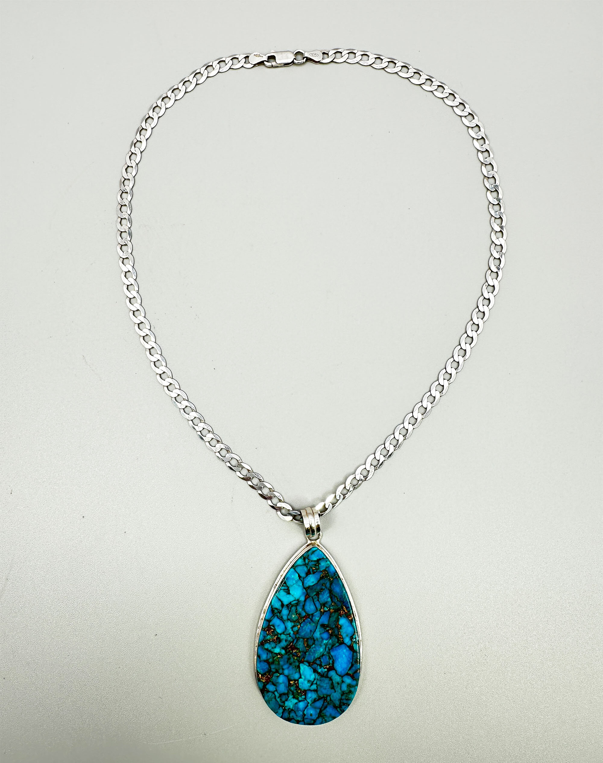 This is a large pear shaped pendant set with a turquoise stone. The stone is an excellent example of copper matrix turquoise form the Kingman mine in Ariizona. This type of turquoise has been treated and stabilized with copper instead of resin to create this dramatic effect. Kingman turquoise is known for this type. It is paired with a complementary flat belcher chain. Both are marked 925.| Size: | Pendant without bail is 57.7 x 35, Necklace is 42 cm long and 5 mm wide |