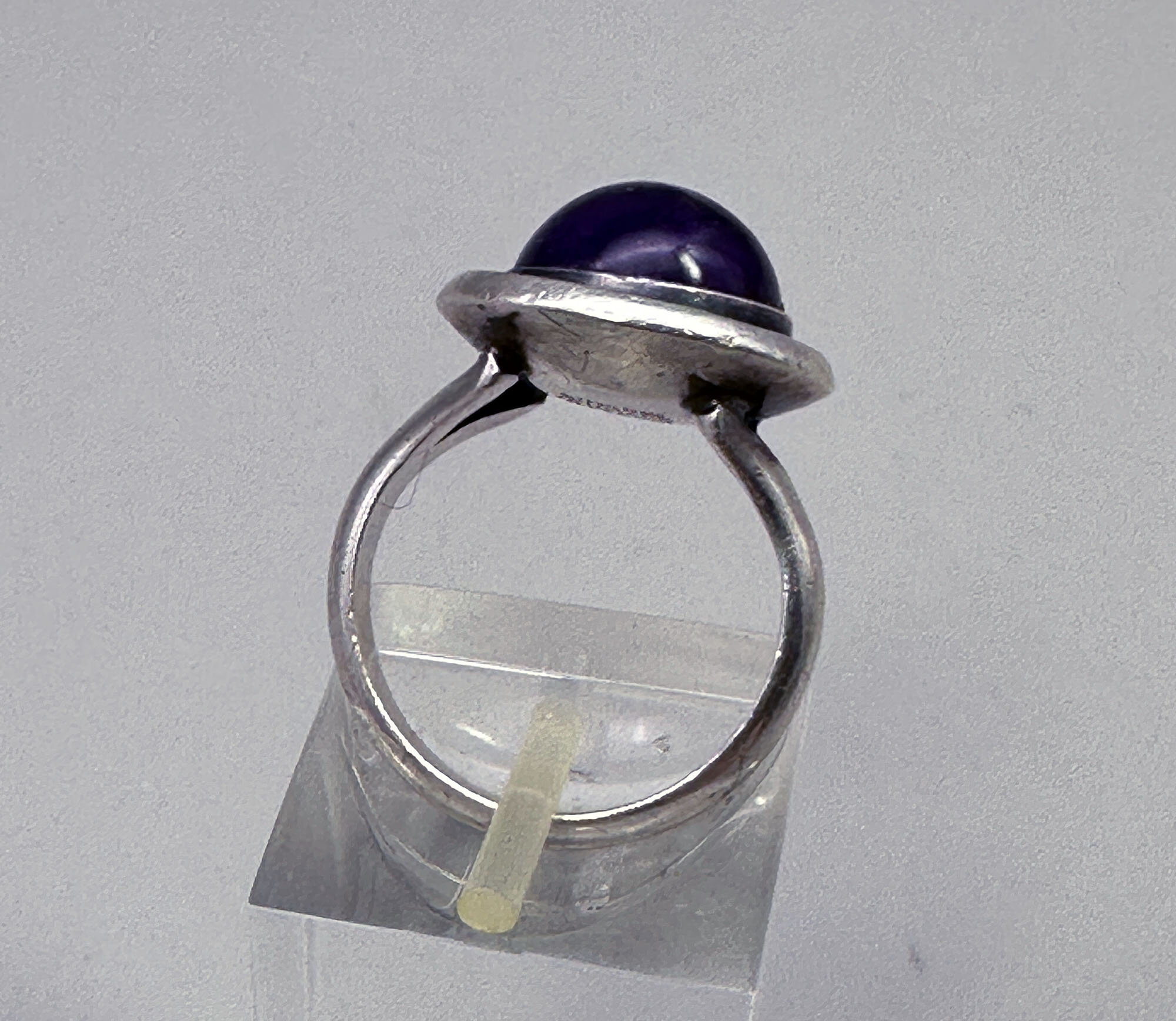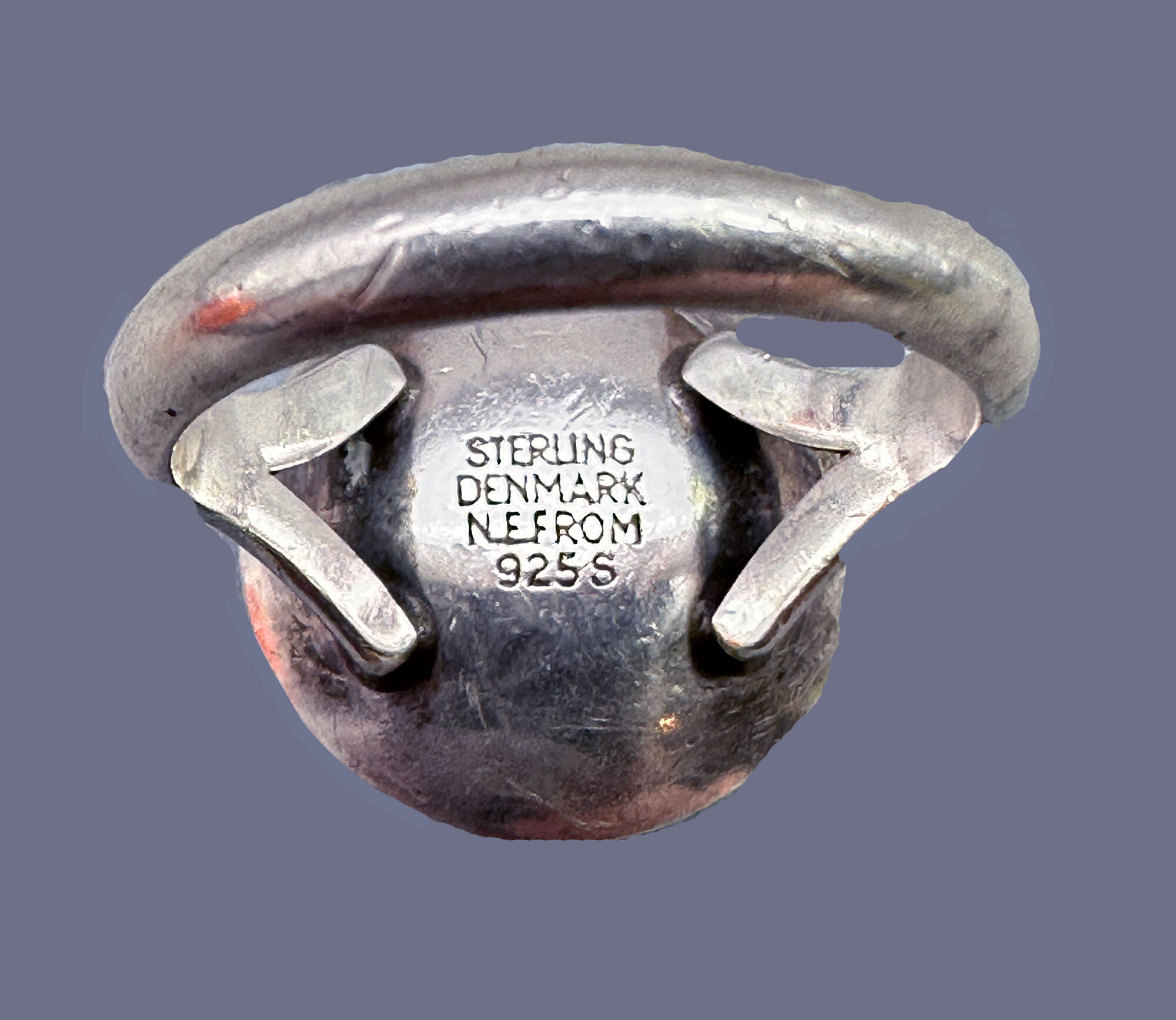 This is a very recognizable design by well known Danish silver maker Niels Erik From (1908-1982) who is was a main player in Danish jewellery between 1940 and 1970. This ring has is set with an amethyst cabachon and is surrounded with an oxidized finish. It is marked Sterling, Denmark N.E. From 925 S| Size: | Table is 15.8 mm in diameter, UK L US 6 |