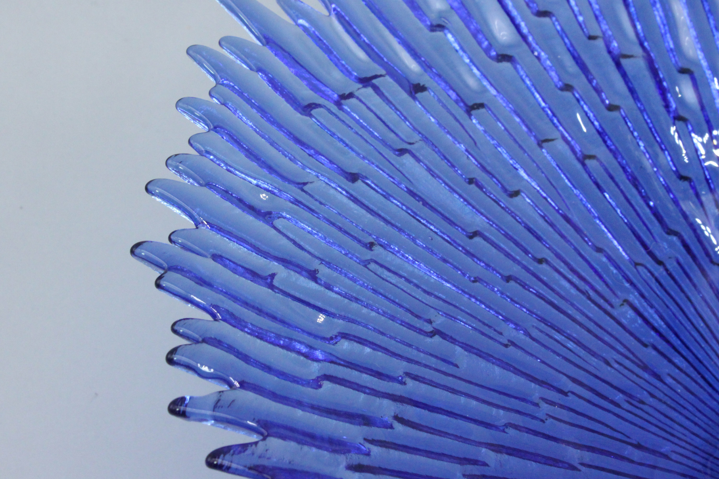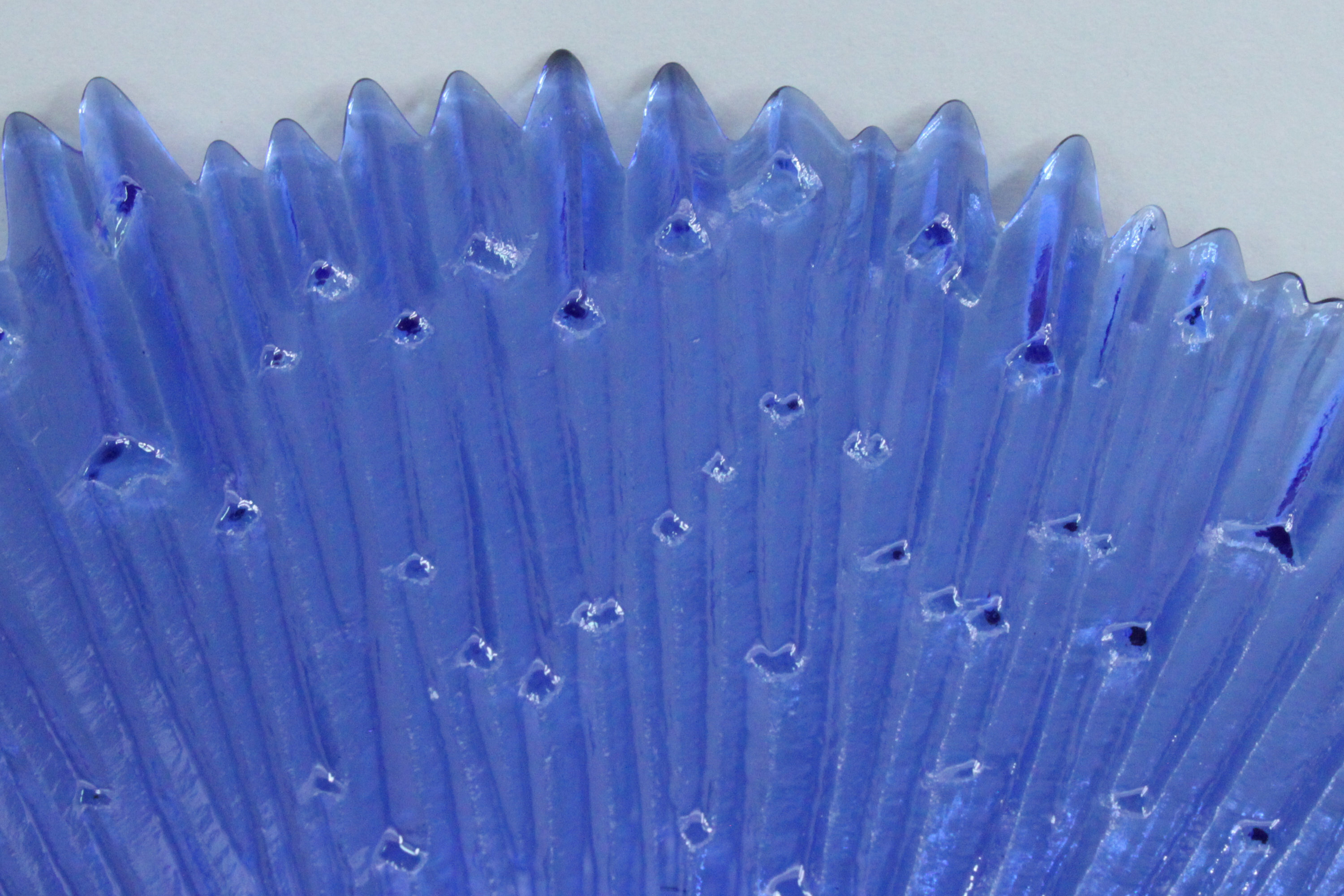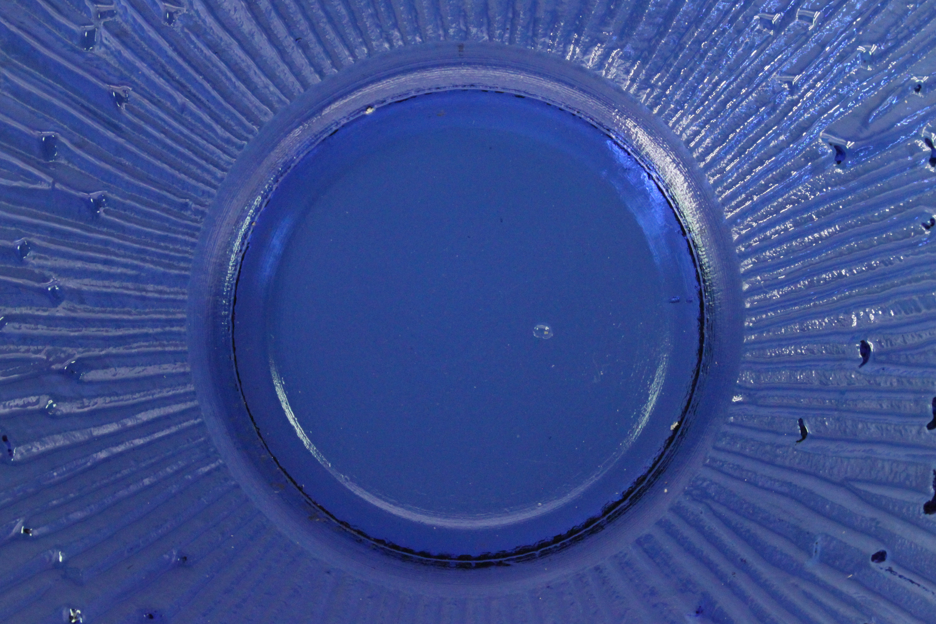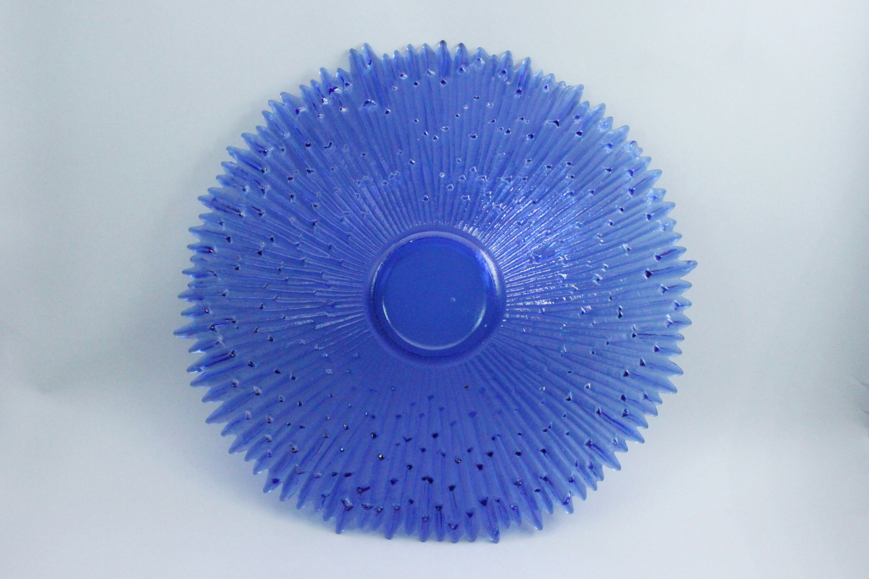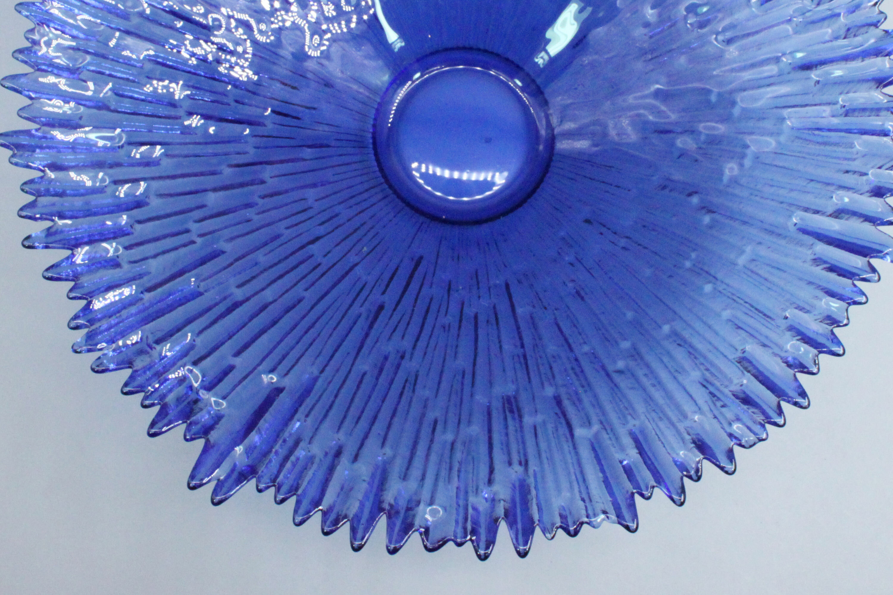 A blue glass Bowl of shallow form with straight flaring sides modelled with repeating icicle like shards with pointed edges, the base flat and with an indented foot. The design here is very much representative of the Art Deco period but was made much later. The manufacturing technique is that of pressed glass in which molten glass is pressed into a mould with a plunger. This was the most common way to produce inexpensive glass from the middle of the 19th century onwards and enjoyed a great vogue in England in the 1920s and 1930s. But this piece is much later and was designed by Tauno Wirkalla for the Finnish glassworks Humppila probably in the 1960s or 1970s.Tauno Wirkalla was the brother of the celebrated Finnish designer Tappio Wirkalla and like him favoured an ‘ice glass’ effect in his designs. He was one of the designers for the Humpilla Glassworks in Finland which was founded by the Helander brothers in 1952 and was then subject to various takeovers, finally being acquired by the firm Nuutajarvi (for whom the Helander brothers had originally worked) in 1986. Wirkalla produced many ‘ice glass’ designs for Humppila, some of which are signed and some still surviving with their factory labels, which is not the case here. This bowl is of an exceptionally large size and has miraculously survived undamaged with all its pointed edges intact. A truly distinctive centrepiece recreating the style of an earlier era.