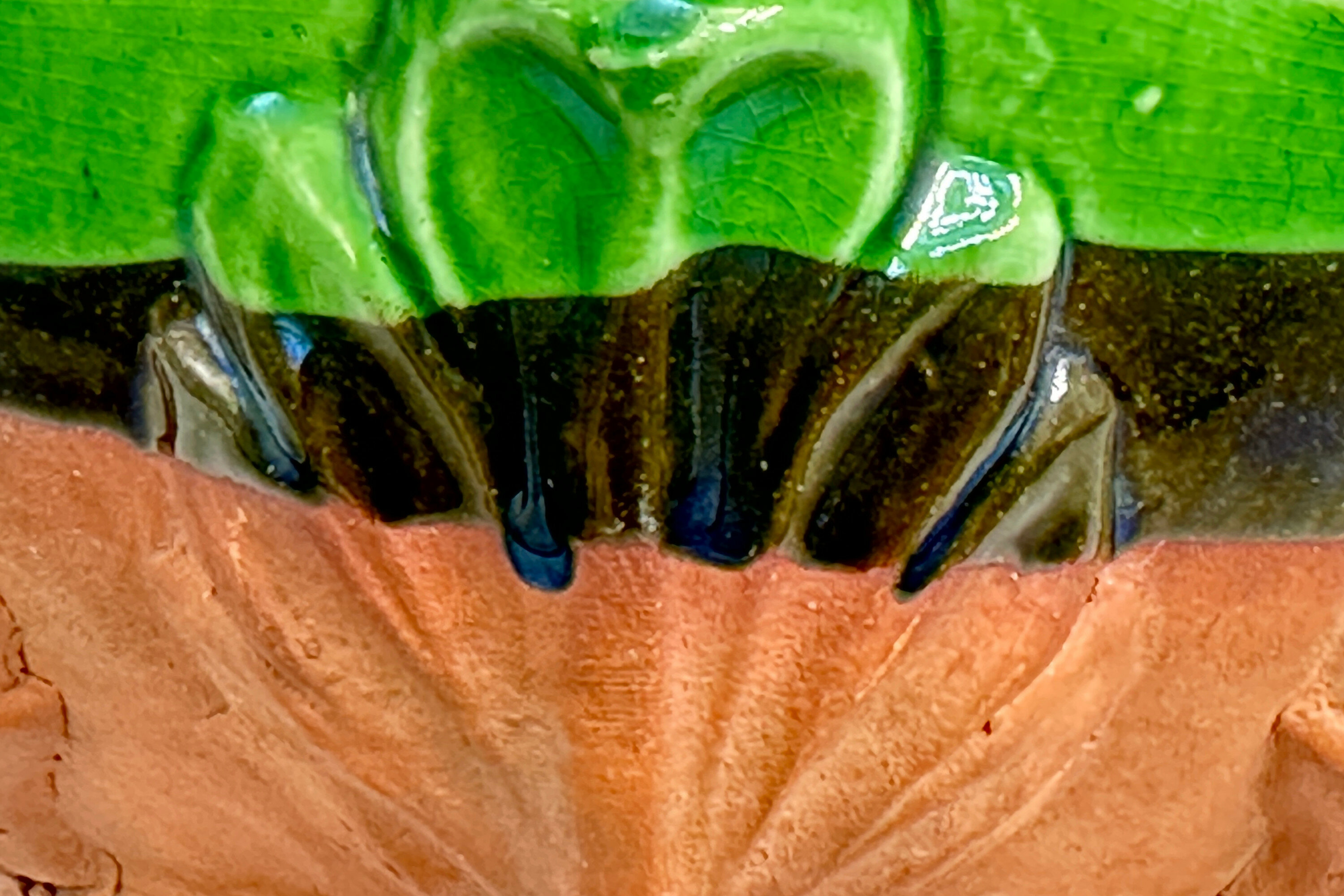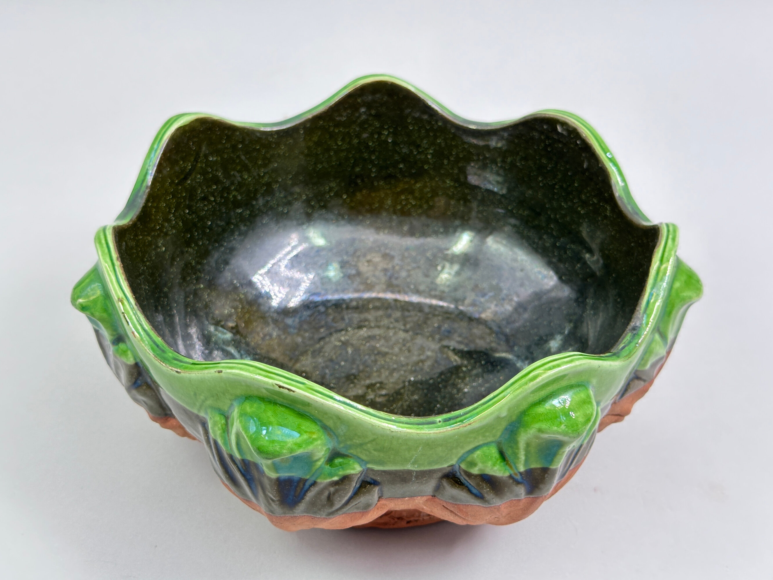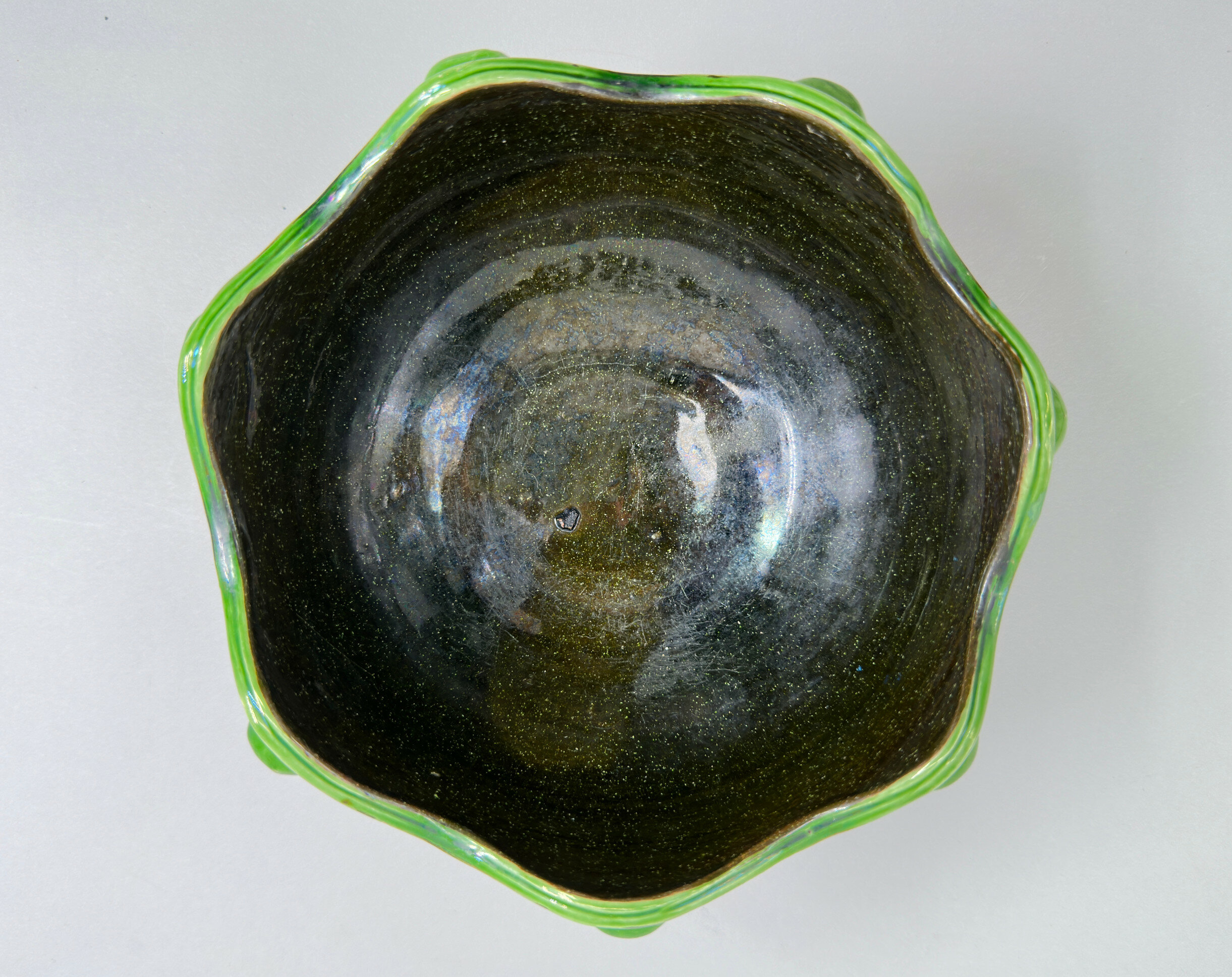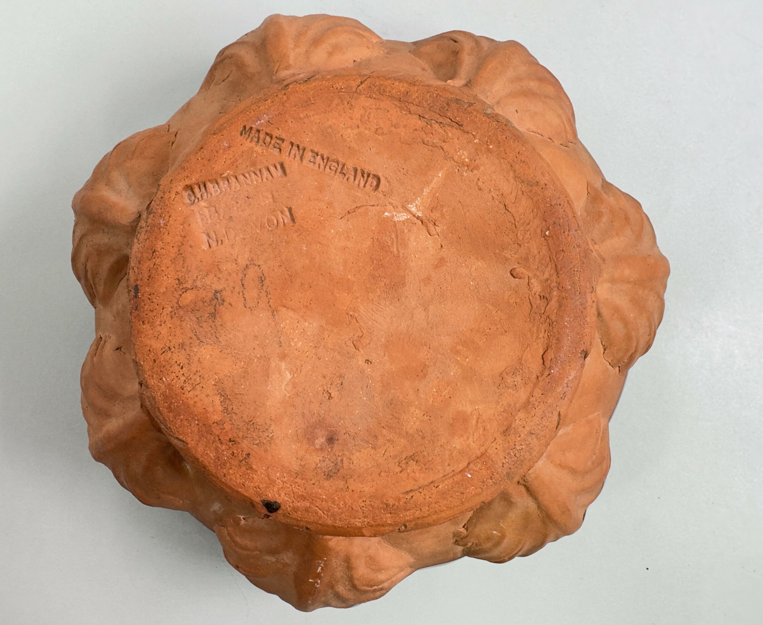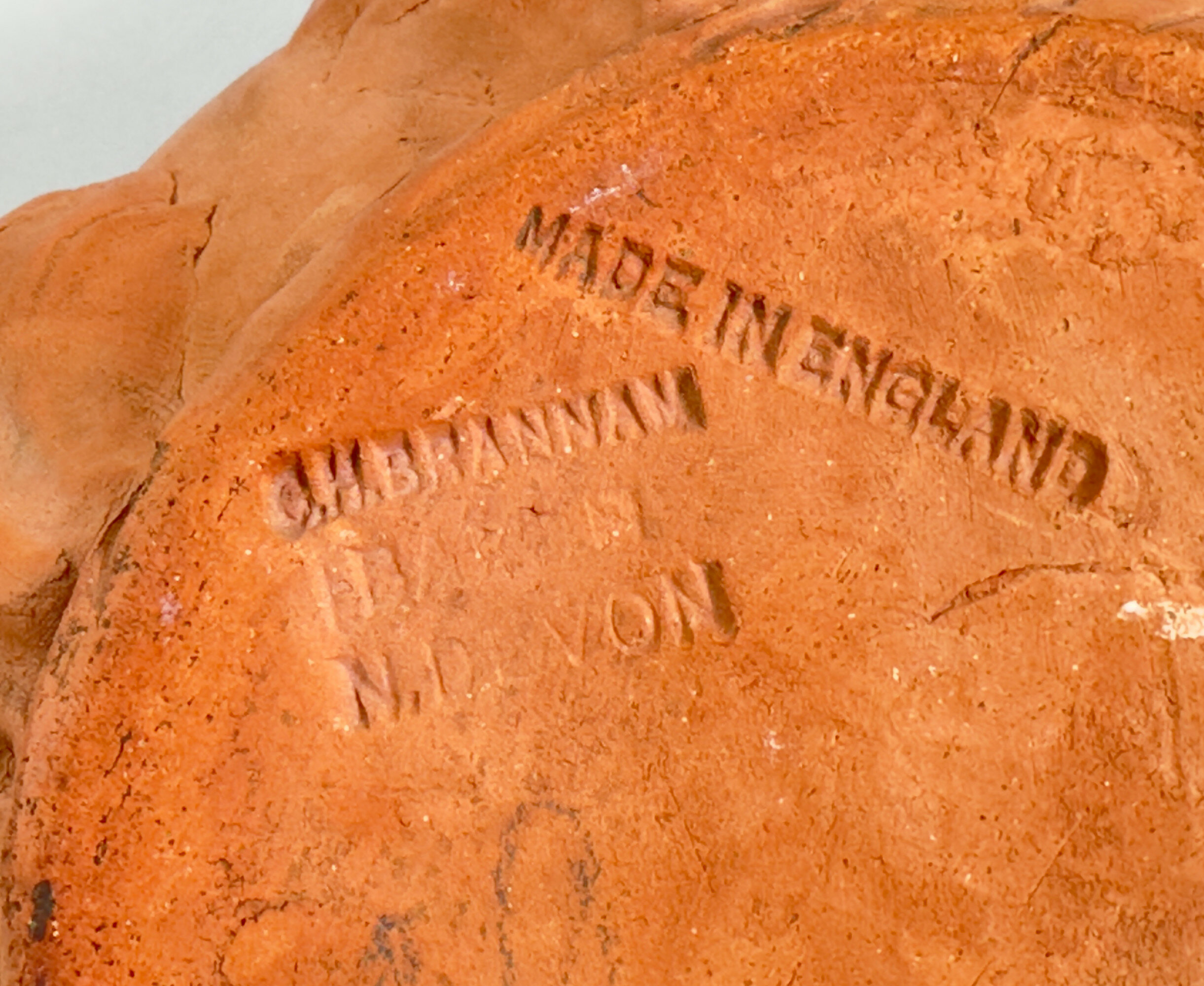 A rustic bowl with a wavy edge rim and moulded shells to the sides, terracotta with green and black 'tea dust' glazes, the foot coardely modelled and with stamped marks 'Made in England' 'C.H.Brannam' 'Barum' 'N.Devon'. Brannam Pottery was a British pottery started by Thomas Backway Brannam in Barnstaple, Devon, England, in 1848. Ownership passed through the family, Thomas' son Charles Hubert joining the firm aged 12 in 1867 and passing on direction of the business himself to his sons in 1913. It later became part of the "rustic" wing of the art pottery movement, mainly owing to efforts of Charles Hubert who began producing his own distinctive wares in 1879 and registering the name 'Royal Barum Ware' in 1886 after receiving an order from Queen Victoria in 1885. The pieces were widely sold including at Liberty in London. Many pieces were produced in terracotta, sometimes with additional glaze effects but the form and decoration of this bowl is unusual combining the marine motifs with interesting glaze effects offset by the terracotta base. Perhaps it is not too fanciful to see the work of Charles Hubert himself here. Certainly, great care was taken with the production of this piece and the style and mark suggest a dating to around 1900.| Size: | Ht 8cm (max), Width 18cm (max), Base Diam 10.5cm |