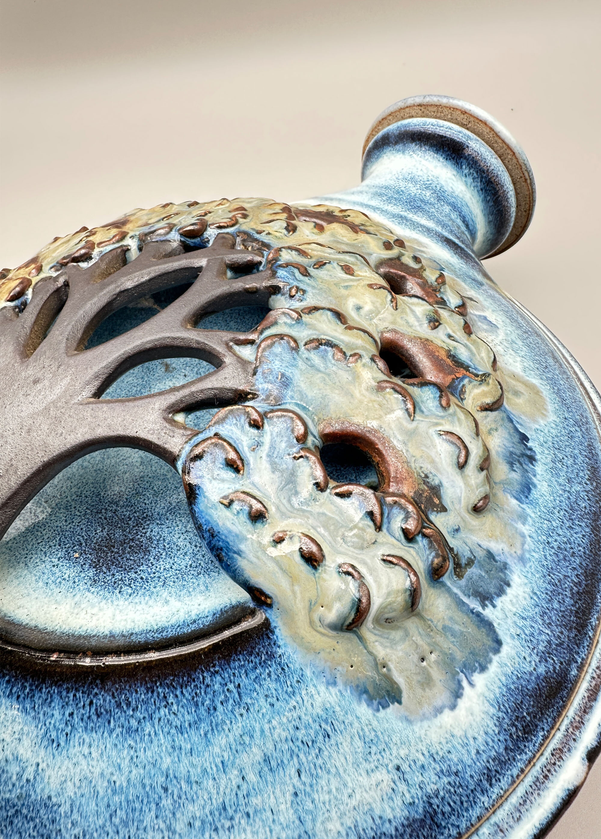 A stoneware ceramic wall flagon or vase, the body circular and glazed to the front and the top of the back in a mottled blue, the centre with a polychrome raised and modelled design of a tree, the base with a circular tap and cork spigot, the top with a circular screw thread cover and knob finial, the back unglazed with a textured effect, with two ridged loop handles for hanging (fitted with the original cord) and an impressed circular mark ‘SE’ along with the price tag (£110.00) and the address of the Shepherd’s Well Pottery.Simon Eeles was one of the two sons of David and Patricia Eeles who started the studio Shepherd’s Well Pottery in Hampstead, London in 1955, moving to Mosterton, Beaminster, Dorset in 1962, see ‘British Studio Potters’ Marks’ by Eric Yates-Owen and Robert Fournier (2nd edition 2005 p152). Simon began working with his parents in 1979 and was to soon specialise in stoneware although in later years he took an interest in the Japanese ‘raku’ type glazes for which he gives demonstration classes today. His earlier stoneware pieces seem to have focused on decorative utility items and do not appear to be commonly available now. Priced in the 1980s/1990s at £110 this wall flagon was clearly something of a demonstration piece at the time and remains so today.