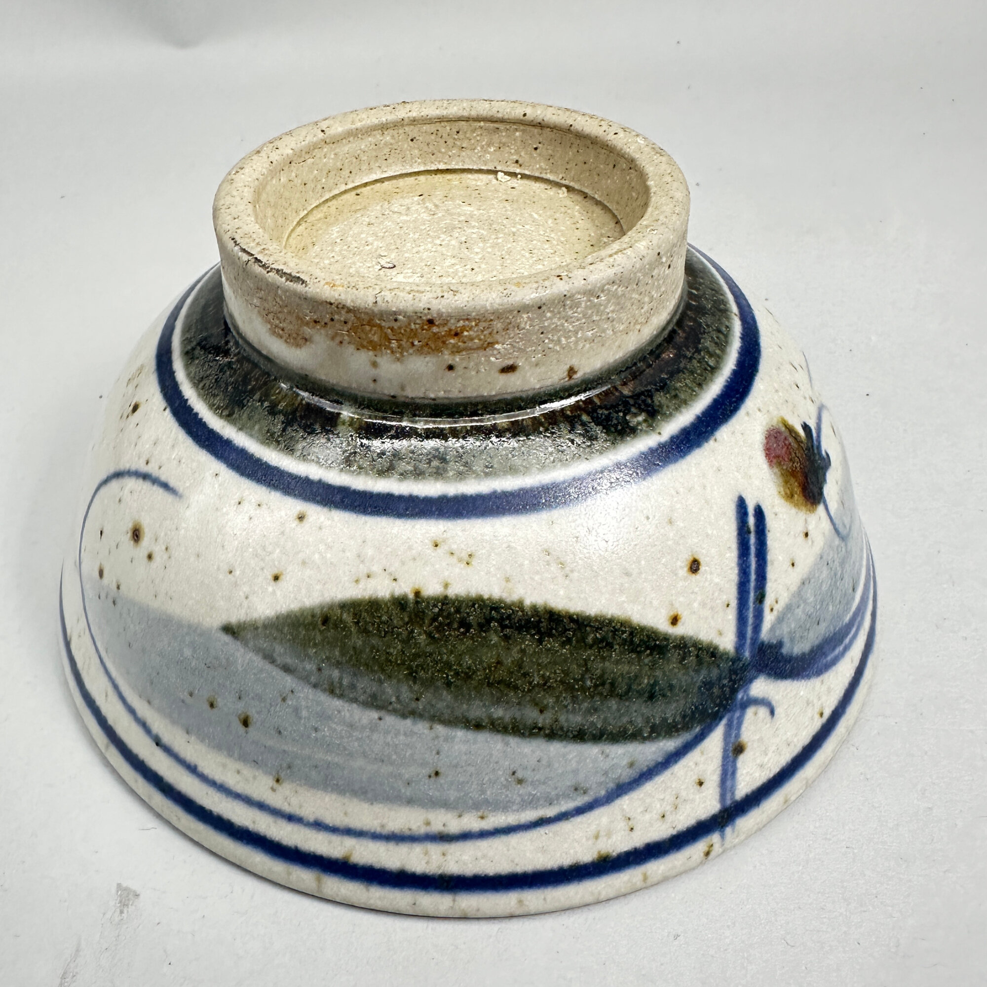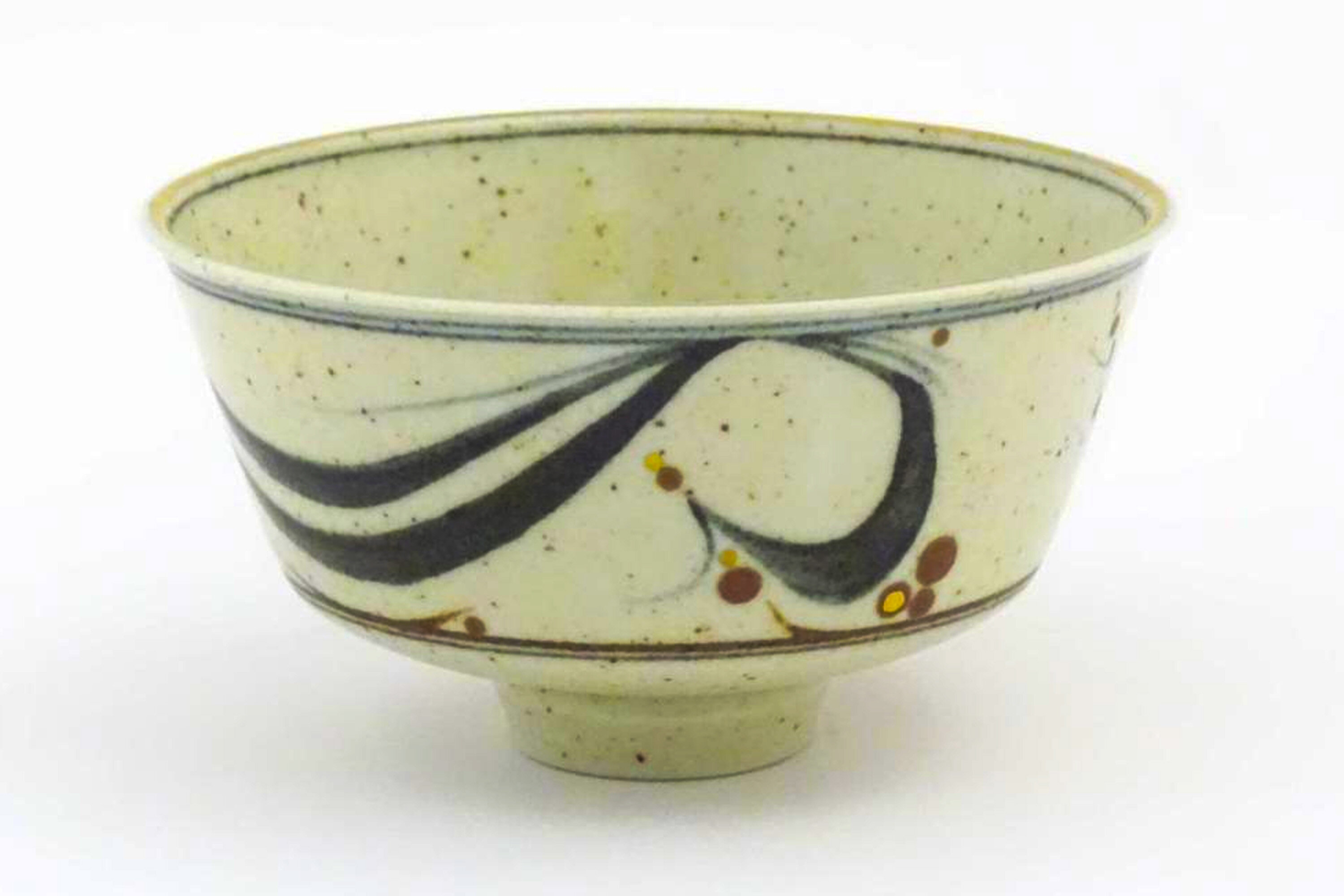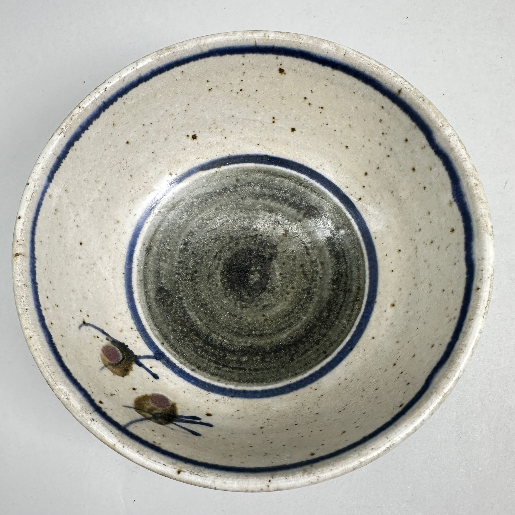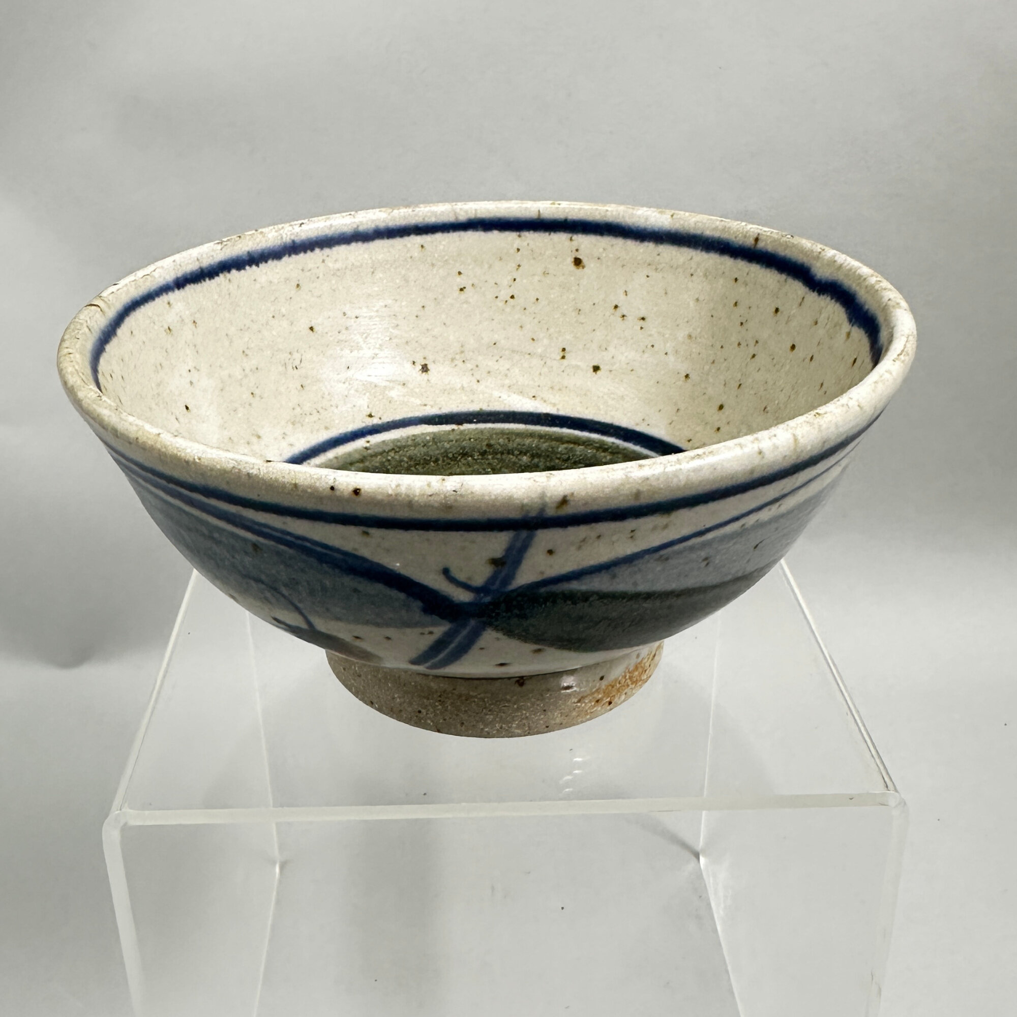 This is an elegant studio pottery bowl, the deep incurving sides above a short cylindrical foot, covered overall in an off white speckled glaze with decoration in blue, dark ‘copper’ red and grey, the exterior with leaves and berries sprouting from a branch and blue circles with a grey border, the interior with in blue, the interior with two blue circles, two berries and a grey roundel at the centre, the base with a small impressed mark.While it is not absolutely certain the mark on this piece is possibly that of Derek Clarkson (1928-2013). Clarkson trained at the Manchester college of Art between 1944-47 and Burnley School of Art from 1959-61 and then combined a successful lecturing career with the making of his own work which is now to be found in international and private collections including the Victoria and Albert Museum, London. In 1980 he retired from lecturing to focus on his work as a potter, continuing to produce pieces of great skill and attraction until his death in 2013. There are other pieces signed by him which strongly resemble the bowl here (see images 8,9) making it a possibility that this is his work. Certainly, the potter who created this piece and impressed his mark at the bottom was clearly accomplished and this bowl is more than worthy to stand comparison with pieces by more famous contemporaries.