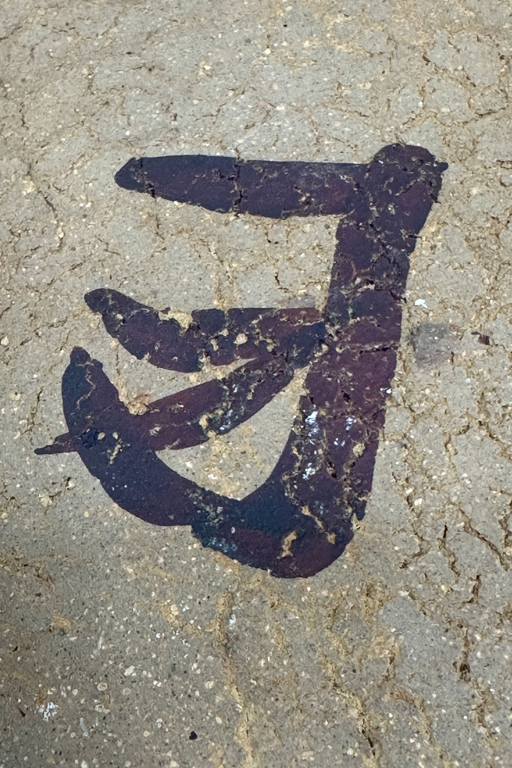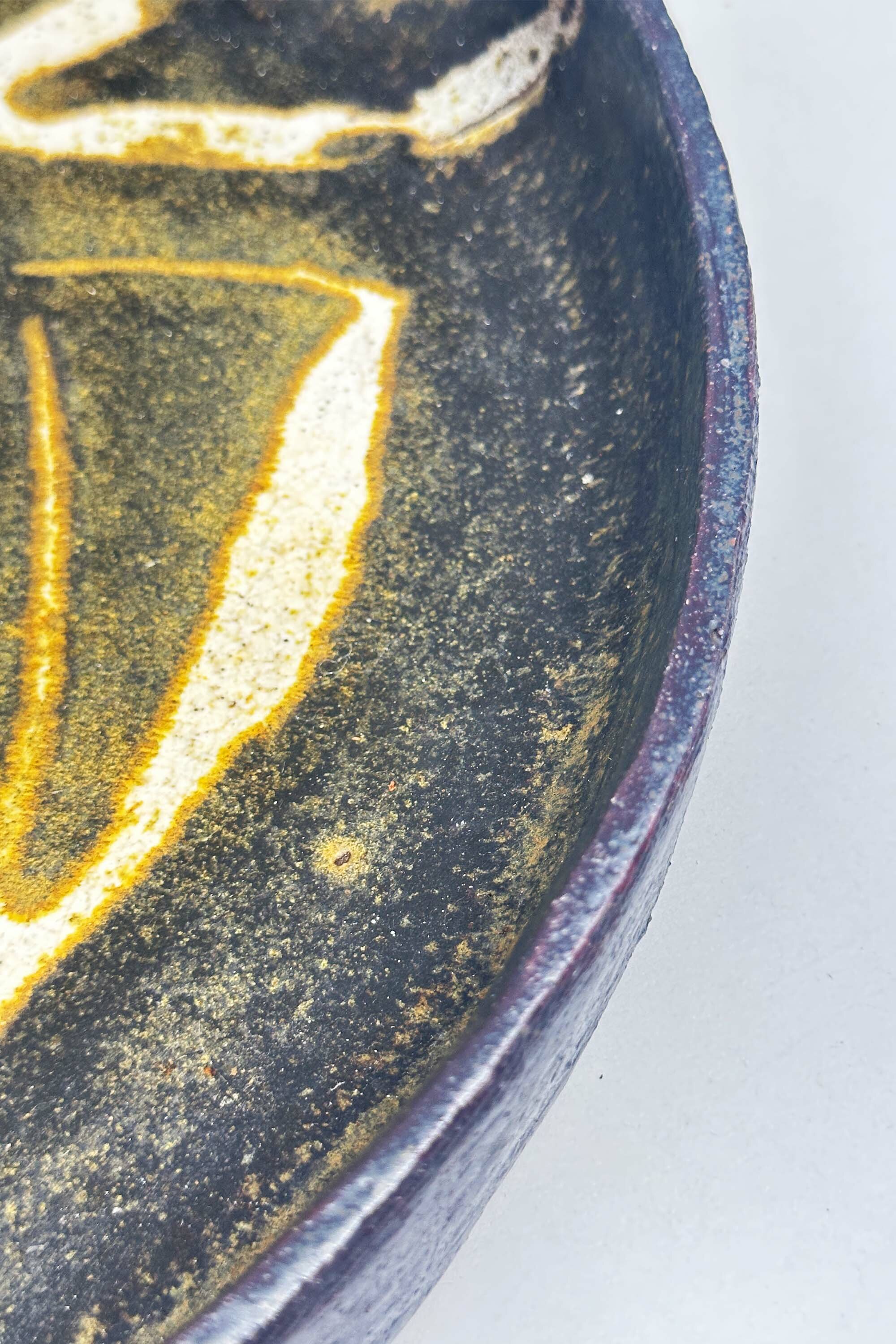 A large studio pottery charger or shallow dish of uneven circular form, the side raised at the edge forming a well defined wall, the front surface with a black and ochre speckled ‘tenmoku’ style glaze liberally decorated with abstract shapes in off white with ochre outlines, the reverse unglazed and with a boldly painted signature mark. Various influences can be seen here, for example Michael Cardew and perhaps rather more distantly Shoji Hamada, but neither the maker nor the mark used can at present be identified. But this is clearly the work of an accomplished artist offering an individual interpretation of classic glaze effects.| Size: | Ht 4.5cm, Diam 36cm -37cm, Base 36cm - 35cm |