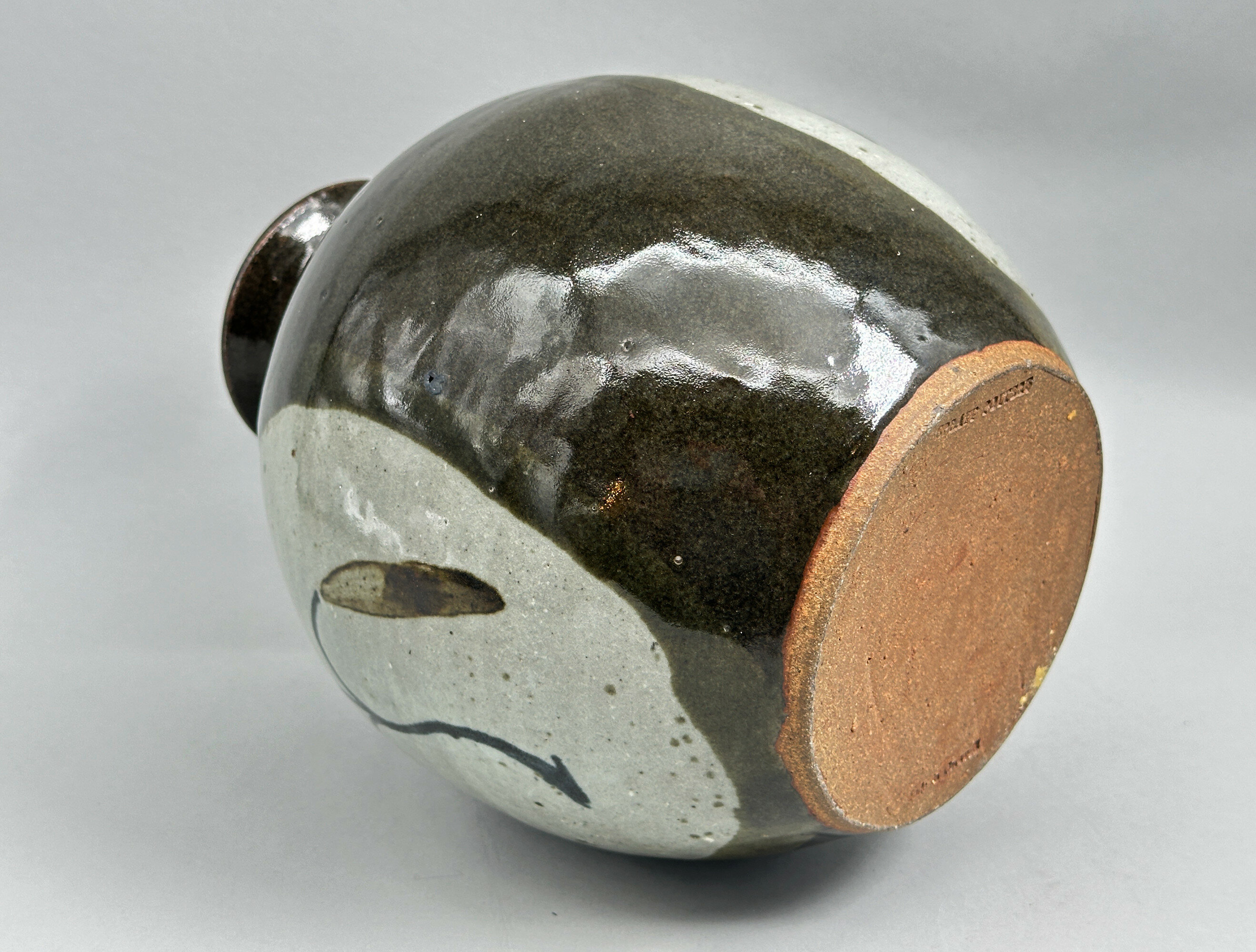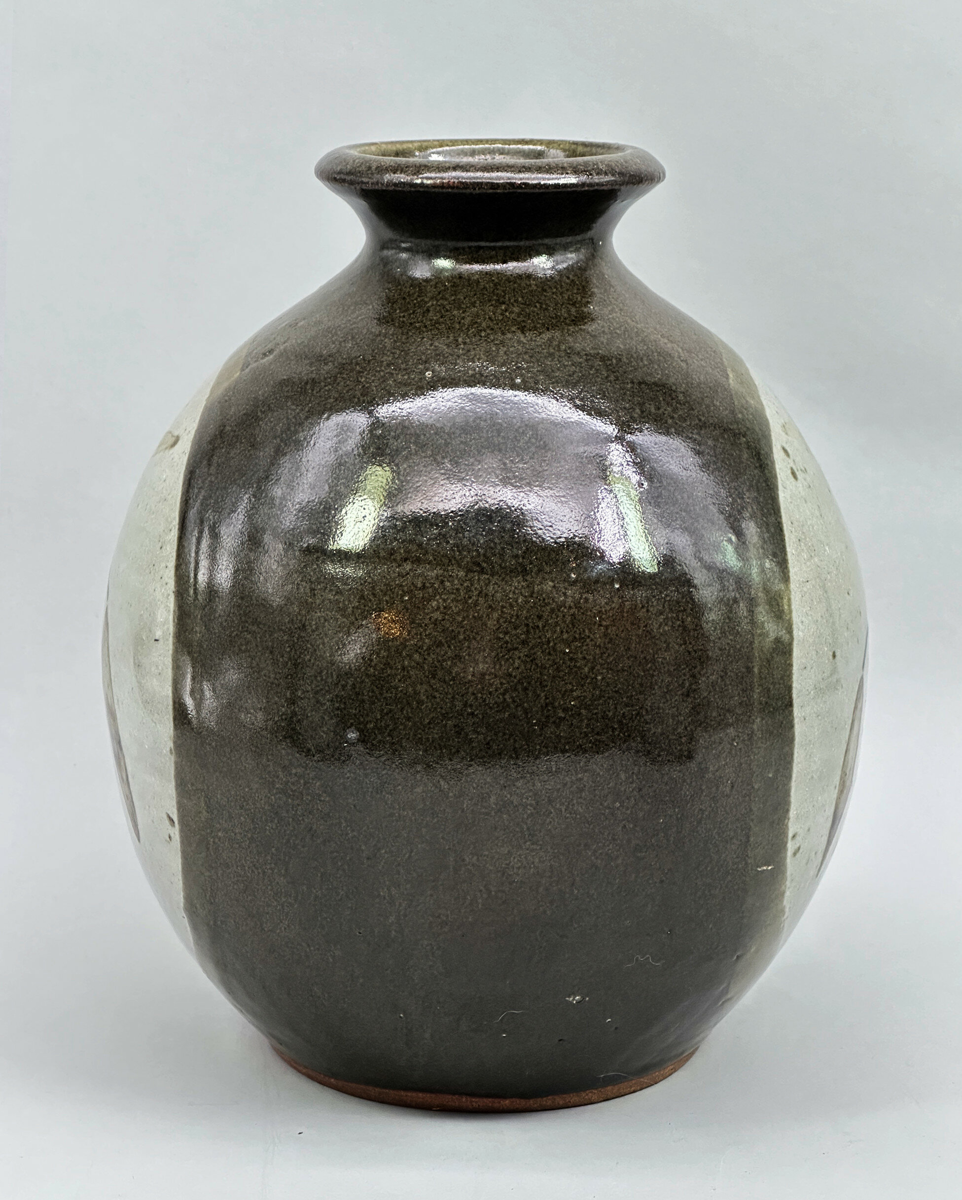 A studio pottery vase stoutly potted and of ovoid globular form with a short neck and flaring rim, the mottled brown glaze with two identical circular panels at the front and reverse with an abstract flowering plant on a light grey mottled ground, the base unglazed with impressed marks ‘SPLATT POTTERY’ ‘MADE IN CORNWALL’. In general, the term ‘splatt’ refers to a pottery technique where paint is applied randomly by splattering or flicking it onto the body of the piece, but it was adopted by Alexander Kennedy as the name of his pottery studio based at Splatt, Tresmeer, Launceston, Cornwall where he worked during the 1990s. His pots were pleasing to the eye, often with a slightly rustic appearance and they are clearly marked, as here. Kennedy’s technique was assured and this vase can well stand comparison with the productions of the rather better known studio potters making it an attractive ‘entry level’ acquisition for those interested in the genre.| Size: | H 24 cm W 20 cm |