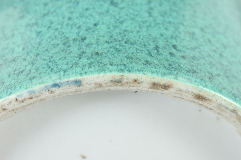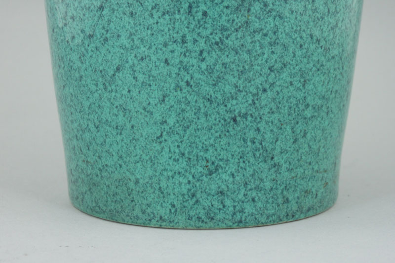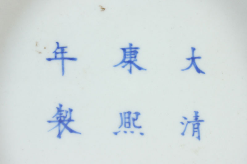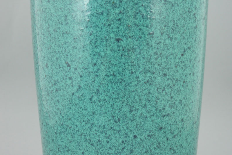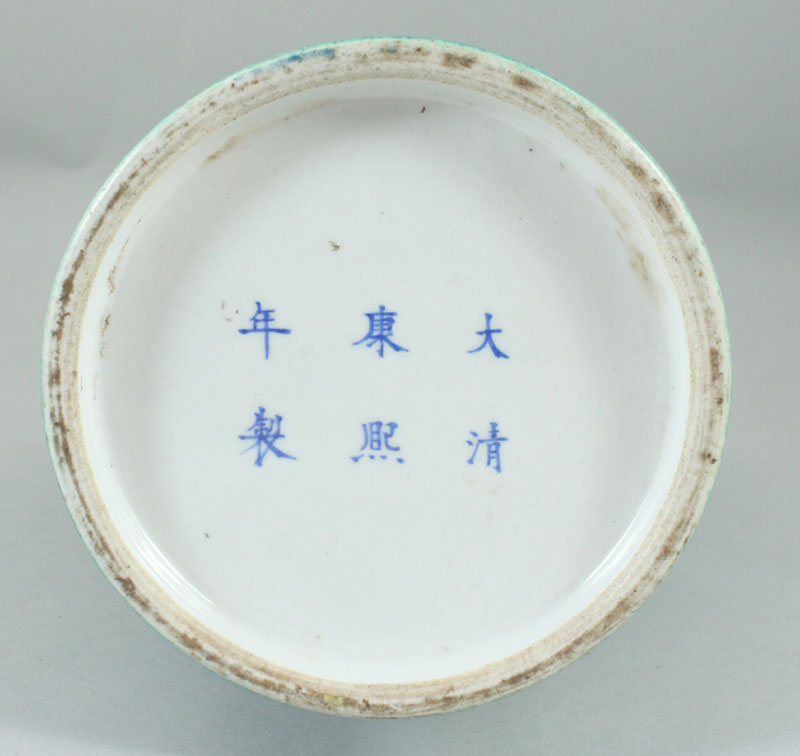 此圆柱形瓶底部稍收, 瓶口外撇, 通体施以蓝绿色釉, 瓶口内釉色稍深, 瓶底有 “大清康熙年制” 楷书款
