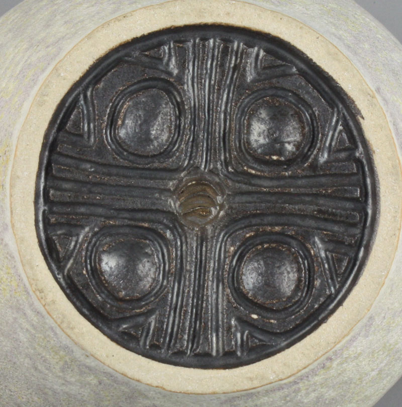 Stoneware, soft mottled heather, grey and green pitted surface, the rim squeezed to an oval and one edge formed into two points, impressed CCP seal