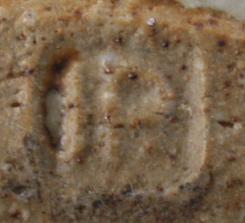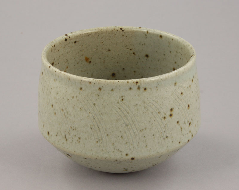 Stoneware, pale green glaze with an iron speckle, a combed design repeated around the exterior, impressed HP seal