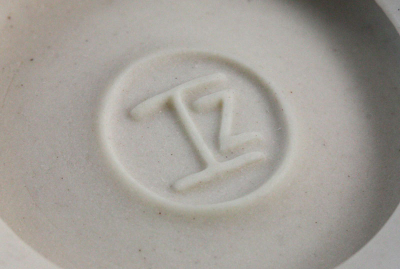 Porcelain, the cylindrical bowl mounted with two coil handles, raised on a turned foot, black inlaid designs of a teapot front and back, impressed NH seal