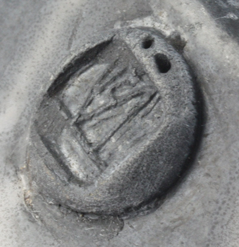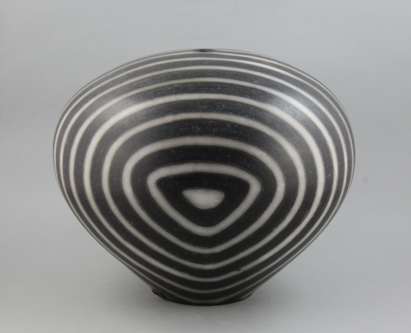 Raku, black smoke-fired body with white glazed bands forming rings across the body, a small aperture to the flattened shoulder, impressed TA seal