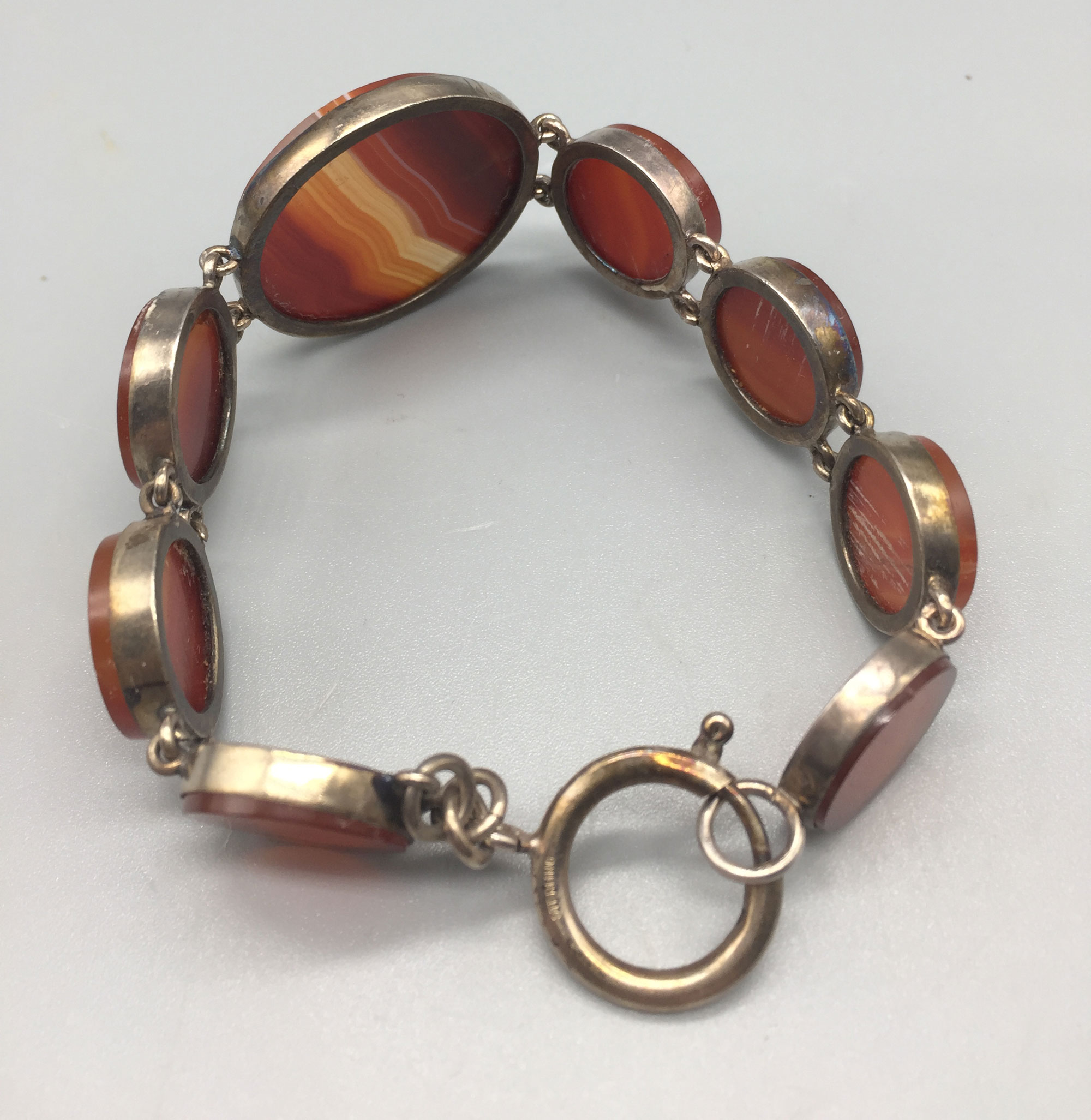 This is a lovely bracelet comprising 8 round panels of carnelian and banded carnelian mounted in silver.| Size: | 20 cm long, large panel 3 cm |