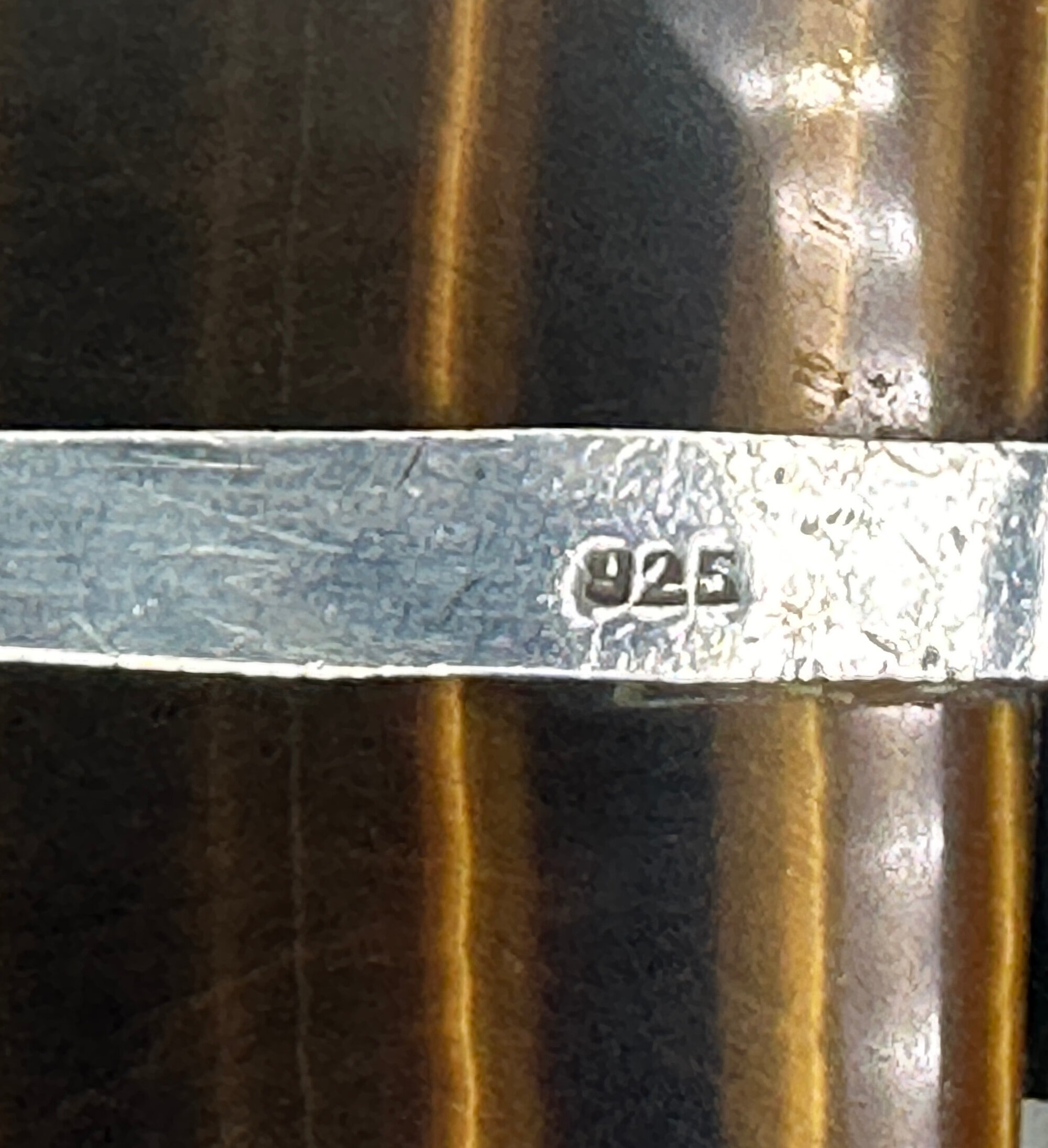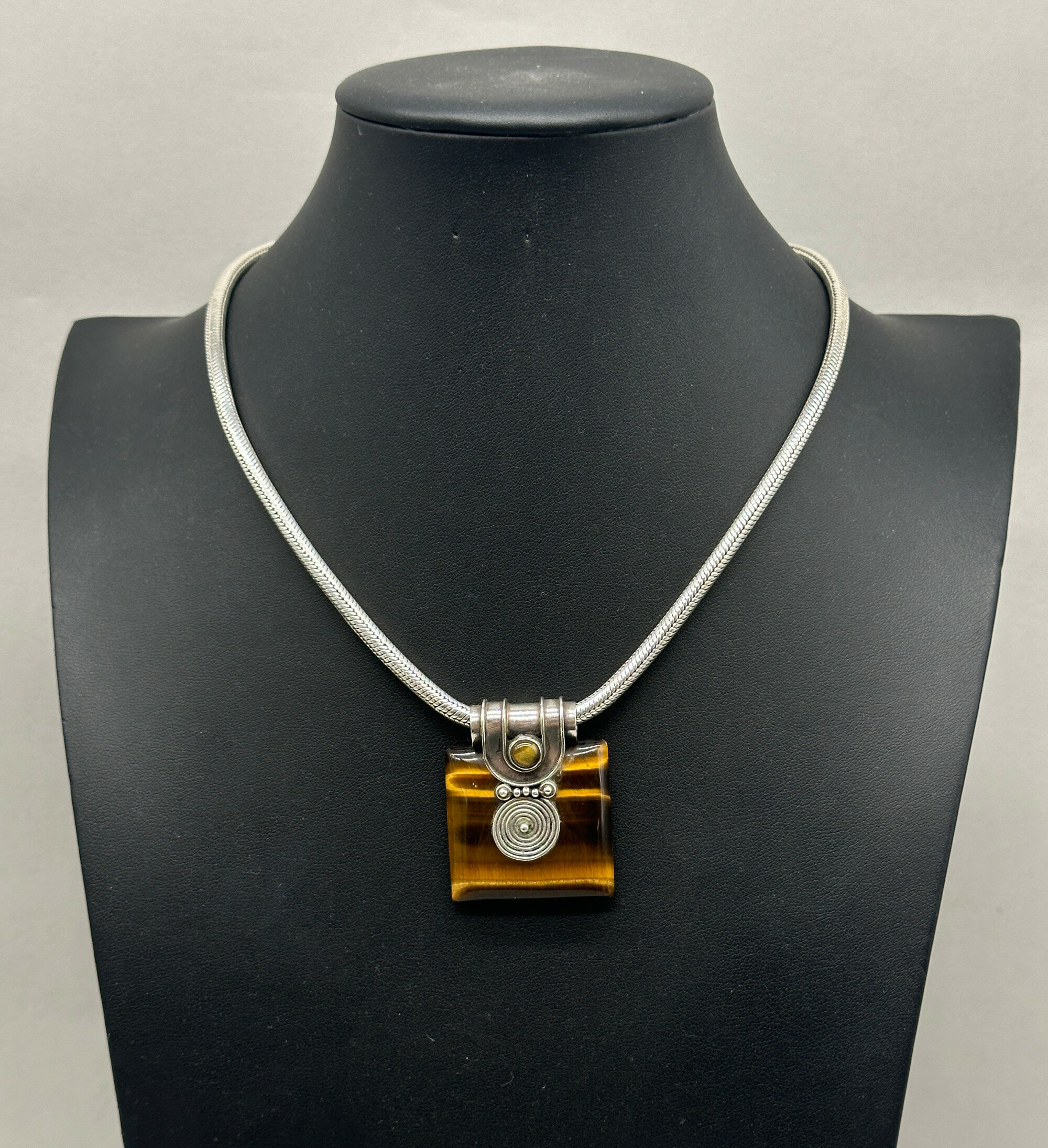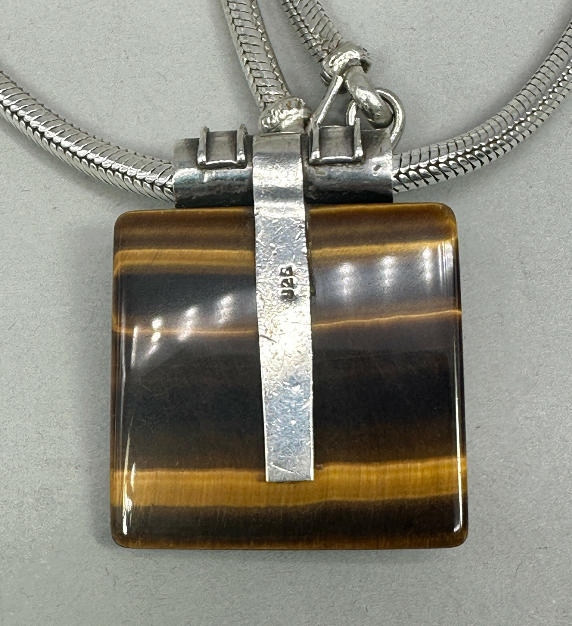 This is a full necklace comprising a large square tiger's eye stone with horizonal striations in a setting which employs Balinese motifs, highlighting the tradition of Balinese silver work. The mounted stone is suspended from a very thick snake form chain that complements it perfectly. There is a mark for '925' guaranteeing the quality of the silver. The abstract and bold forms present an arresting and attractive design which should appeal to a collector of contemporary costume jewellery.| Size: | Pendant is 3.5 x 4.5 cm, necklace is 44 cm and the chain has a thickness of 4mm |
