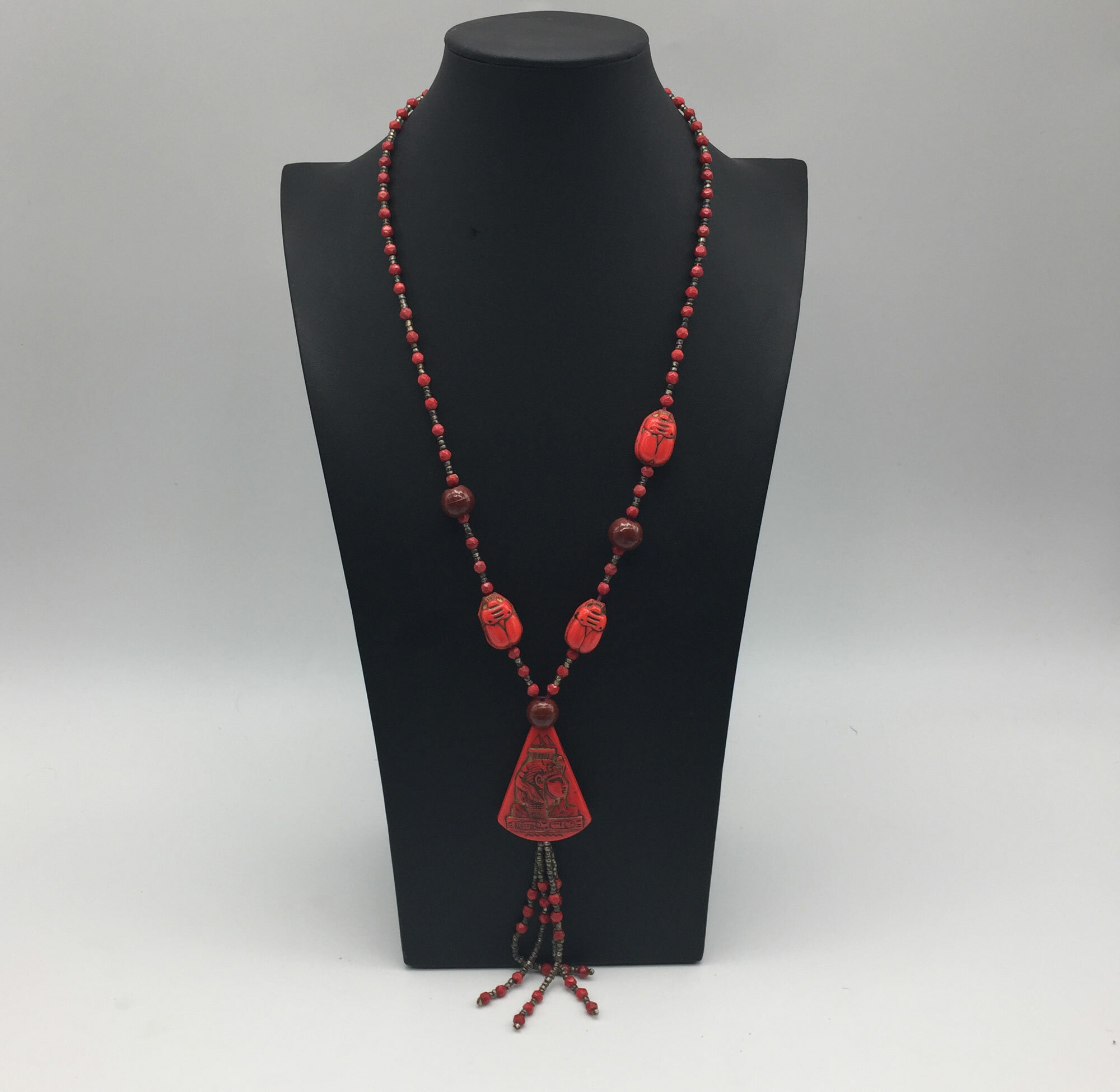 A wonderful necklace by the Czech jewellery manufacturers Neiger Brothers, with a glass pendant depicting Nefertiti in portrait relief and three large scarabs.| Size: | Necklace 64 cm long, main pendant 5.5 x 4 cm |