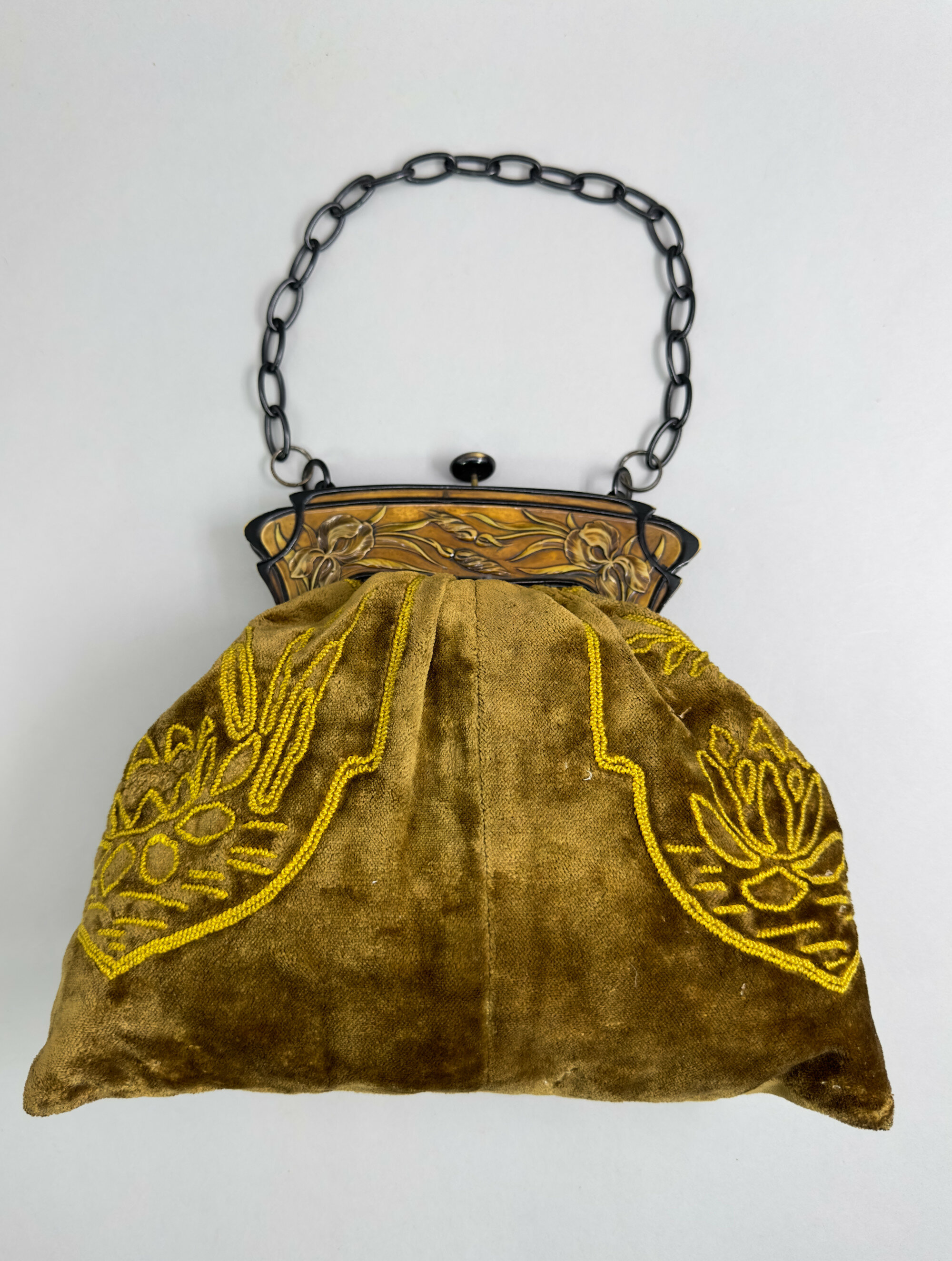 This is a very rare and unusual bag from Art Nouveau period in France, with the most incredible moulded celluloid frame with green embroidered velvet This bag is made of celluloid and is quite brittle and is therefore not suitable for use. It would be a wonderful addition to any vintage handbag collection.| Size: | 24cm x 25cm without handle |