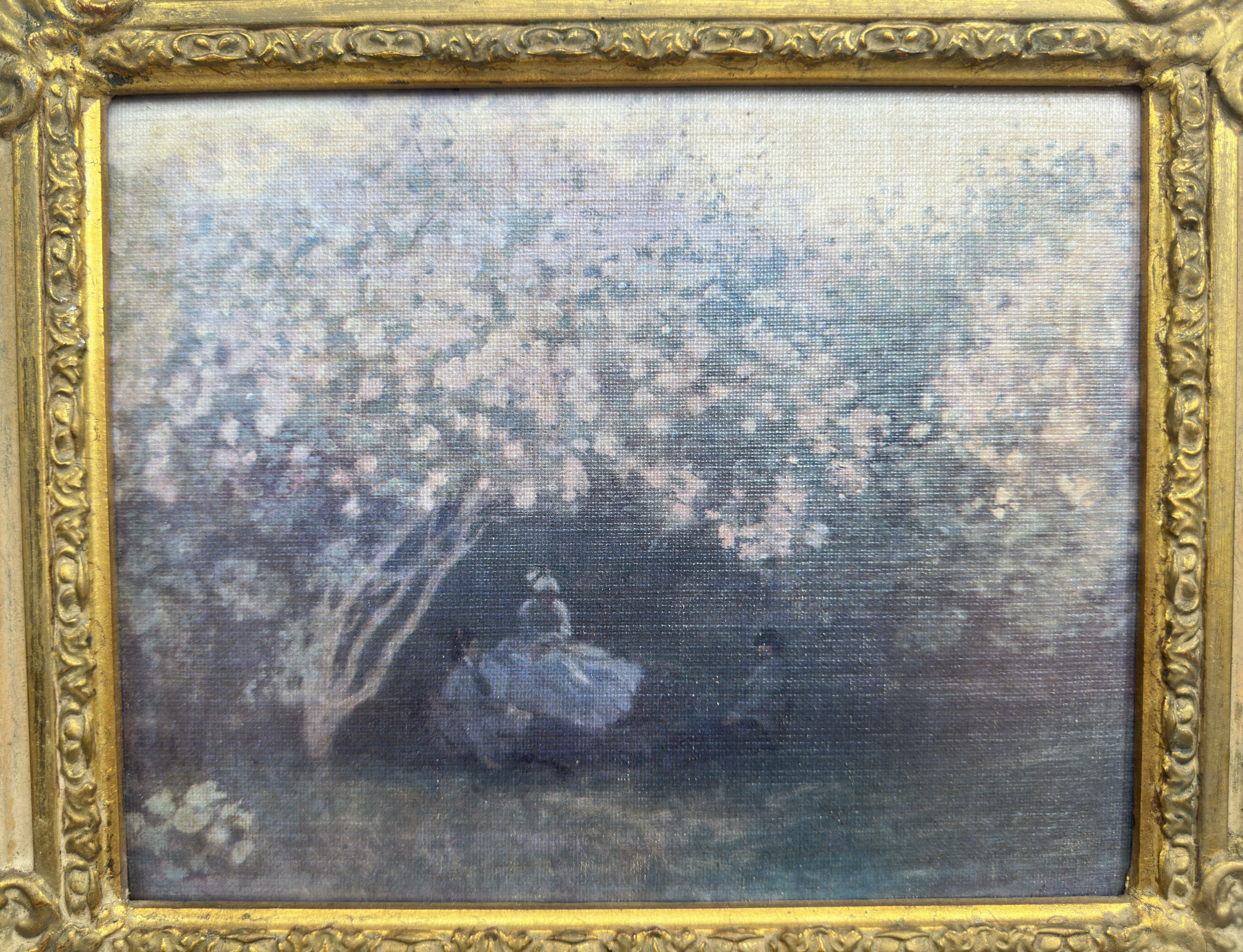Two matching reproduction pictures of Monet’s paintings ‘Les Coquelicots’ (Poppies) and ‘Le Repos sous les Lilas’ (Lilacs). As the labels on the back indicate, these are productions of the well known firm ‘Braun et Cie’ who specialised in the C20th in high quality reproductions of famous paintings with particular emphasis on the French Impressionists. The firm originated from a photographic business founded by Adolphe Braun (see image 12) in Mulhouse, France in 1847. It produced large numbers of stereoscopic and panoramic photos but by the postcard age largely specialised in producing reproductions of artworks. After Braun died suddenly in 1877, his family continued the business, which continued issuing these high quality copies until late in the C20th. Braun developed good relations with the Directors of the Louvre in the C19th, at one point being the exclusive photographer of its collection and the firm built on this to establish good relations with many of the major art museums internationally.From the 1930s onwards, Braun et Cie, as it had now become known, developed a speciality of producing reproductions on canvas, by a printing technique known as ‘giclée’, a French term meaning ‘sprayed’, referring to the operation of a printer which uses small spraying devices that can match colours and apply ink with precision, producing high quality prints of original art. Often the originals were reproduced on a much smaller scale, as here, which rather adds to their charm, although full size reproductions are known as well.
