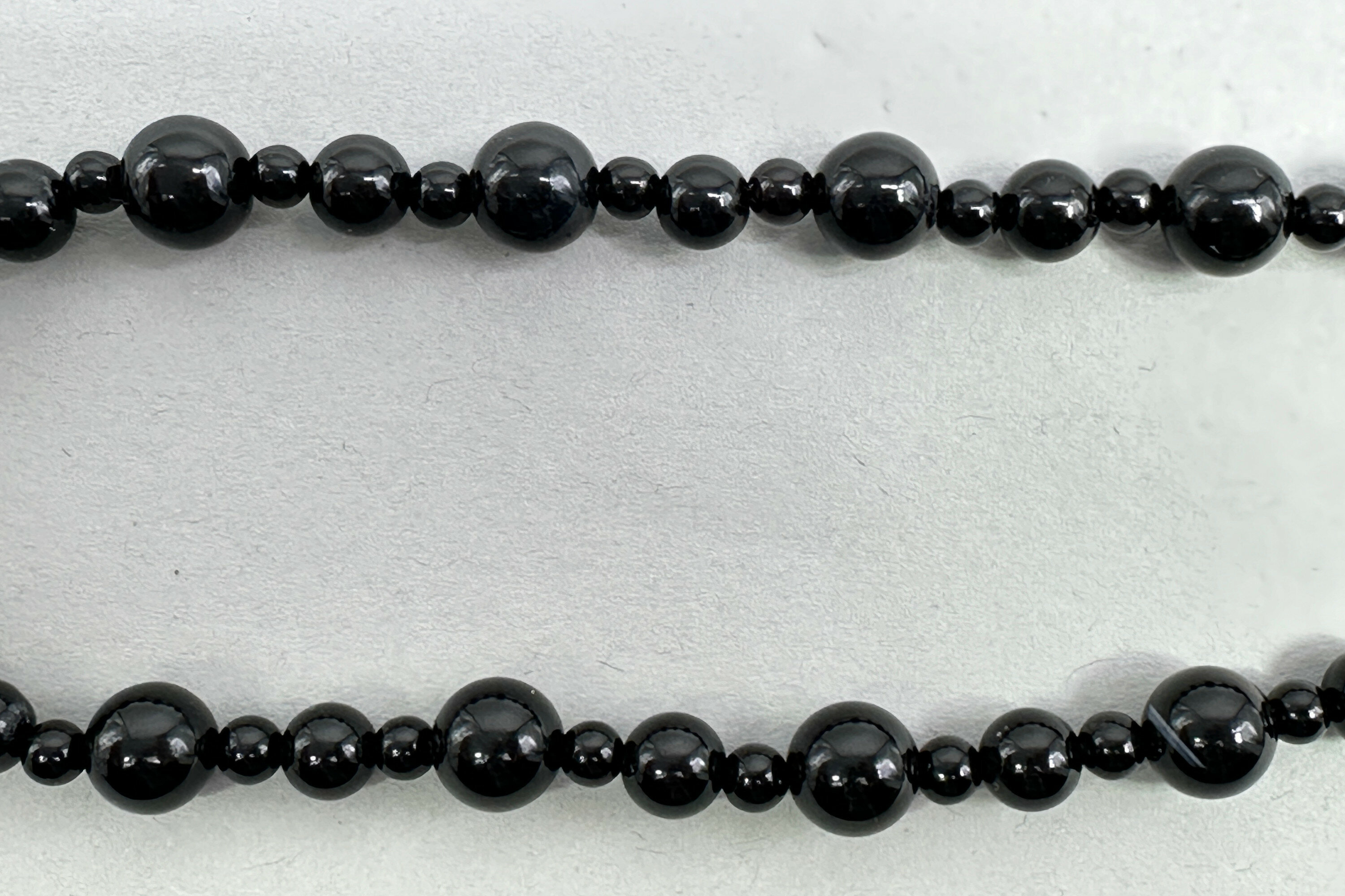 This necklace is a lovely design with a large carved banded agate carving. It is paired with onyx beads and agate beads. It is elegant and undestated due to the monochrome palette but definitely makes a statement.| Size: | Carving 4.8 cm diameter, necklace is 62 cm long |