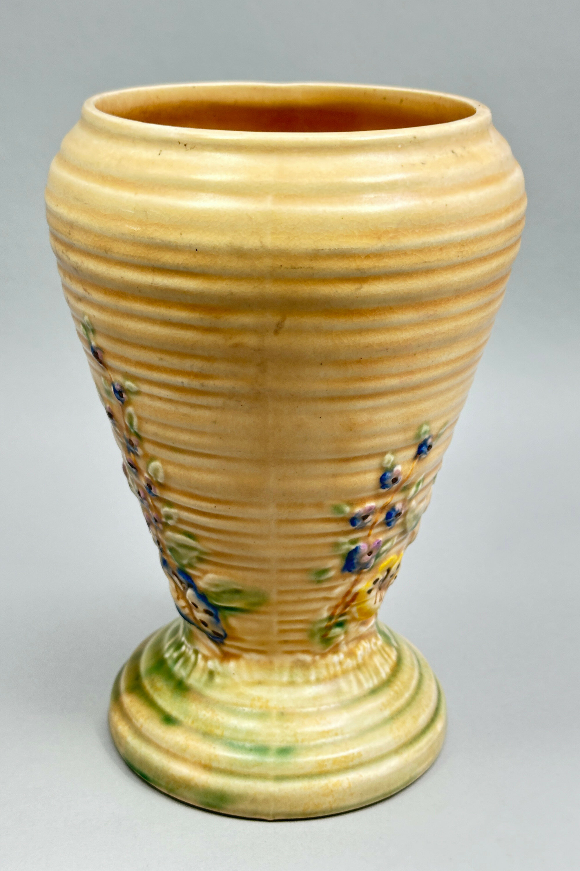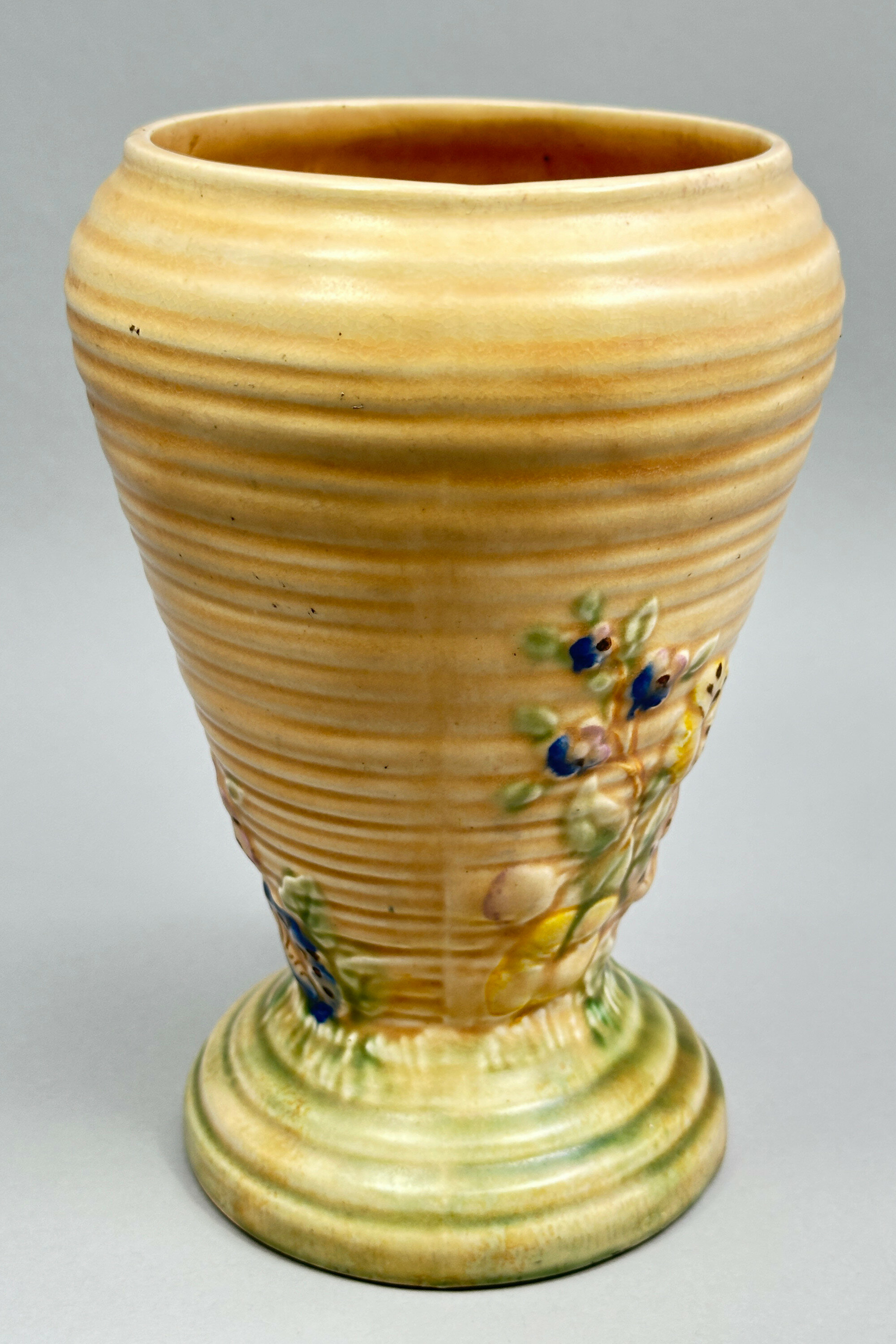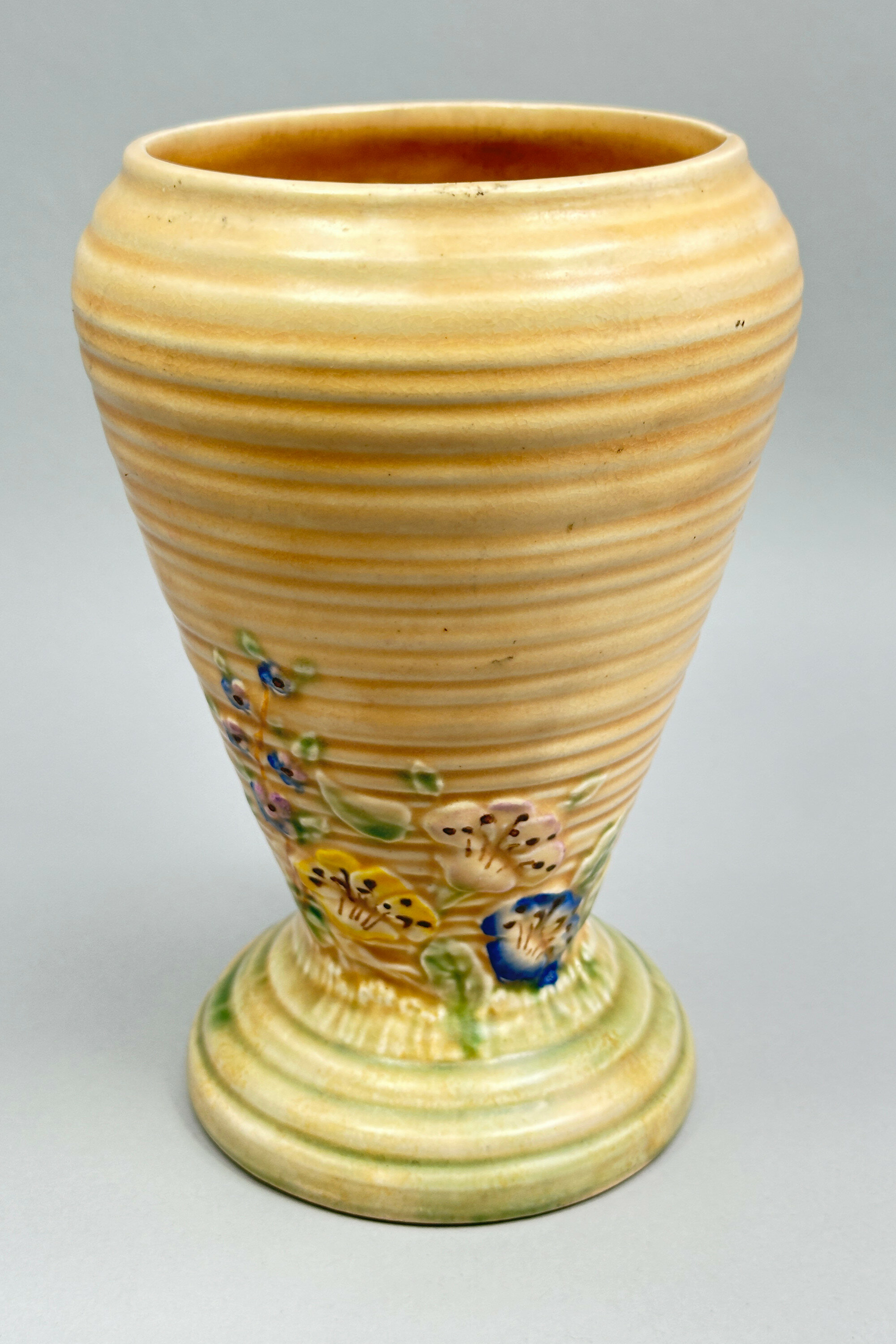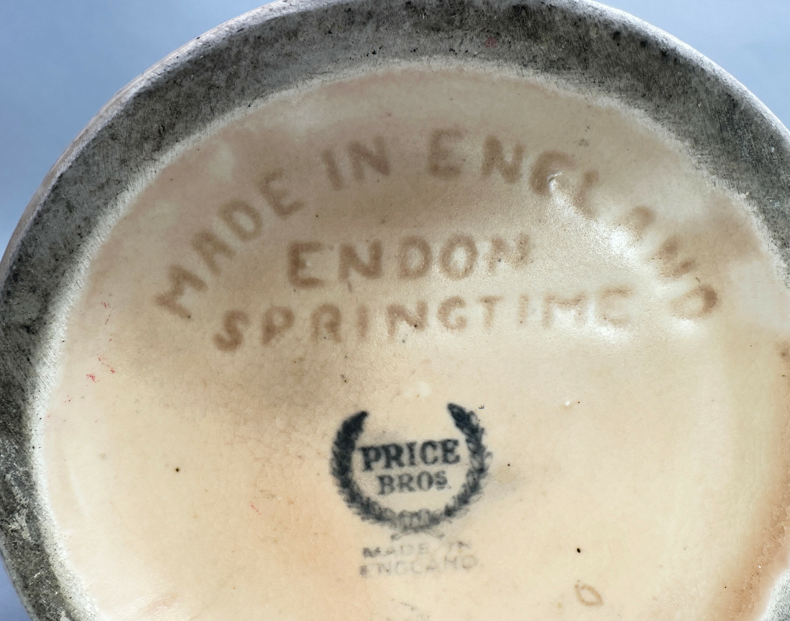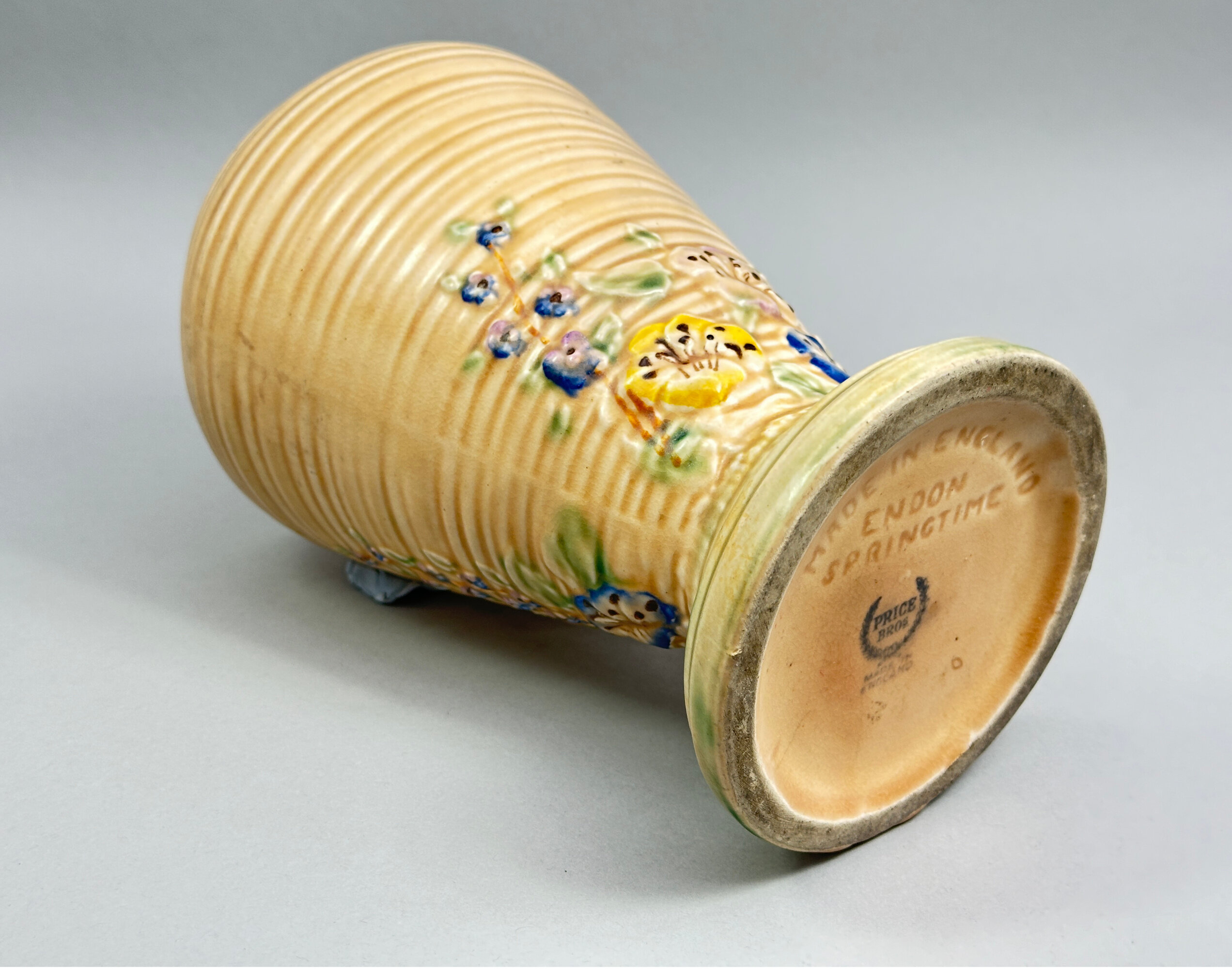 A ceramic vase of inverted conical form with a wide spreading foot, mustard glazed overall with green splash glaze effects at the base, the whole with moulded ribbing and moulded polychrome floral decoration to the front and reverse, the base with impressed marks ‘MADE IN ENGLAND’ ‘ENDON’ ‘SPRINGTIME’ and with a stamped mark ‘PRICE BROS’ within a floral wreath above ‘MADE IN ENGLAND’.Price Bros was an earthenware manufacturer established at the Crown Works, Burslem, Staffordshire, England, in 1896 by the Price brothers. They specialised in tabletop accessories and teapots and success was rapid such that in 1934 they moved to larger premises at the Top Bridge Works in Longport, where they became known as Price Bros Ltd. A close association with another firm, Kensington Potteries, was finally cemented when the two firms merged in 1962 taking on the name ‘Price and Kensington’ and continuing to manufacture their popular wares to the present day. This vase is typical of the decorative pieces which Price Bros produced during the 1930s and, as with so much of the pottery produced at that time, it reflects the Art Deco styles, particularly in the semi abstract shape. This vase was mould made as can be seen from the joins at each side (see image 7) but there is nothing mechanical about the finished result with its pleasing combination of colour and decoration.