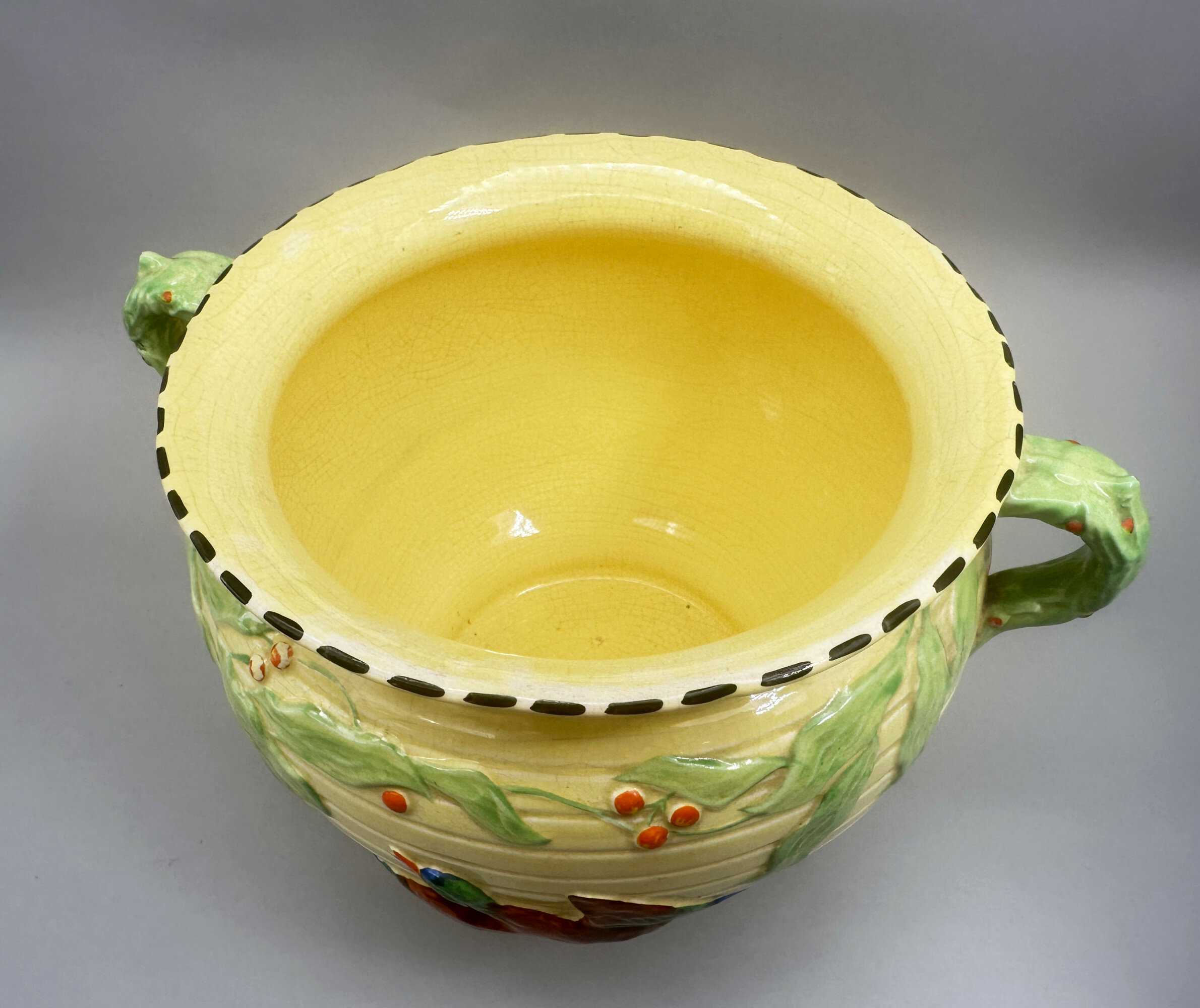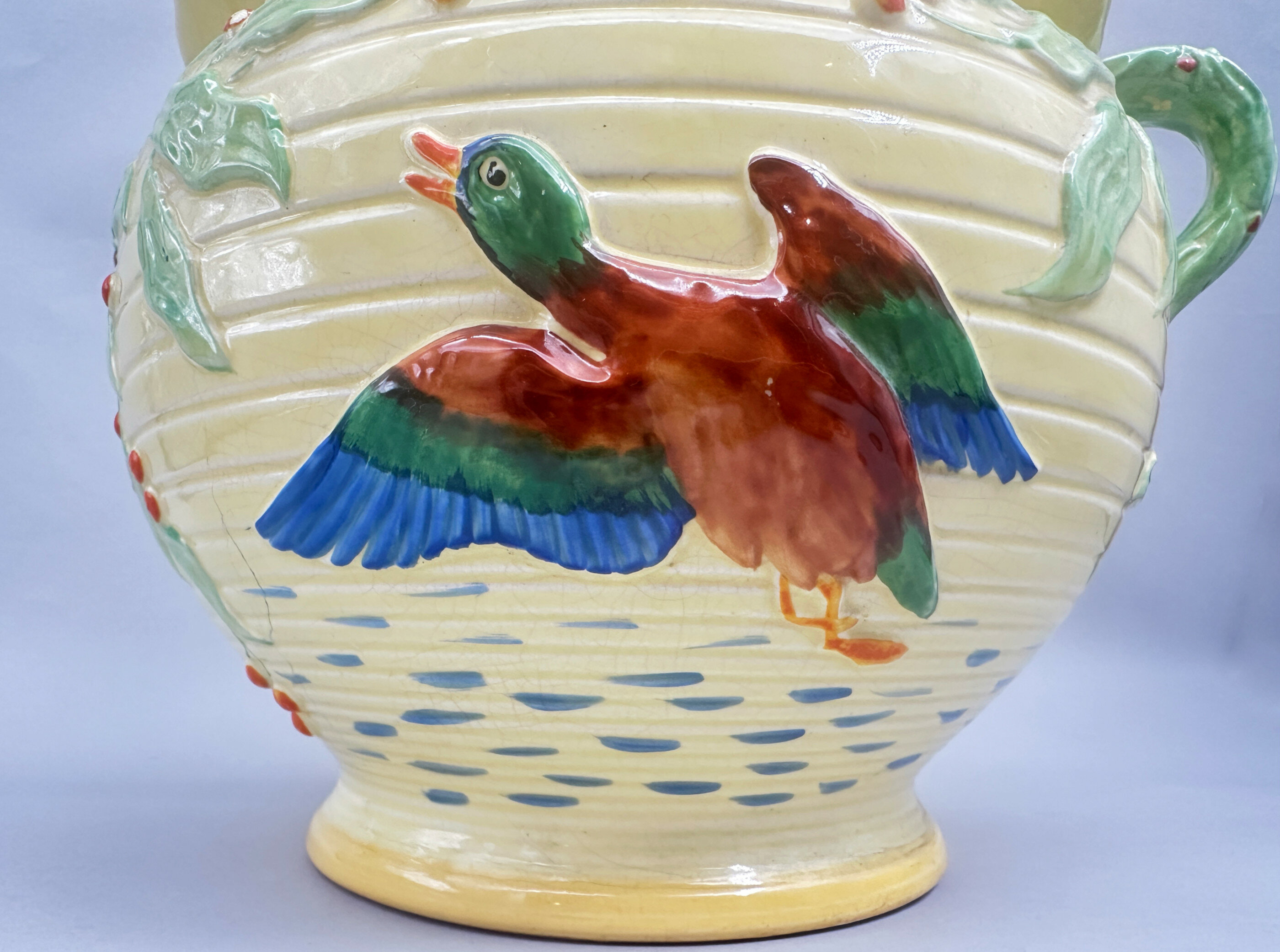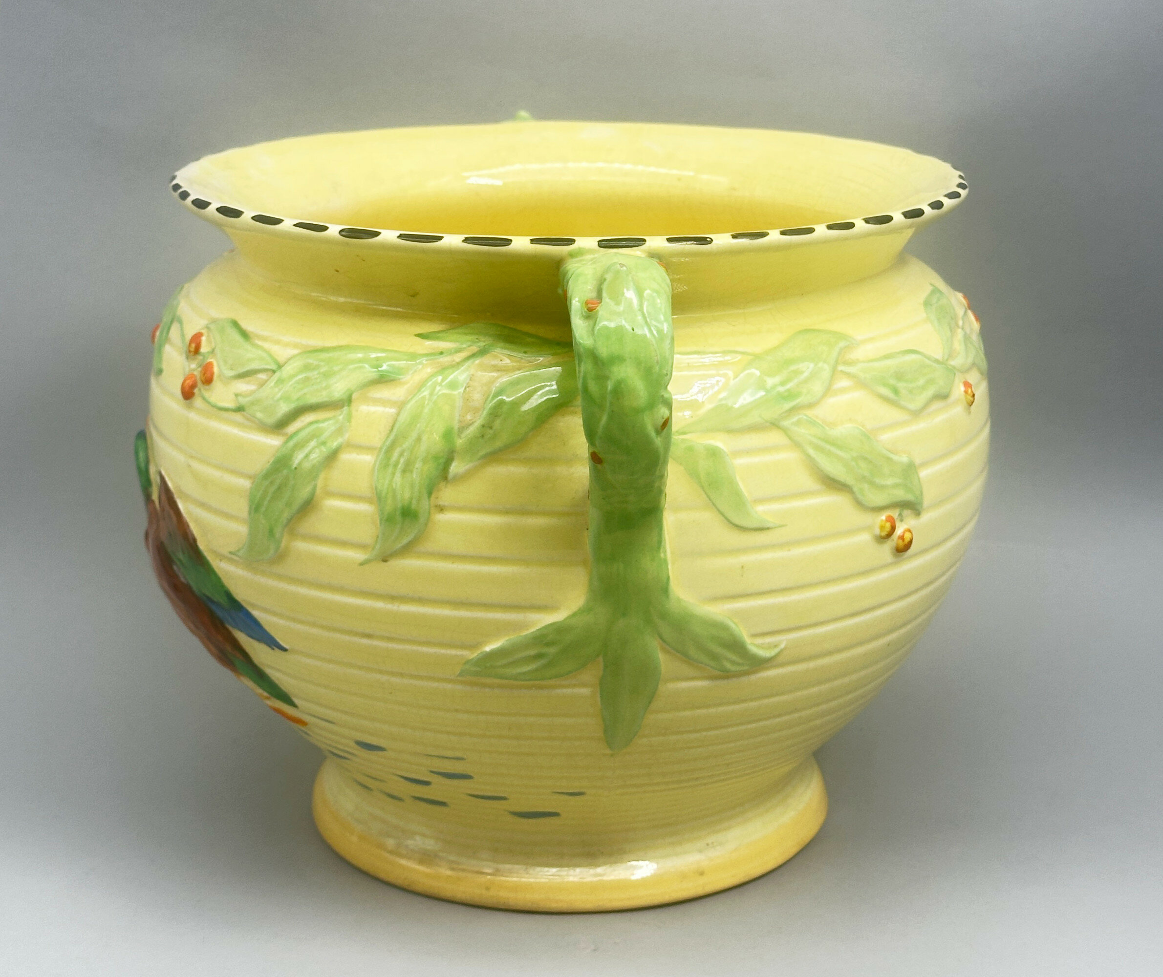 A circular jardiniere of globular form, the body ridged with a spreading foot below and a flaring rim above, two branch handles to the side, glazed overall in yellow, in part with a light craquelure, with polychrome raised moulded decoration of a mallard duck amidst foliage with berries, the interior glazed yellow and the base similarly glazed yellow with a craquelure effect and with a circular stamped mark ‘ENGLAND’ ‘LG’ [cipher] ‘FALCON WARE’ and impressed marks ‘MALLARD’ ‘MADE IN ENGLAND’.Falcon Ware was the trade name for pieces produced by Thomas Lawrence, later Thomas Lawrence (Longton) Ltd, a business founded by Thomas Lawrence in 1885 which moved to the Falcon works, Longton, in 1895. In the same year he took his nephew, John Grundy into partnership and around 1920 Grundy became the Managing Director. Thomas Lawrence died in April 1932 and John Grundy became the sole proprietor until his death in 1938 when the business was sold to Grundy's son-in-law Mr Richard Hull (jnr) and Mr. E.J. Dennis and the name was changed to 'Thomas Lawrence (Longton) Limited'. At the same time the firm merged with Shaw and Copestake Ltd of which Richard Hull was a Director but the two businesses still operated independently until 1962 when the Thomas Lawrence business was fully subsumed by its partner with the ‘Falcon’ name ceasing to be used two years later in 1964.