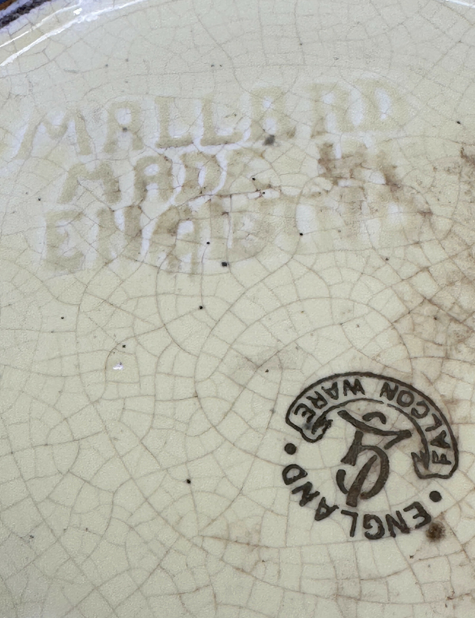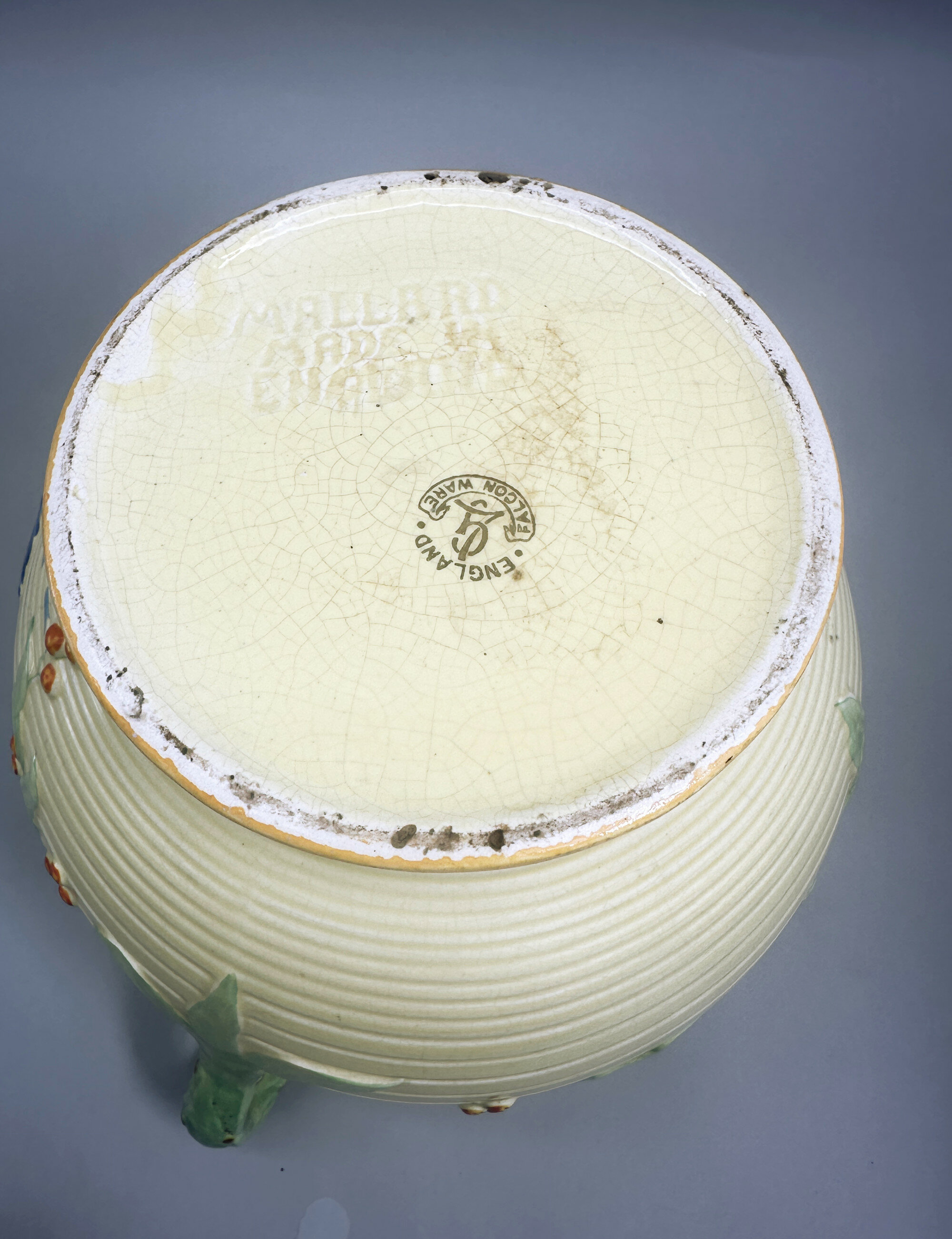 Falcon Ware was known for colourful and decorative designs often with naturalistic themes. This jardiniere is an excellent and unusual example. The cipher ‘LG’, for Lawrence and Grundy, which is not so often found, implies a dating to the 1930s which corresponds with the general style of the piece with its hint of Art Deco associations.