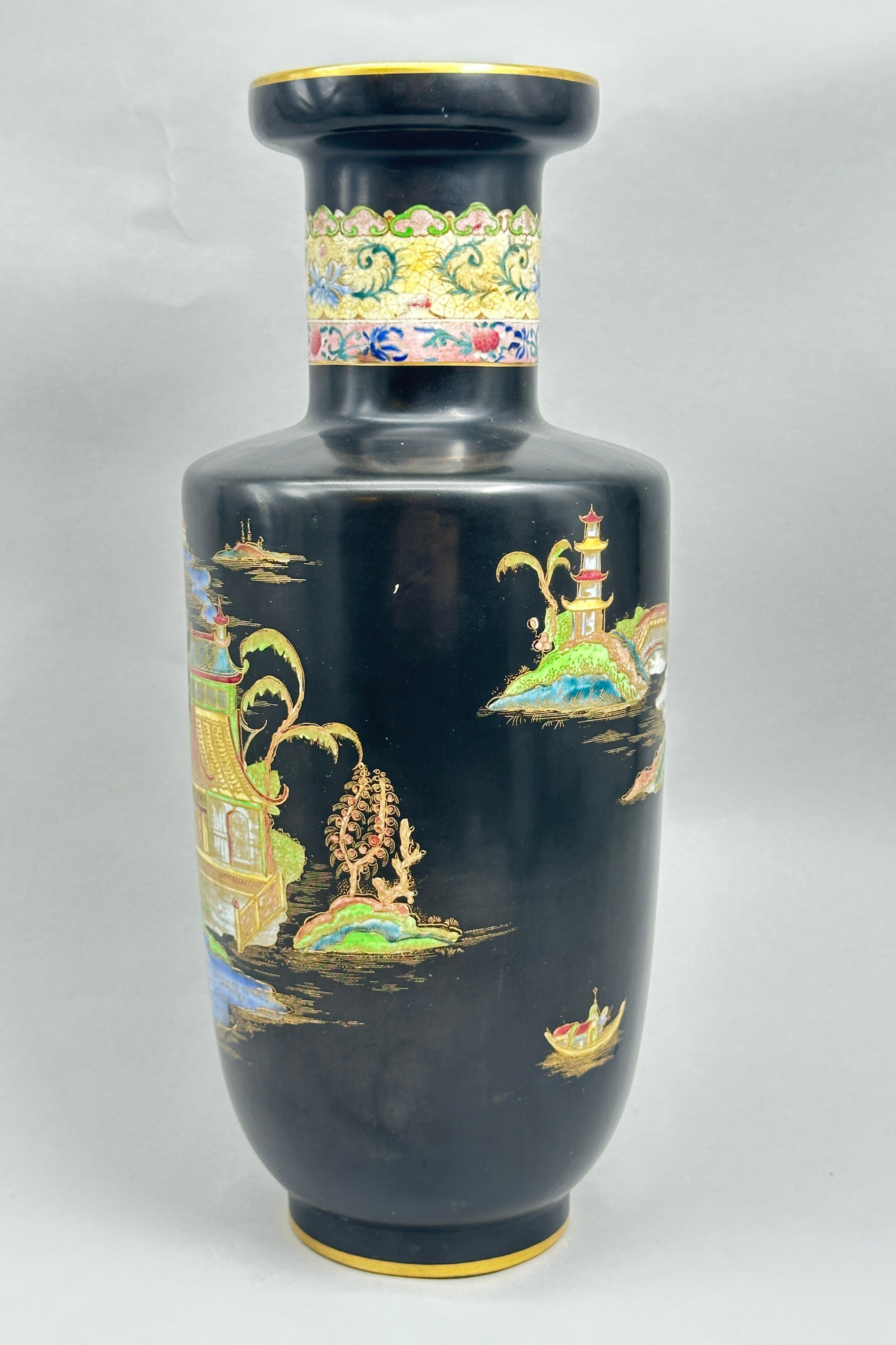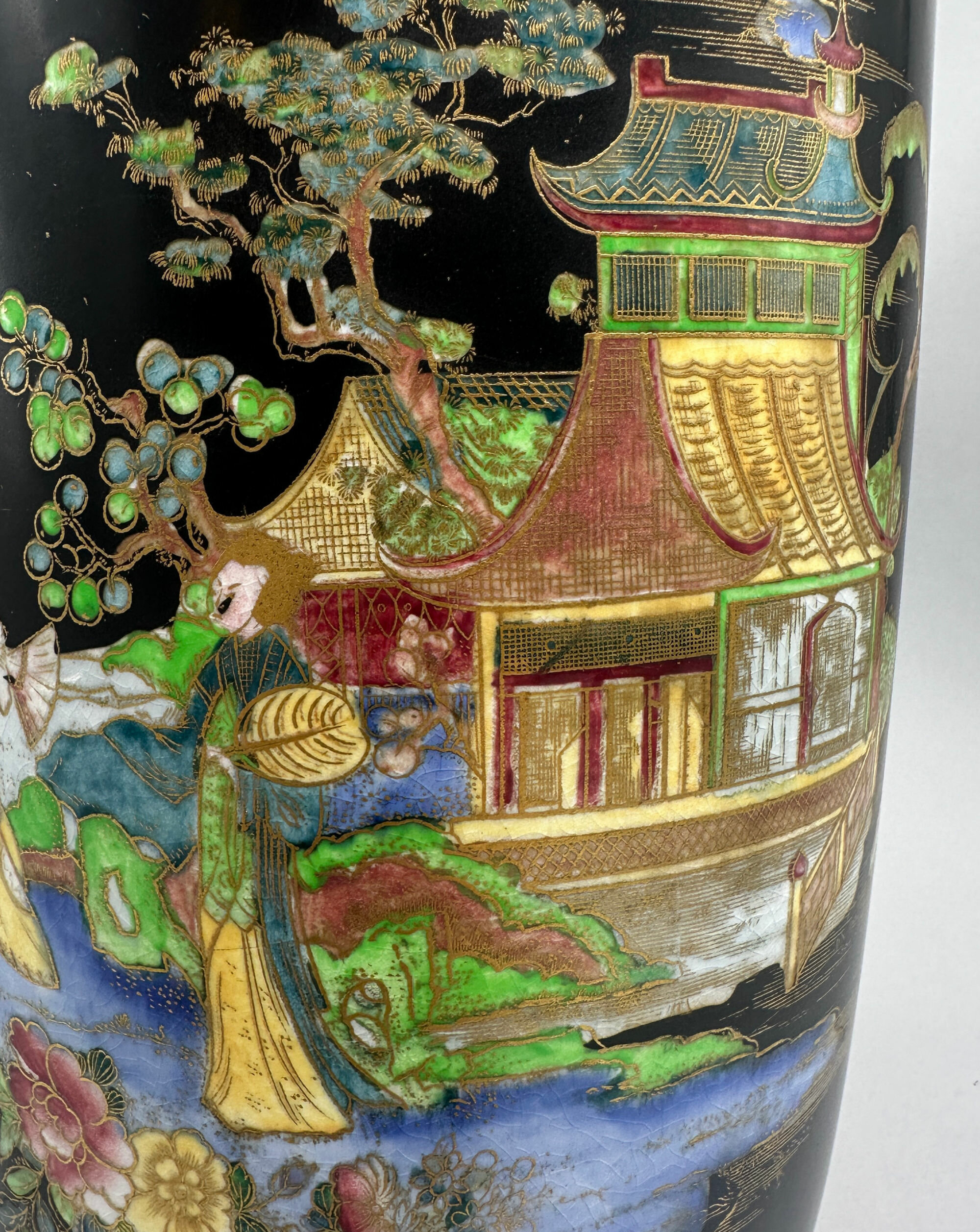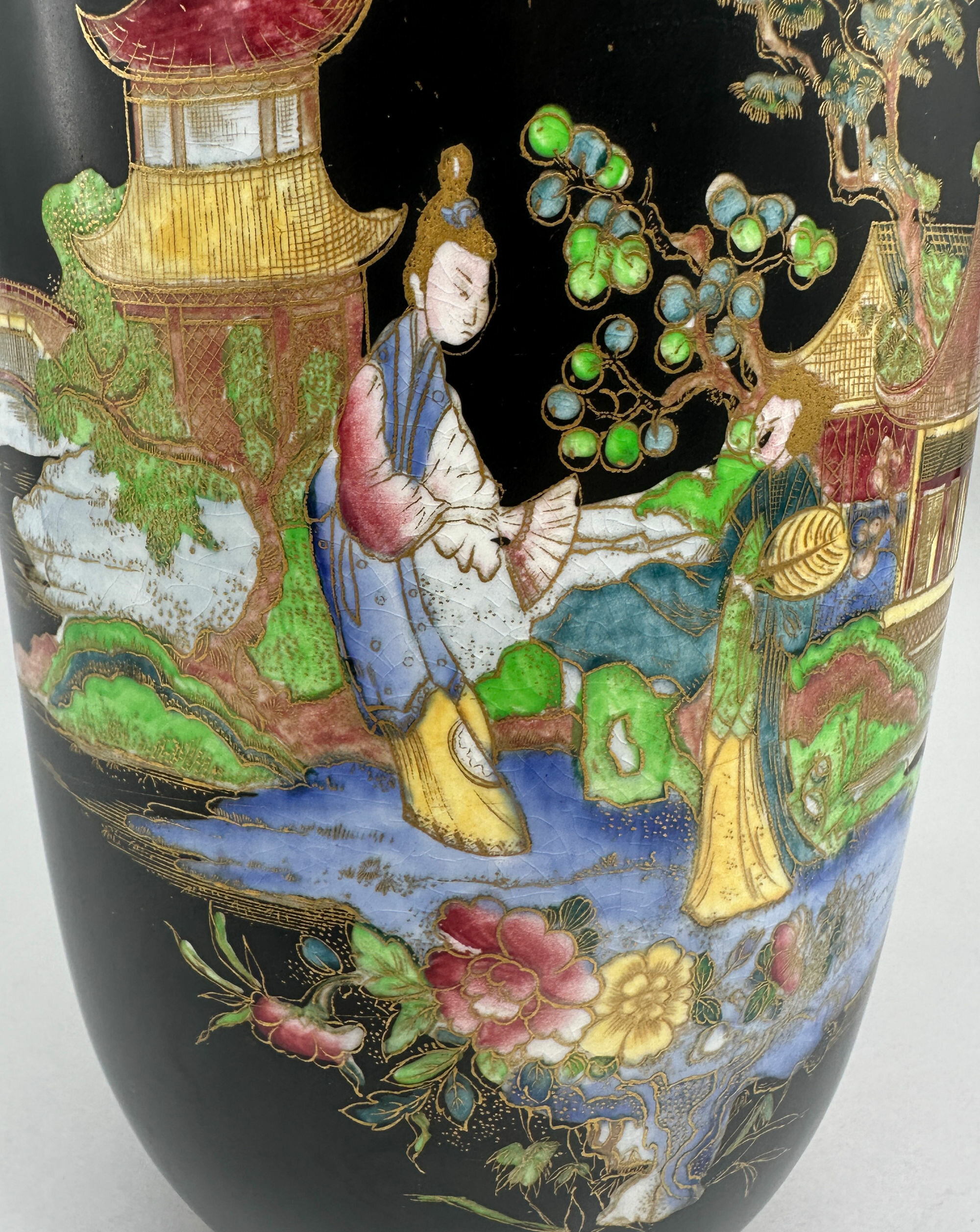 Designed by Horace Wain, this Japonaiserie pattern vase is an example of the so called ‘Mikado’ range produced by Carlton Ware from the 1920s onwards. Inspired by the Gilbert and Sullivan operetta of the same name, Wain combined both Chinese and Japanese elements to produce a decorative melody of Oriental design. The form of this vase, a cylindrical body tapering at the base with a well defined shoulder below a short cylindrical neck with a galleried rim, follows closely the classic Chinese ‘rouleau’ shape and some of the elements of the decoration are Chinese in origin too, especially the floral border to the neck, but the figures are Japanese, the lady appearing as a Geisha and the gentleman holding a fan usually described as the Mikado emperor himself. The black ground appears on other pieces and the form of the mark, including a dove within a circle, was used from 1894 to the early 1920s, when Wain himself left the firm, although his designs continued to be made for some years afterwards.Carlton Ware was the trade mark used by the pottery manufacturer Wiltshaw and Robinson, whose premises were located in Stoke on Trent, four years after the firm’s establishment in 1890. The firm mostly concentrated on decorative giftware and new methods of production introduced in the 1920s put it at the forefront of the earliest Art Deco pottery pieces produced, firstly with designs originating from Tutankhamun’s tomb and then with pieces with an Oriental influence of which this vase, in shape not often seen in this design, is a prime example.