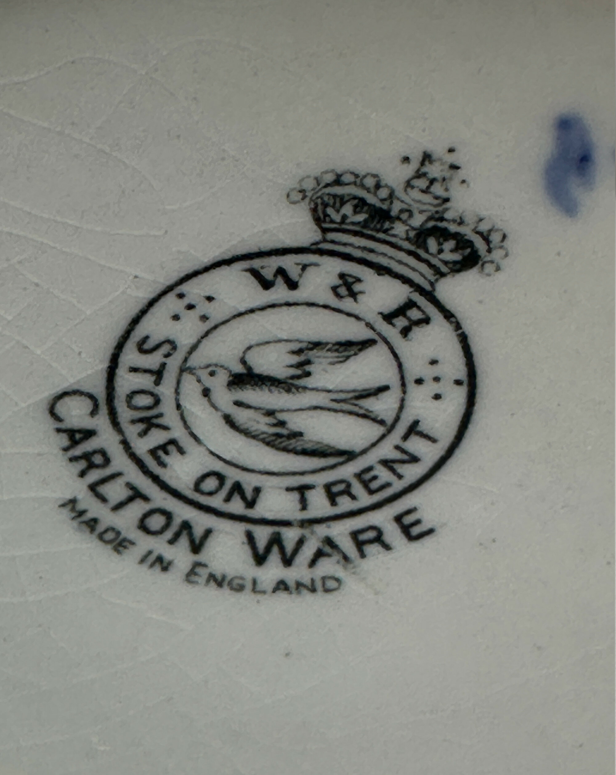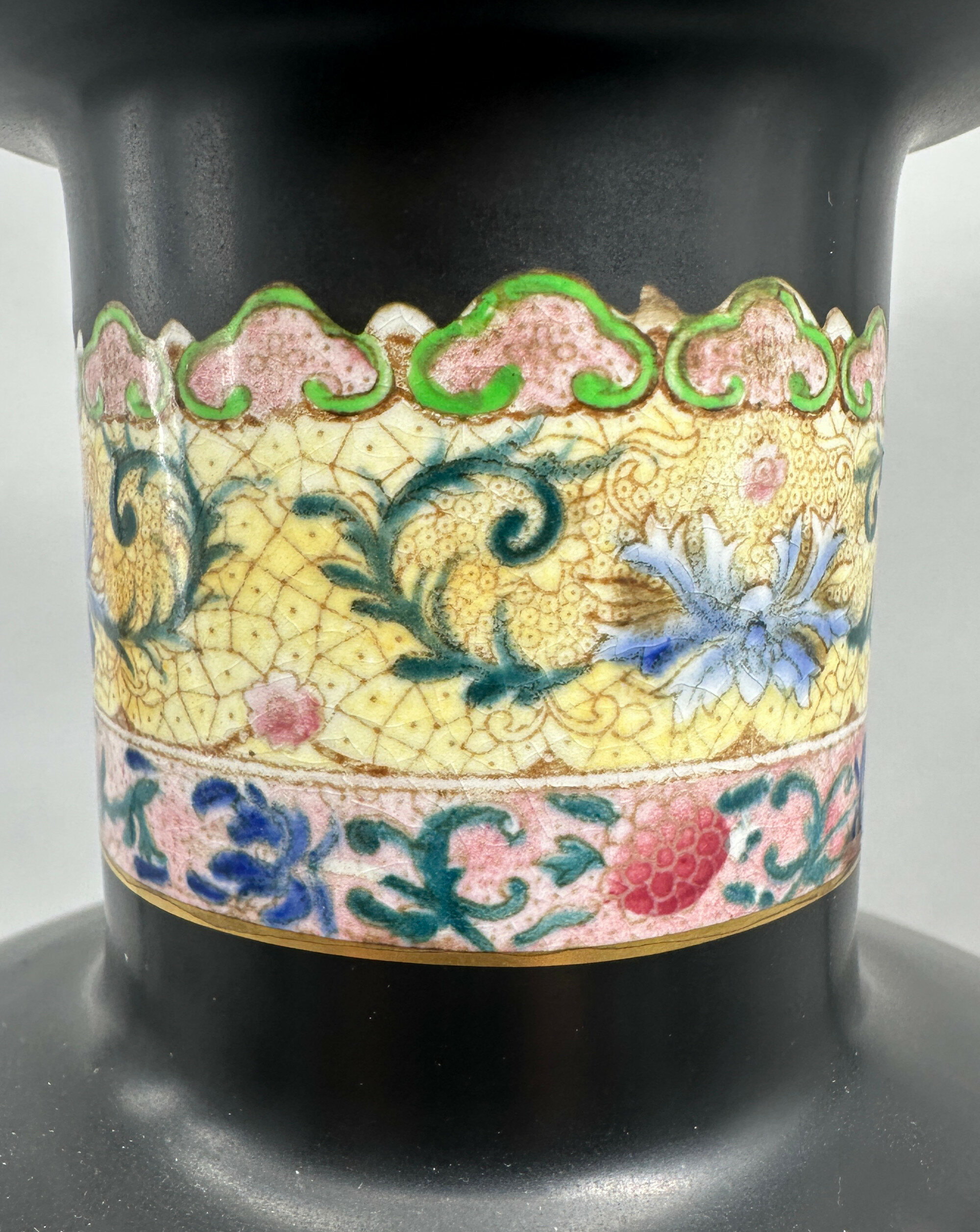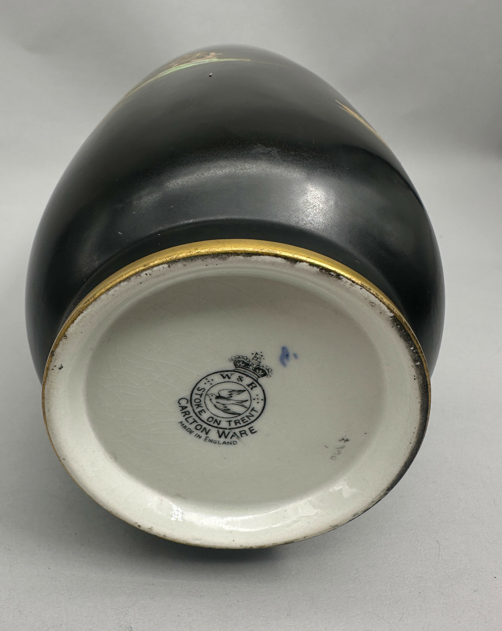 Designed by Horace Wain, this Japonaiserie pattern vase is an example of the so called ‘Mikado’ range produced by Carlton Ware from the 1920s onwards. Inspired by the Gilbert and Sullivan operetta of the same name, Wain combined both Chinese and Japanese elements to produce a decorative melody of Oriental design. The form of this vase, a cylindrical body tapering at the base with a well defined shoulder below a short cylindrical neck with a galleried rim, follows closely the classic Chinese ‘rouleau’ shape and some of the elements of the decoration are Chinese in origin too, especially the floral border to the neck, but the figures are Japanese, the lady appearing as a Geisha and the gentleman holding a fan usually described as the Mikado emperor himself. The black ground appears on other pieces and the form of the mark, including a dove within a circle, was used from 1894 to the early 1920s, when Wain himself left the firm, although his designs continued to be made for some years afterwards.Carlton Ware was the trade mark used by the pottery manufacturer Wiltshaw and Robinson, whose premises were located in Stoke on Trent, four years after the firm’s establishment in 1890. The firm mostly concentrated on decorative giftware and new methods of production introduced in the 1920s put it at the forefront of the earliest Art Deco pottery pieces produced, firstly with designs originating from Tutankhamun’s tomb and then with pieces with an Oriental influence of which this vase, in shape not often seen in this design, is a prime example.