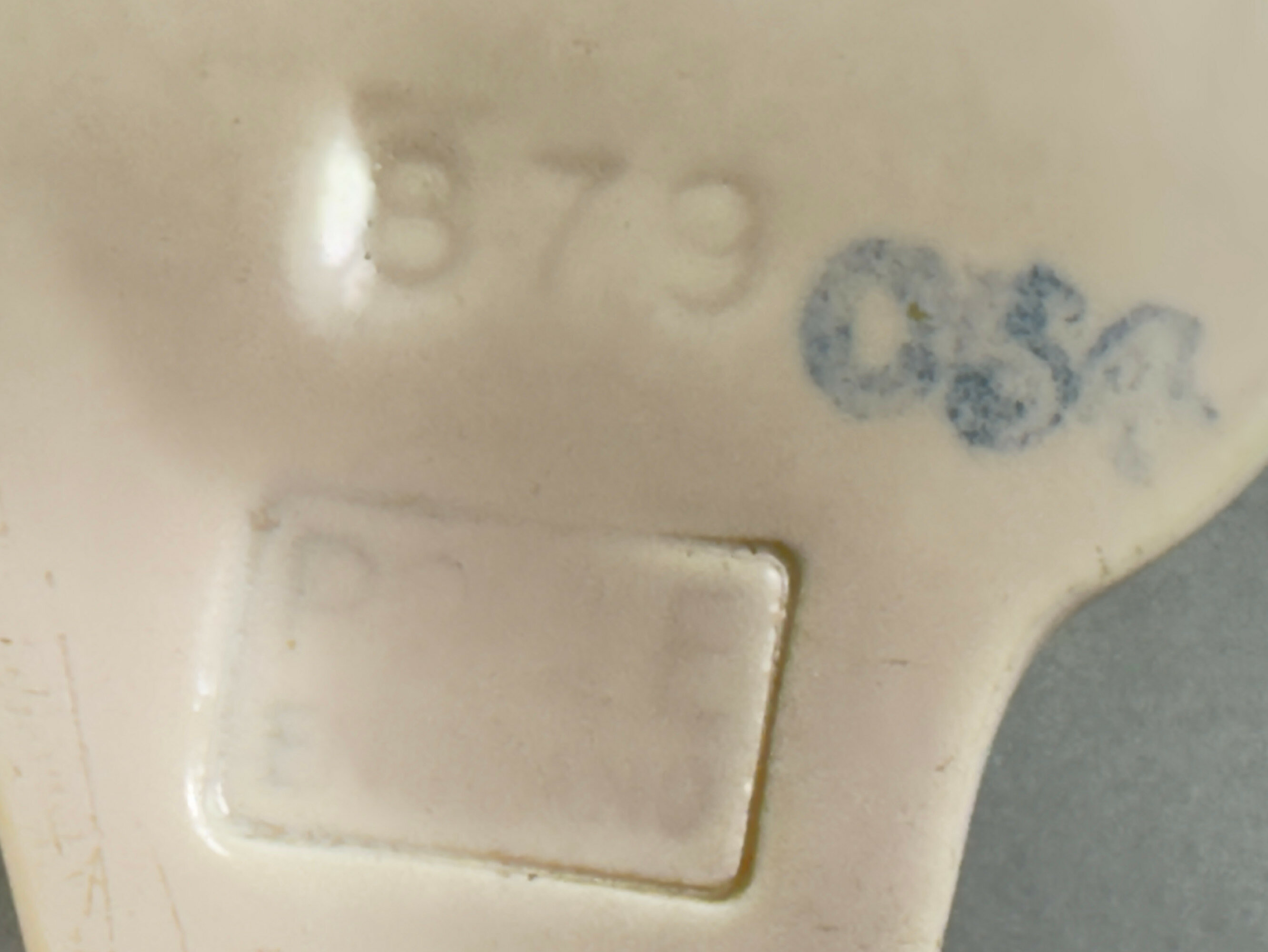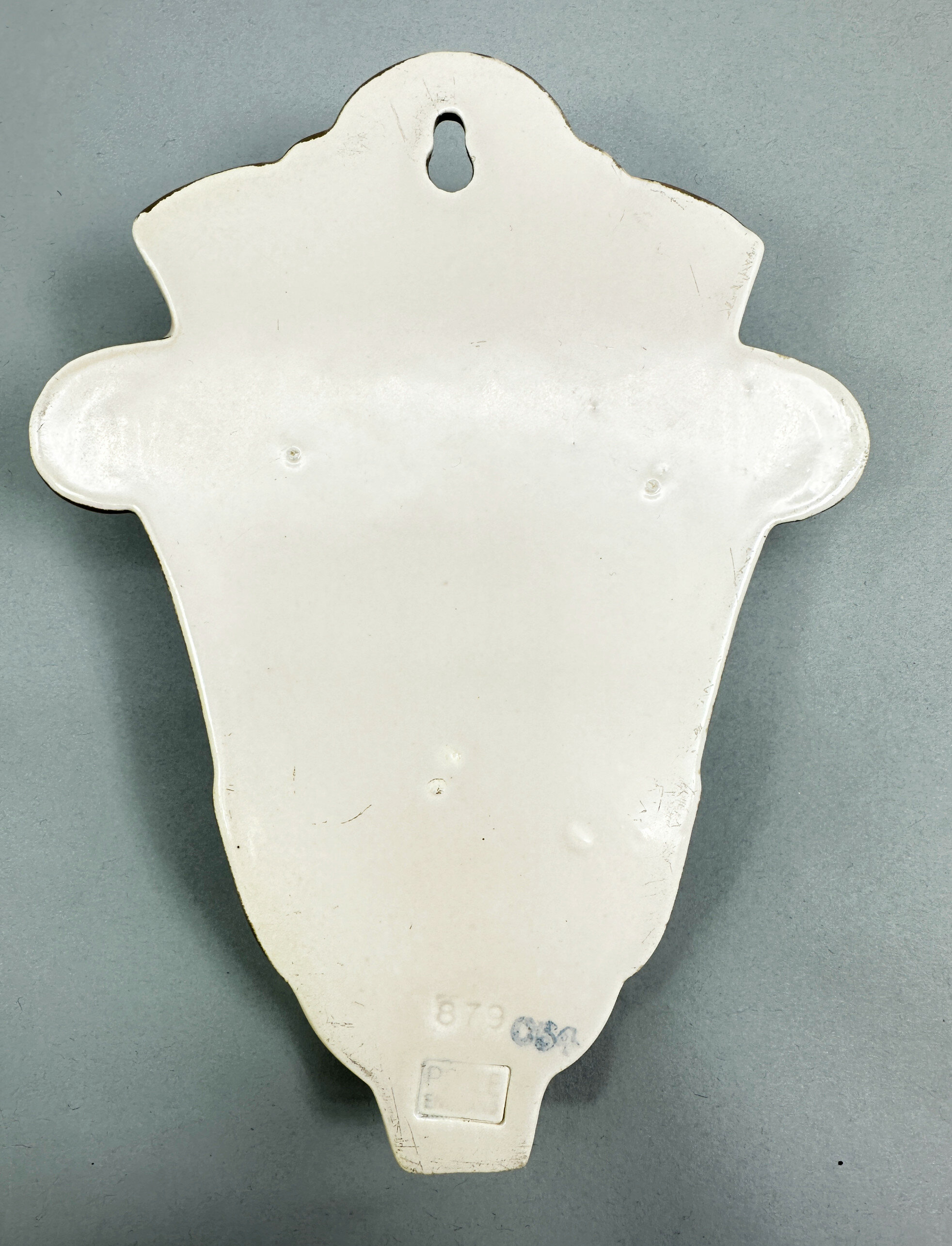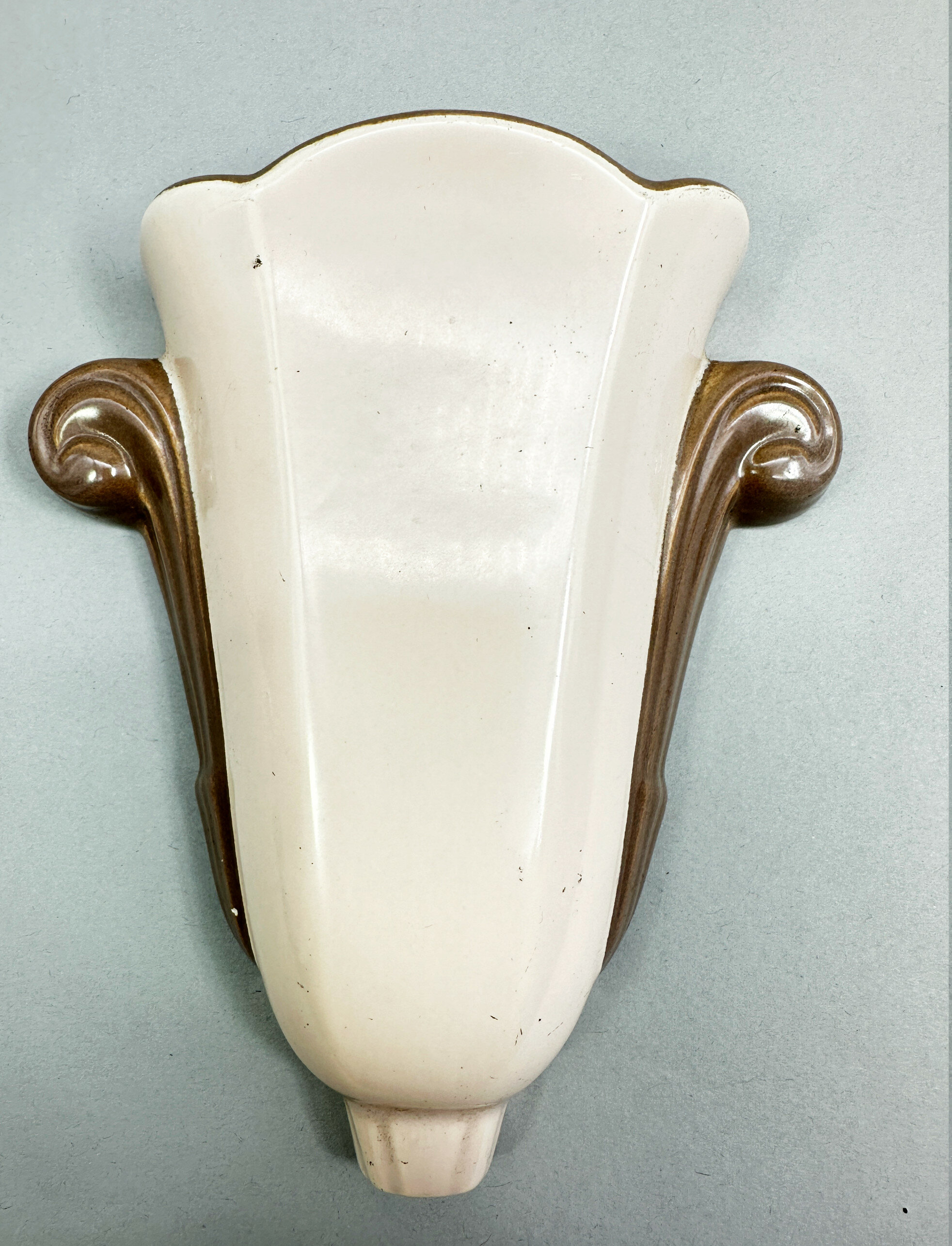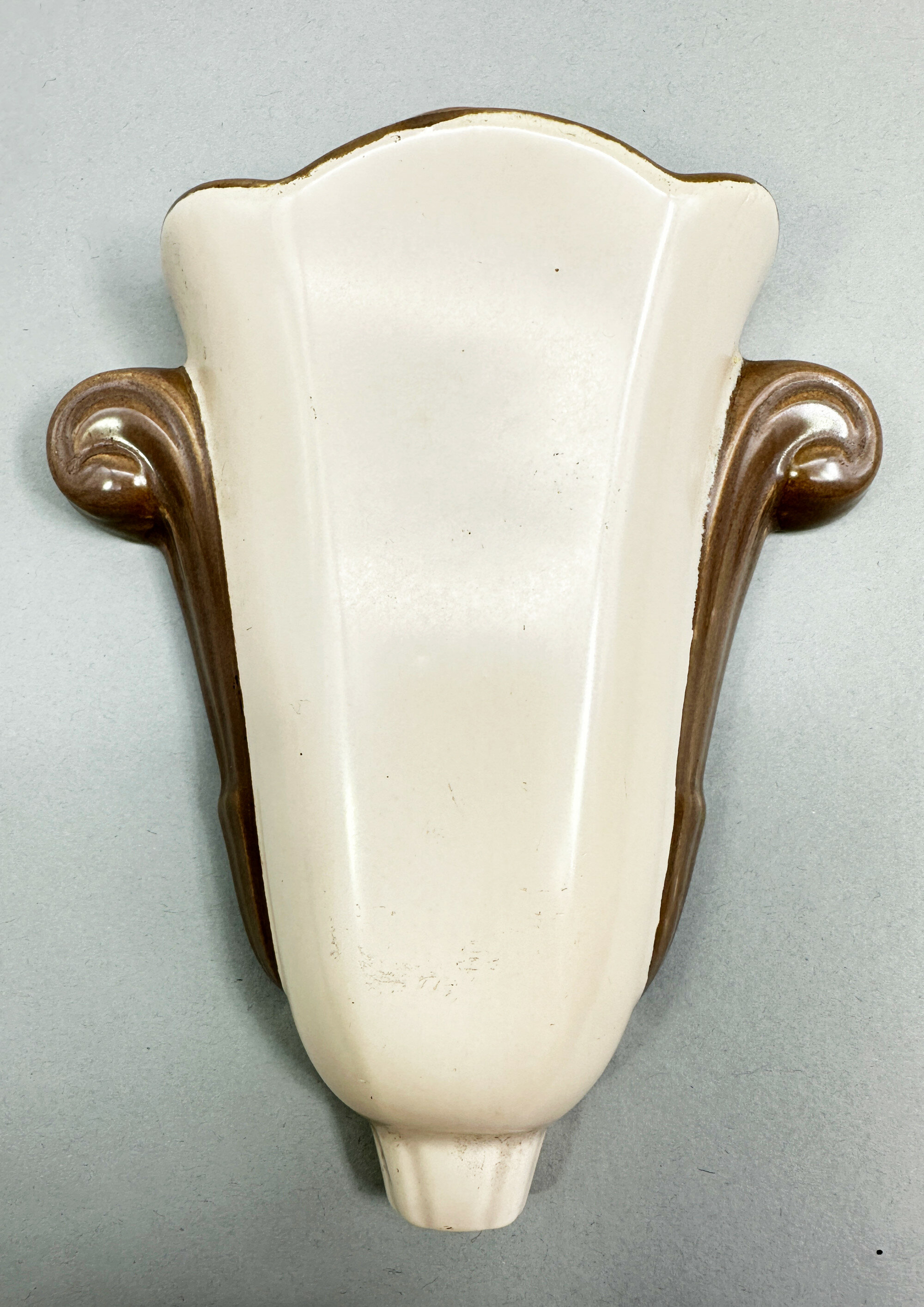 A pair of wall pocket vases of urn form with scrolling handles, a crimped base and a scalloped top, the backs flat with one pierced hole for hanging, kiln spur marks and impressed marks ‘POOLE ENGLAND’ ‘879’ and a stamped mark ‘C 54’, both glazed in shades of cream and brown. Poole Pottery began production in 1873 and continued into and throughout the twentieth century, suffering vicissitudes and even periods of liquidation in more recent years but still continuing production to this day. The design of these wall pockets has an Art Deco feel and may have been originally created in the 1930s but was still being made into the 1950s. The two colour or ‘twintone’ decoration was also first produced in the 1930s and the form of the marks here, where the just the factory name appears without the ubiquitous dolphin, may well indicate a pre war rather than post war dating. The impressed numbers indicate the model number and the stamped mark the colour scheme. Pairs of these wall pockets in good condition are not often found and the particular colour range here, which is rather pleasing, is unusual. Desirable items, then for collectors of Poole Pottery but also with a general decorative appeal.| Size: | H 15.5 cm, W 12 cm, D 4 cm |