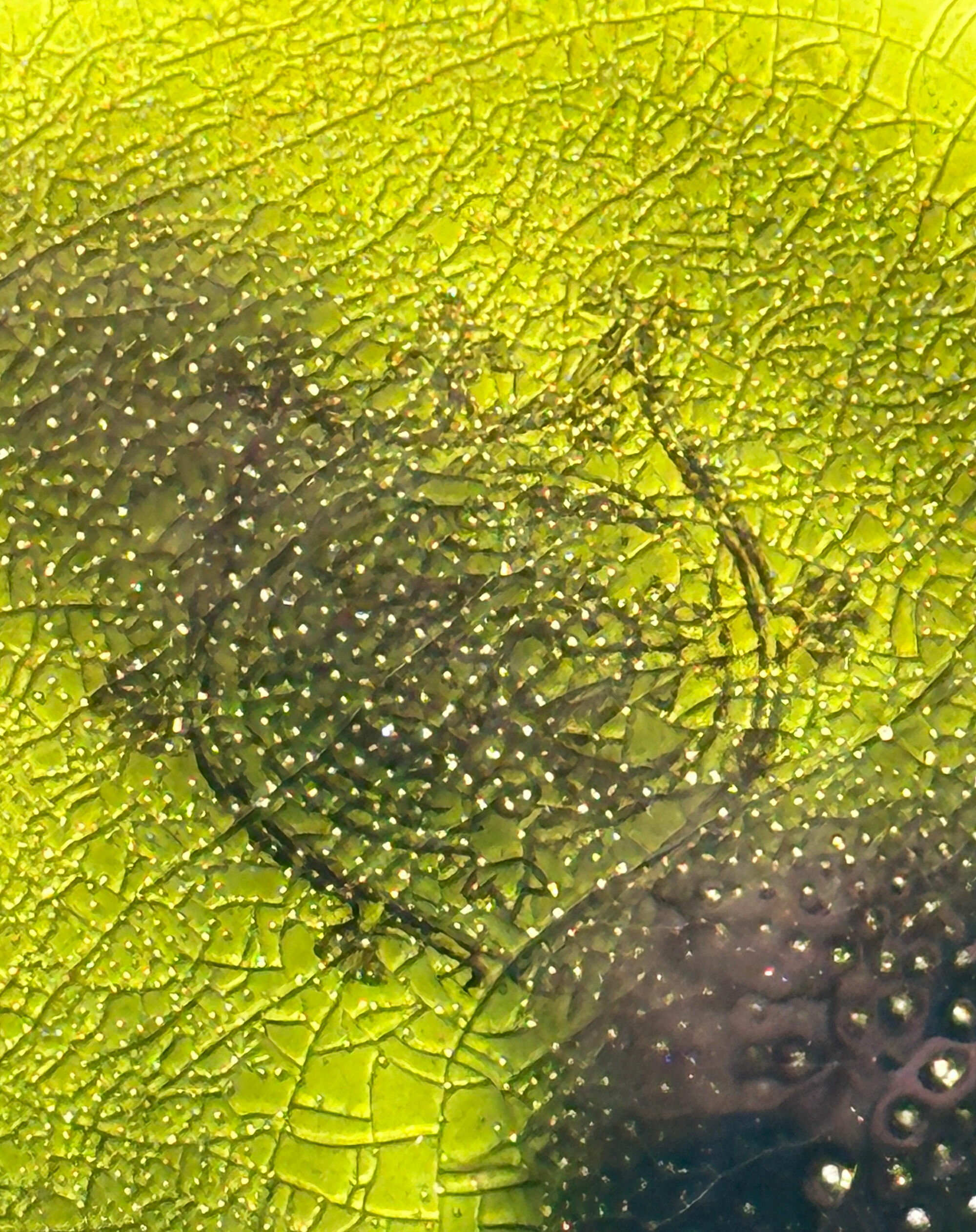 A pair of ceramic bottle vases, the bodies of compressed conical form above tapering stepped bases below narrow cylindrical necks, glazed overall in green with a craquelure effect, the colour lightening at the top and to the inside rim, the bases with feint and illegible marks, seemingly a shield shape with a cipher inside. There are no discoverable parallels for either the vases themselves or the marks underneath and provenance and dating are a matter of guesswork. The paste of the foot, though, is continental rather than British and the elegant Art Deco inspired form suggests French work from the 1930s. Whoever the creator, the result is striking with a clear contemporary appeal.| Size: | Ht 30.5cm, Width (max) 17cm, Base 9cm |