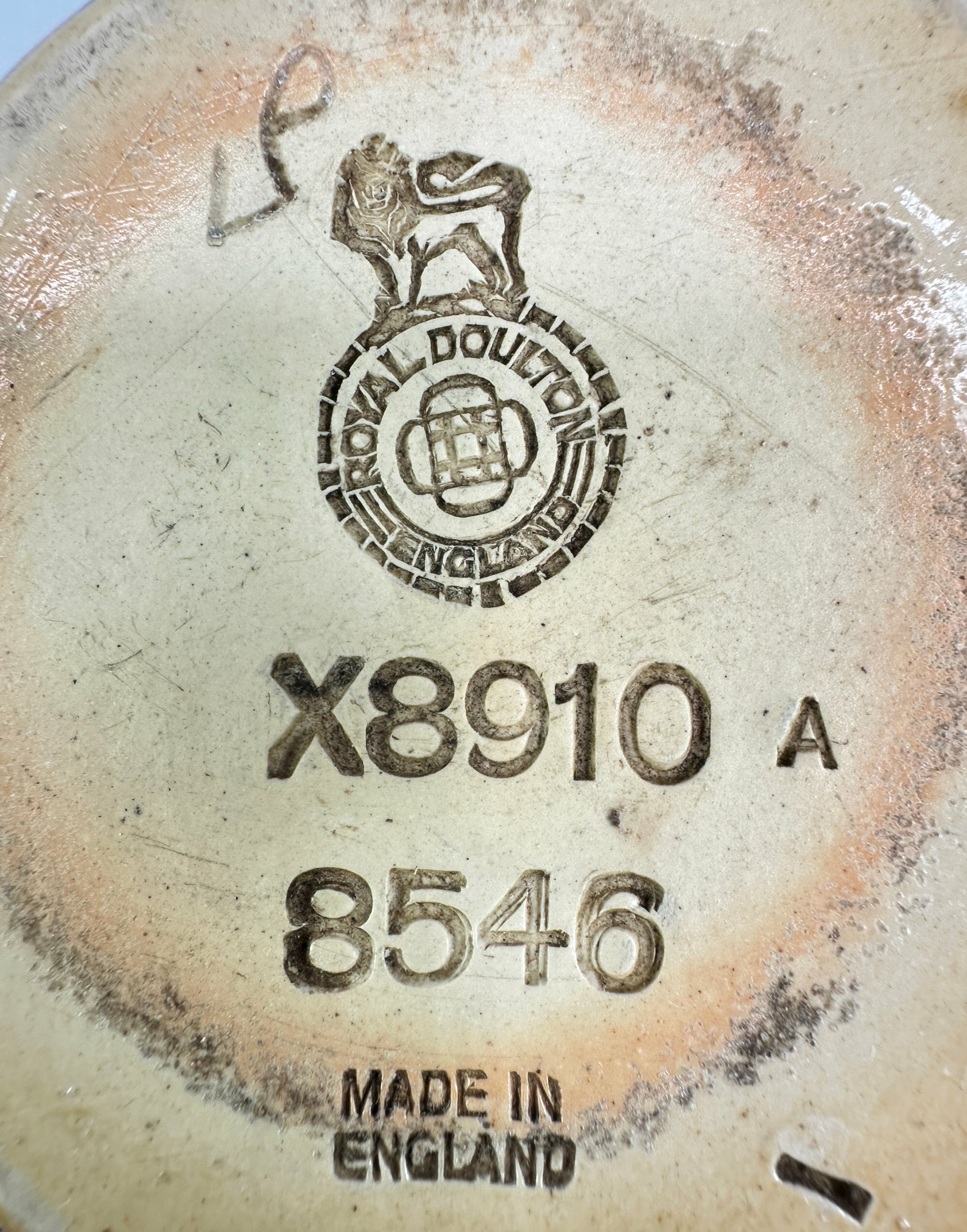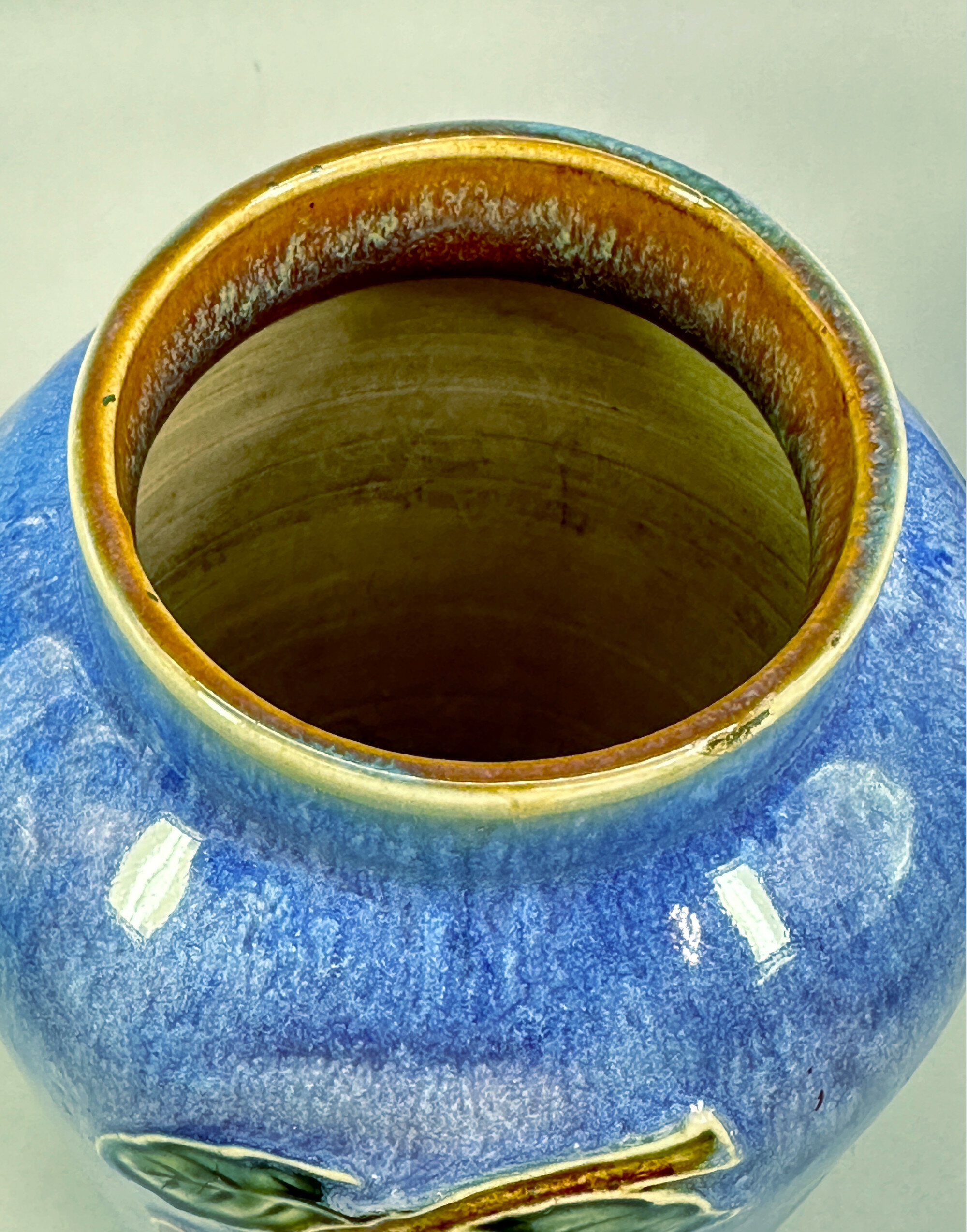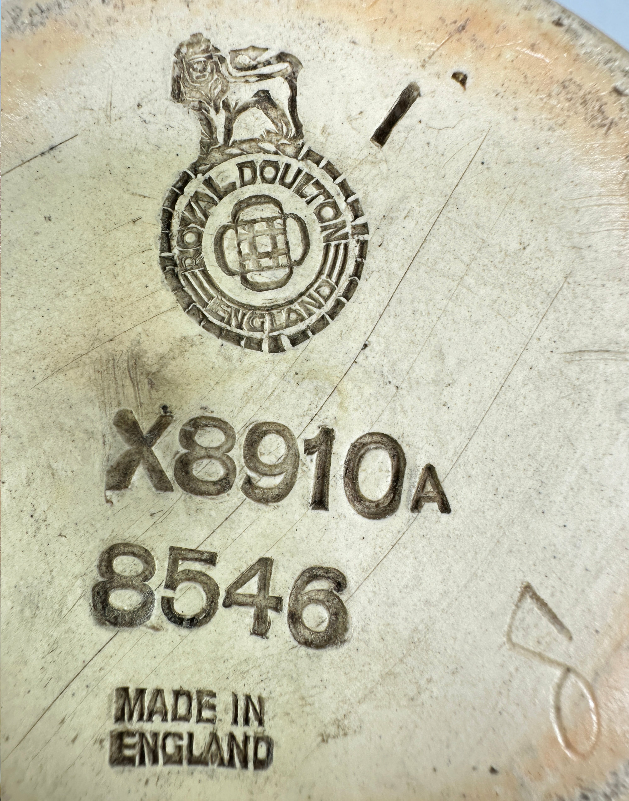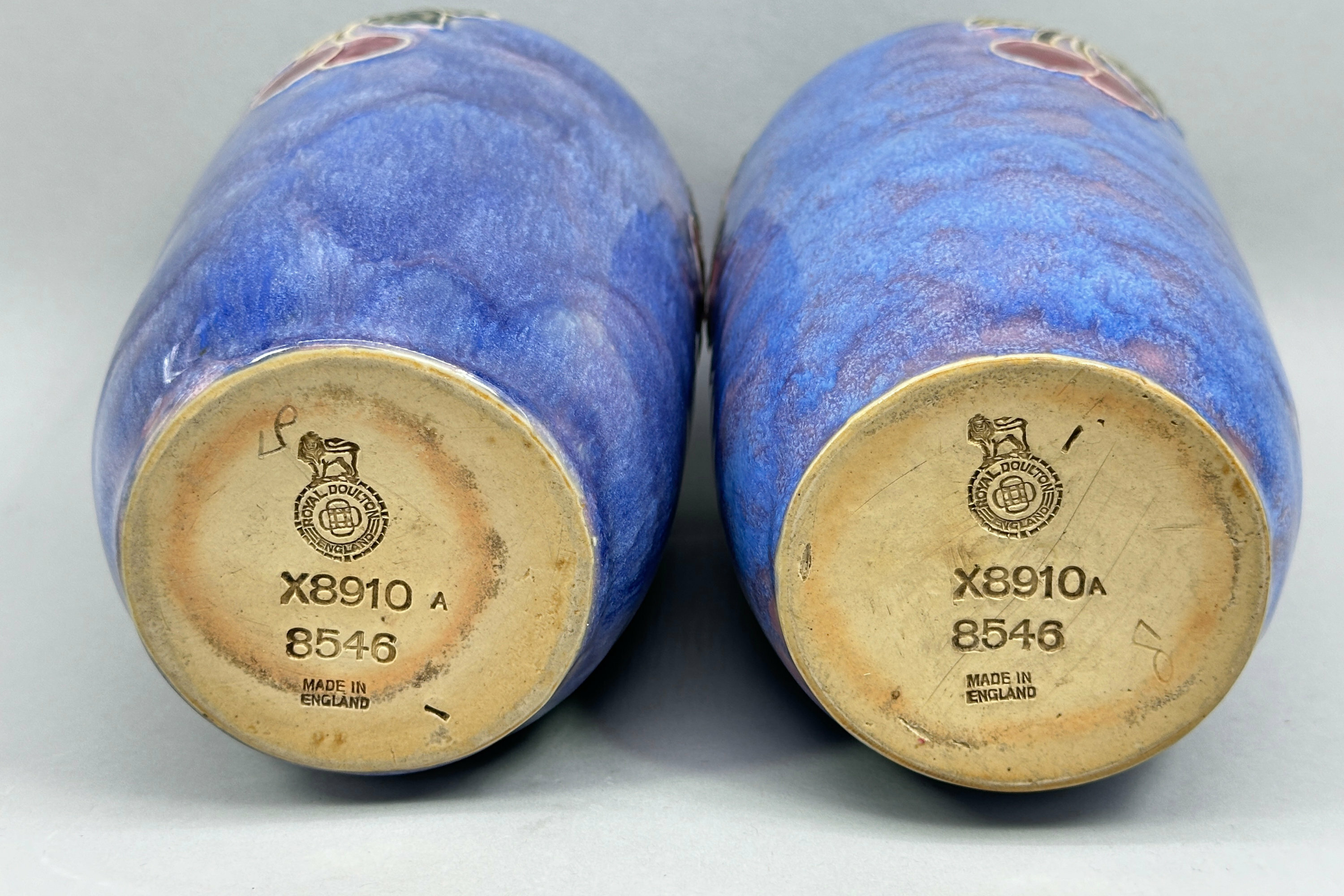 A pair of Doulton Vases of slightly tapering tubular form, incurving at the base and shoulder and with a short cylindrical neck, glazed overall in mottled shades of blue with a modelled spray of cherries to the front and two to the reverse, the interior glazed brown at the rim and the base unglazed with a impressed marks for Royal Doulton, the numbers ‘X8910A’ and ‘8546 and ‘Made in England’ with a scratched artist’s mark which seems to read ‘d’.The mark for Doulton is one of the standard impressed 'Royal Doulton England' marks where the lettering forms part of a circle combined with three thick lines and the centre is filled with four interlocking 'D's. The addition of a lion but not with the usual accompanying crown allows a fairly precise dating to between 1923 and 1927 which matches with the pattern number ‘8546’, one of the range of numbers used between 1924 and 1927. The artist’s signature cannot be identified but he/she produced a pair of vases of great skill and charm which follow the Art Deco trends fashionable at the time.