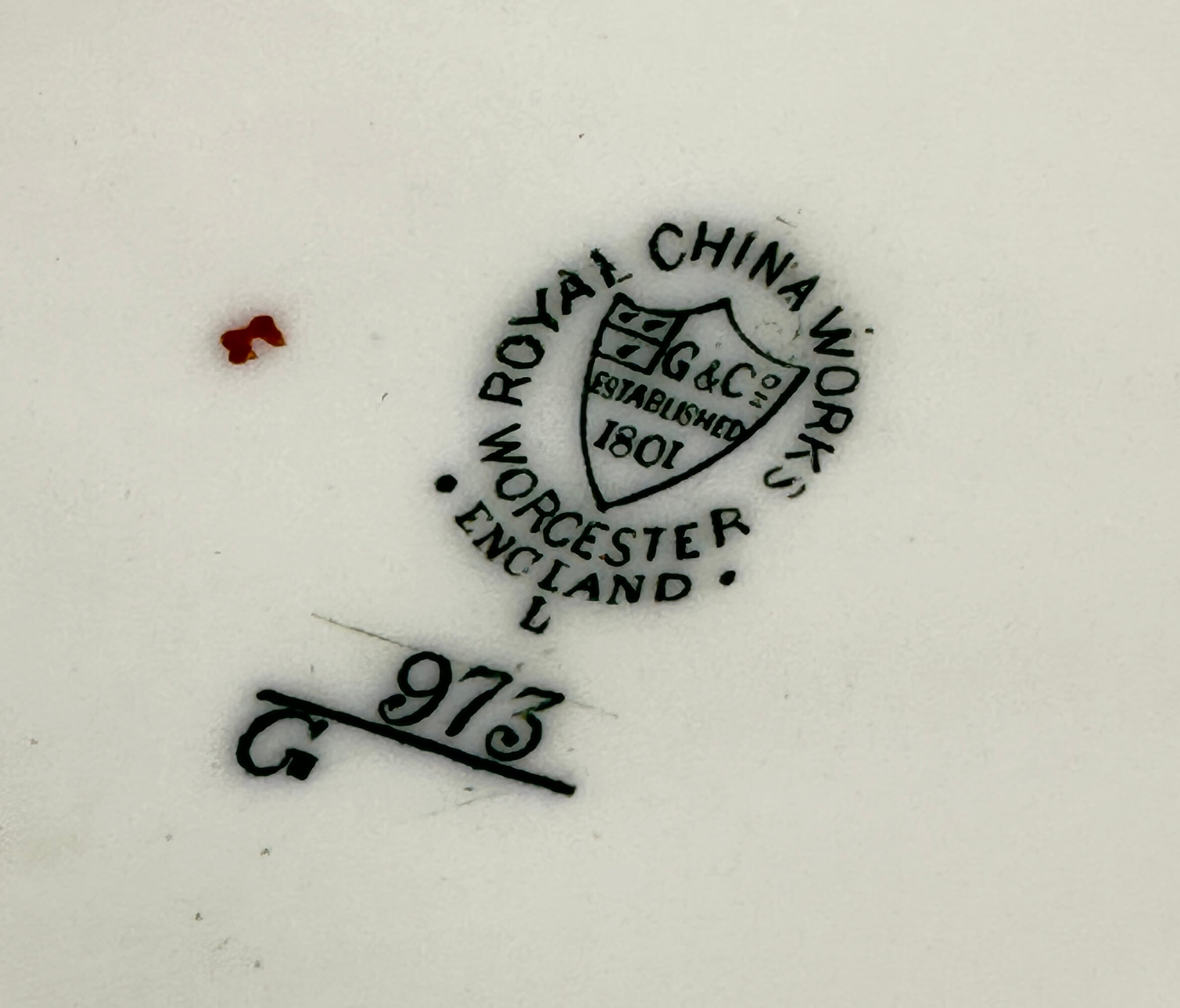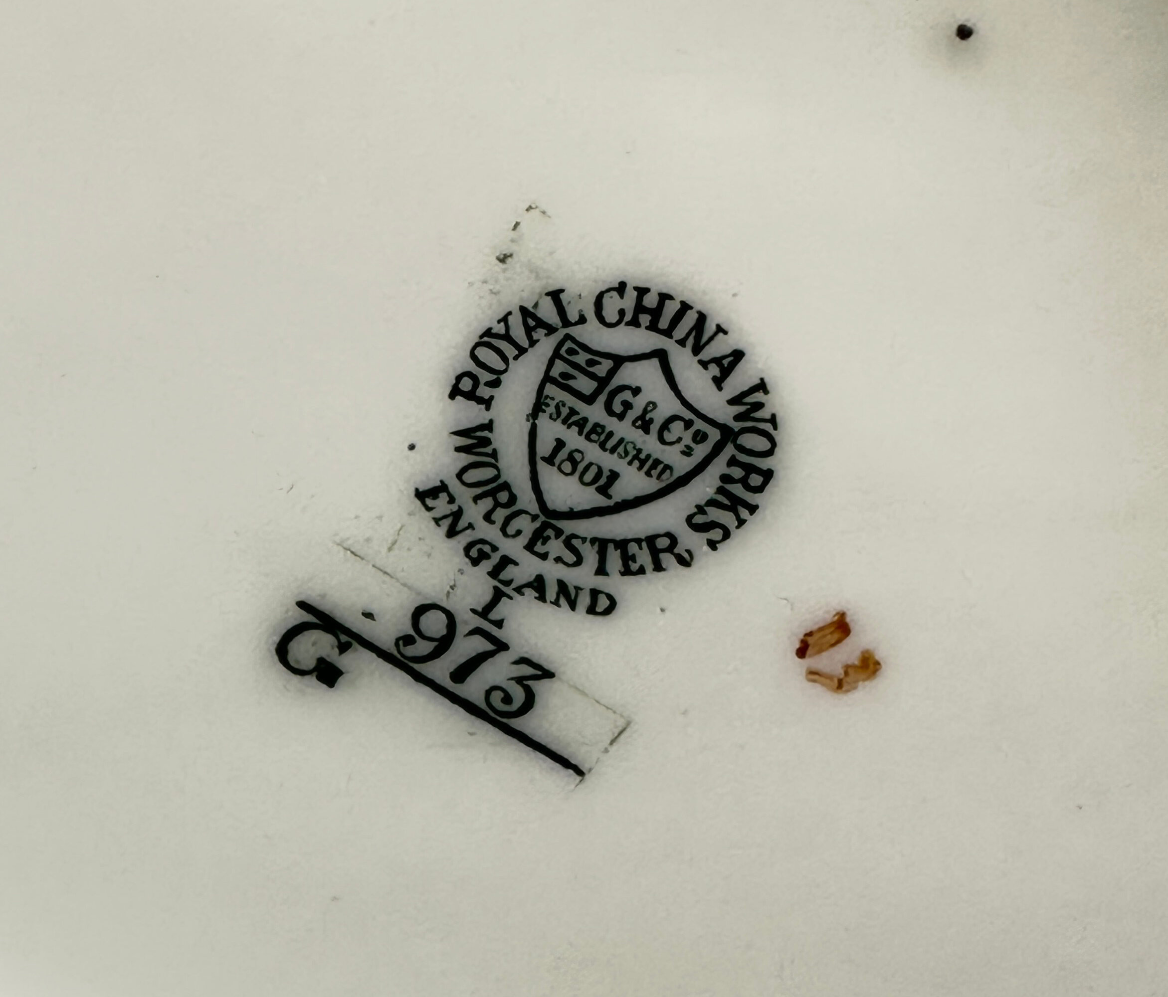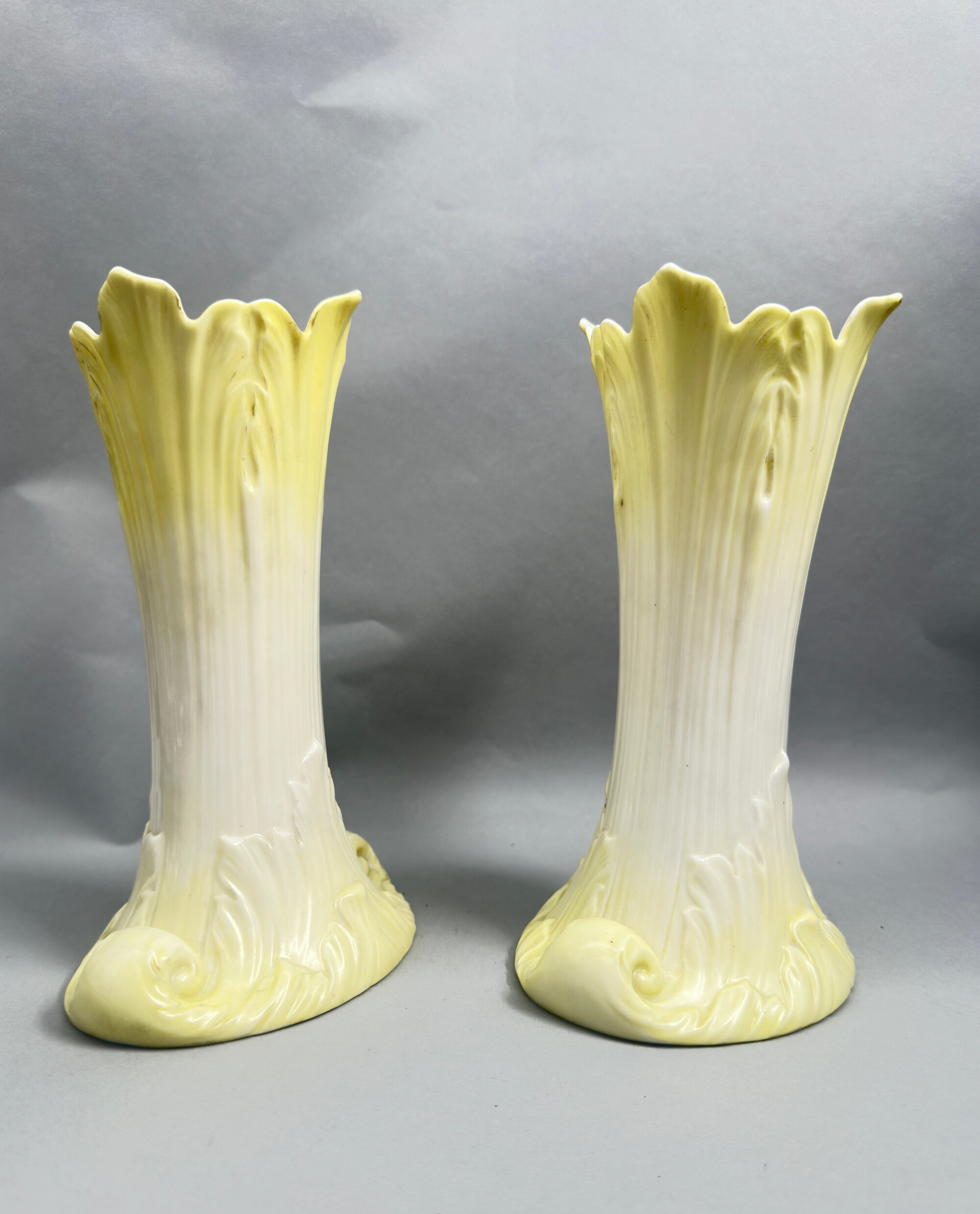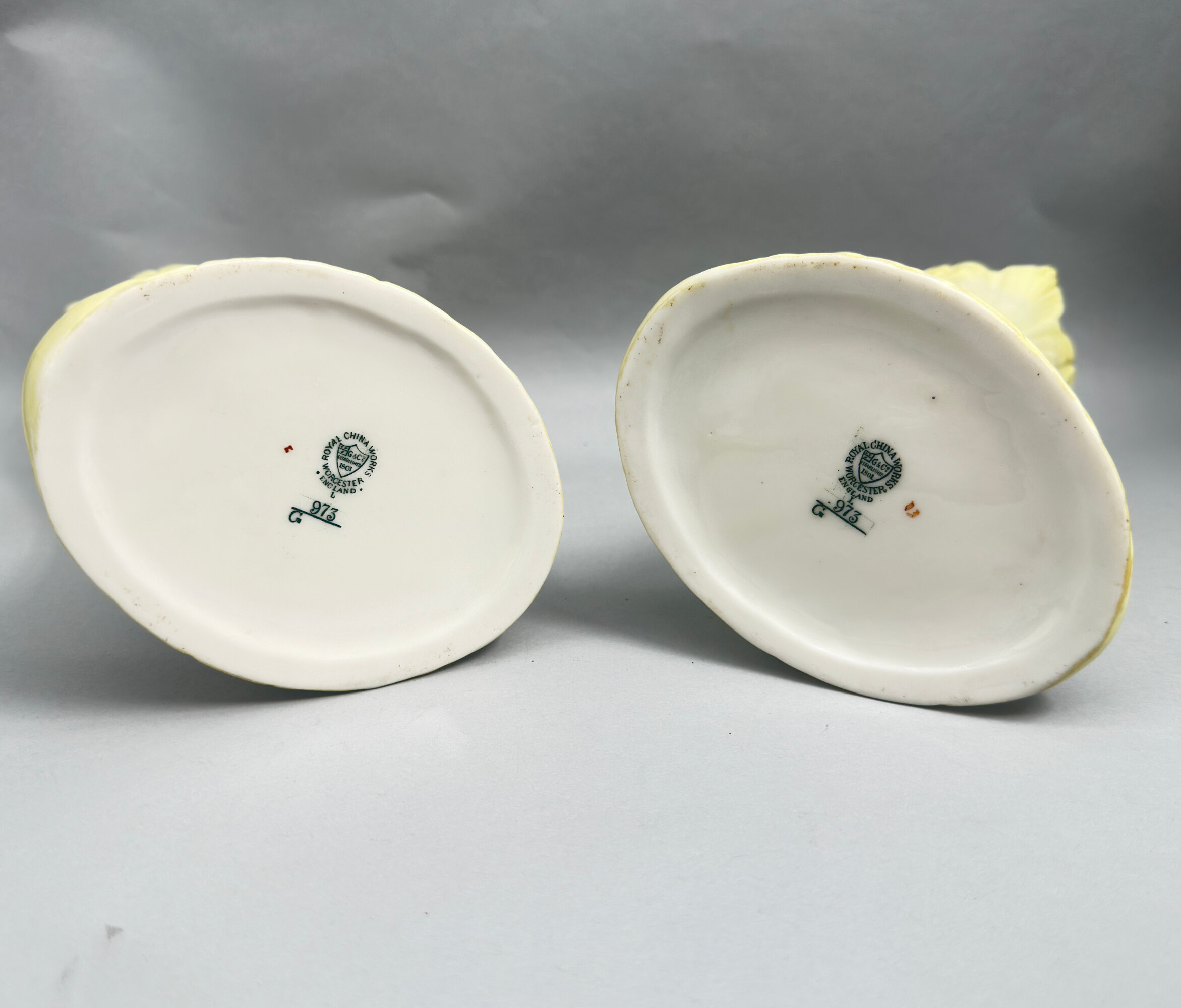 A pair of Vases of ovoid organic form, the concave bodies with flaring necks and spreading bases all modelled as stylised leaves, the cream coloured glaze at the centre merging into yellow at the top and bottom, the bases glazed white with identical printed marks, a shield with the wording ‘G&Co Established 1801’ surrounded by a circle of words ‘Royal China Works Worcester’ with below ‘.England.’ ‘L’ ‘973’ ‘G’ (separated by a line).The influence of the Art Nouveau movement, with its emphasis on organic and plant forms, is clearly seen here. The vases date to the early 1900s and were made by the ‘Grainger and Co’ branch of the celebrated Royal Worcester factory. The first porcelain factory at Worcester was set up in 1751 by John Wall (a doctor) and William Davis (an apothecary), along with 14 other businessmen. Fifty years later in 1801 Thomas Grainger (1783–1839) started a rival company ‘Grainger’s Worcester Porcelain’ and during the nineteenth century both companies traded successfully. However following the death of George Grainger, the son of Thomas Grainger, in 1889 the Grainger factory was sold to Royal Worcester who continued manufacture on its old rival firm’s St.Martin’s Gate site until finally closing the works in 1902. Ivory style porcelains were one of the specialities of this brief manufacturing period and the date mark ‘L’ which appears on these vases is for the year 1902, just before the two concerns were completely merged.