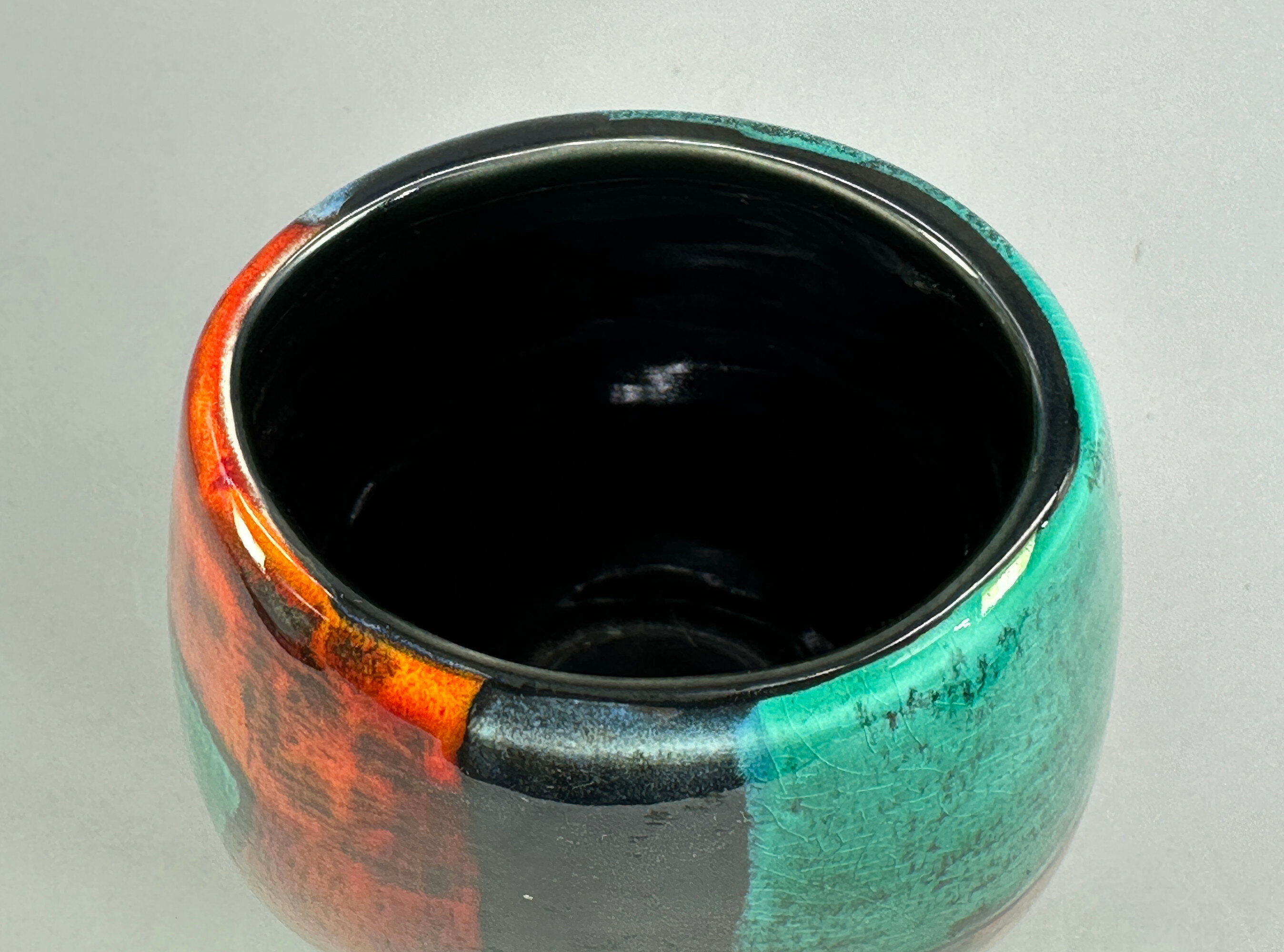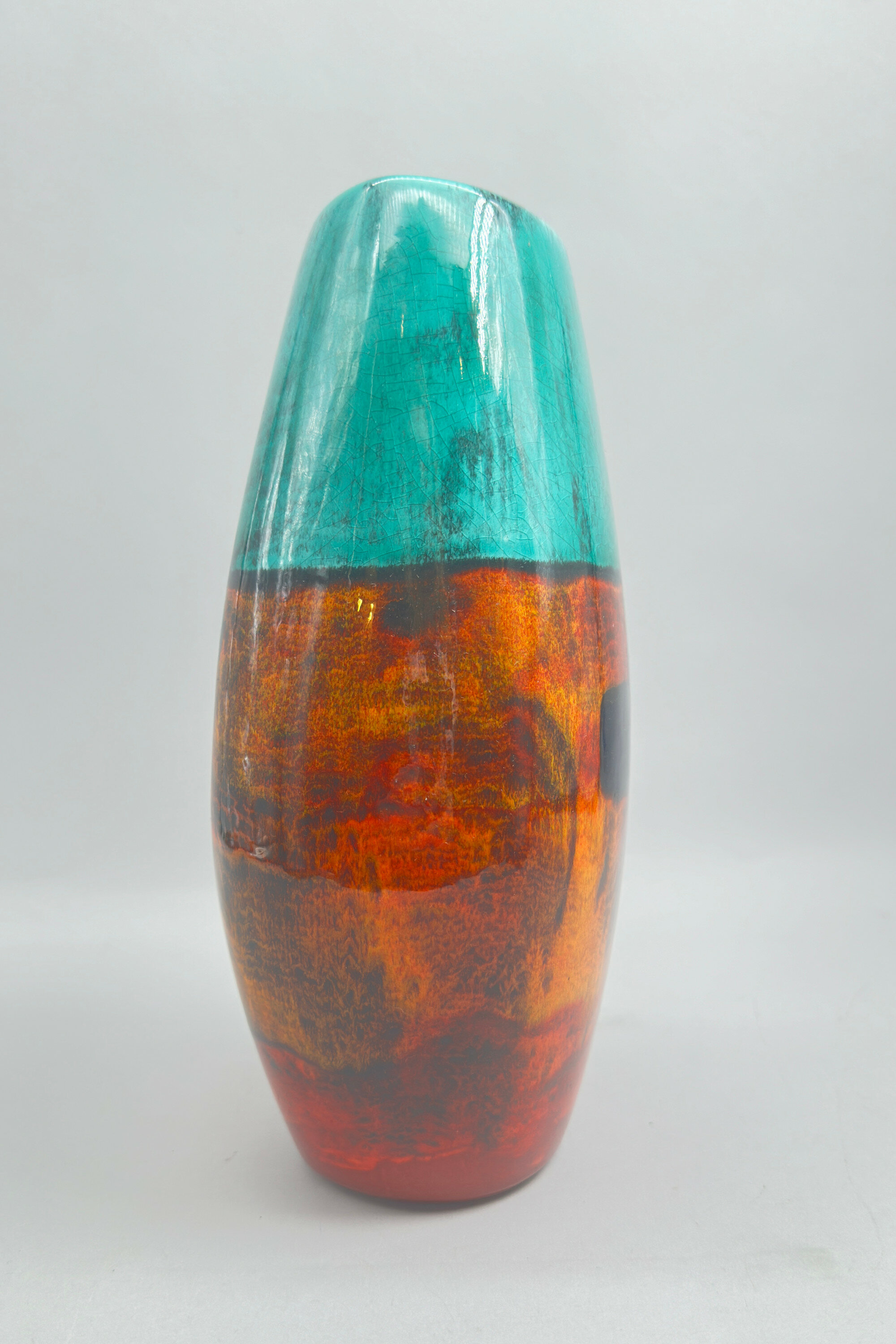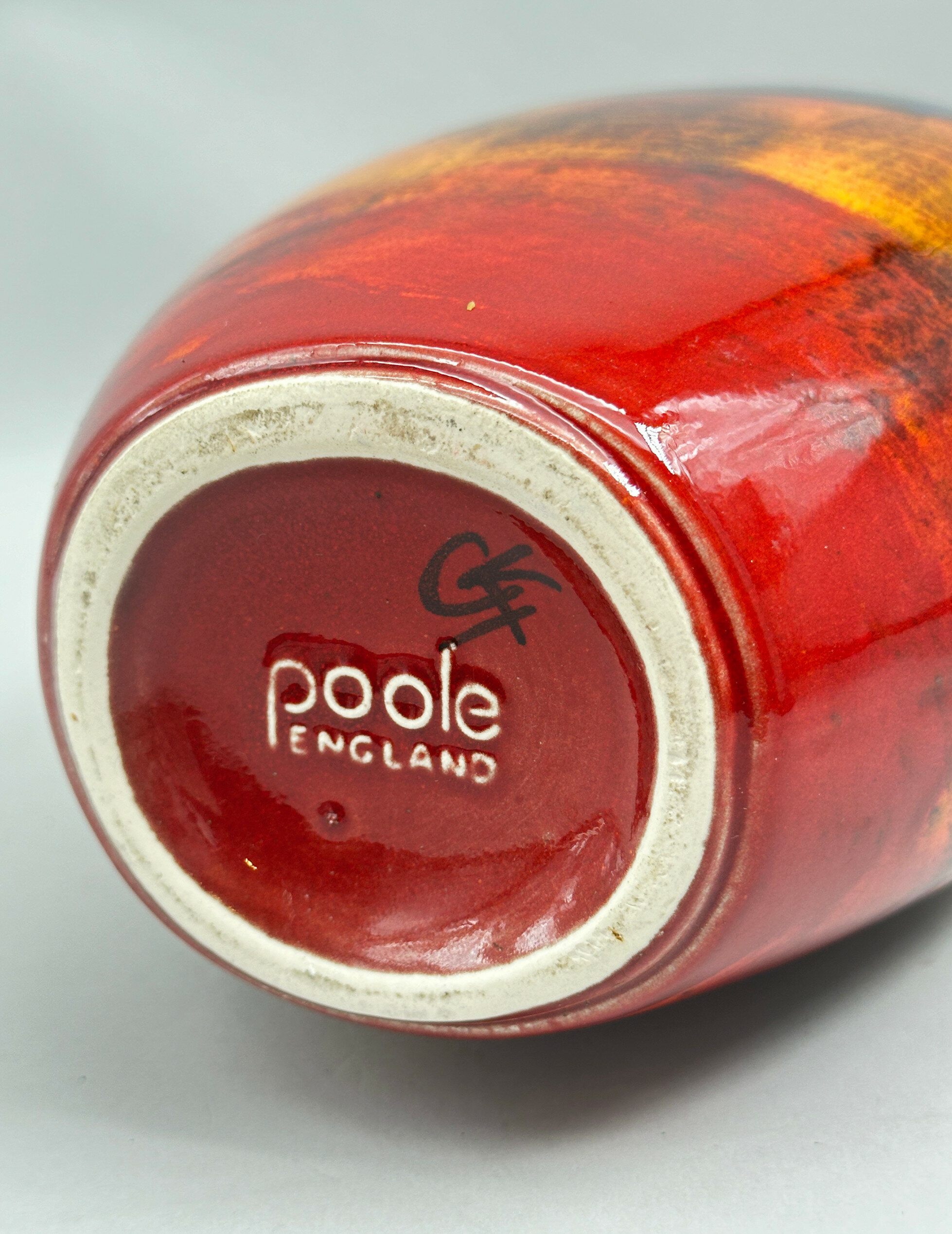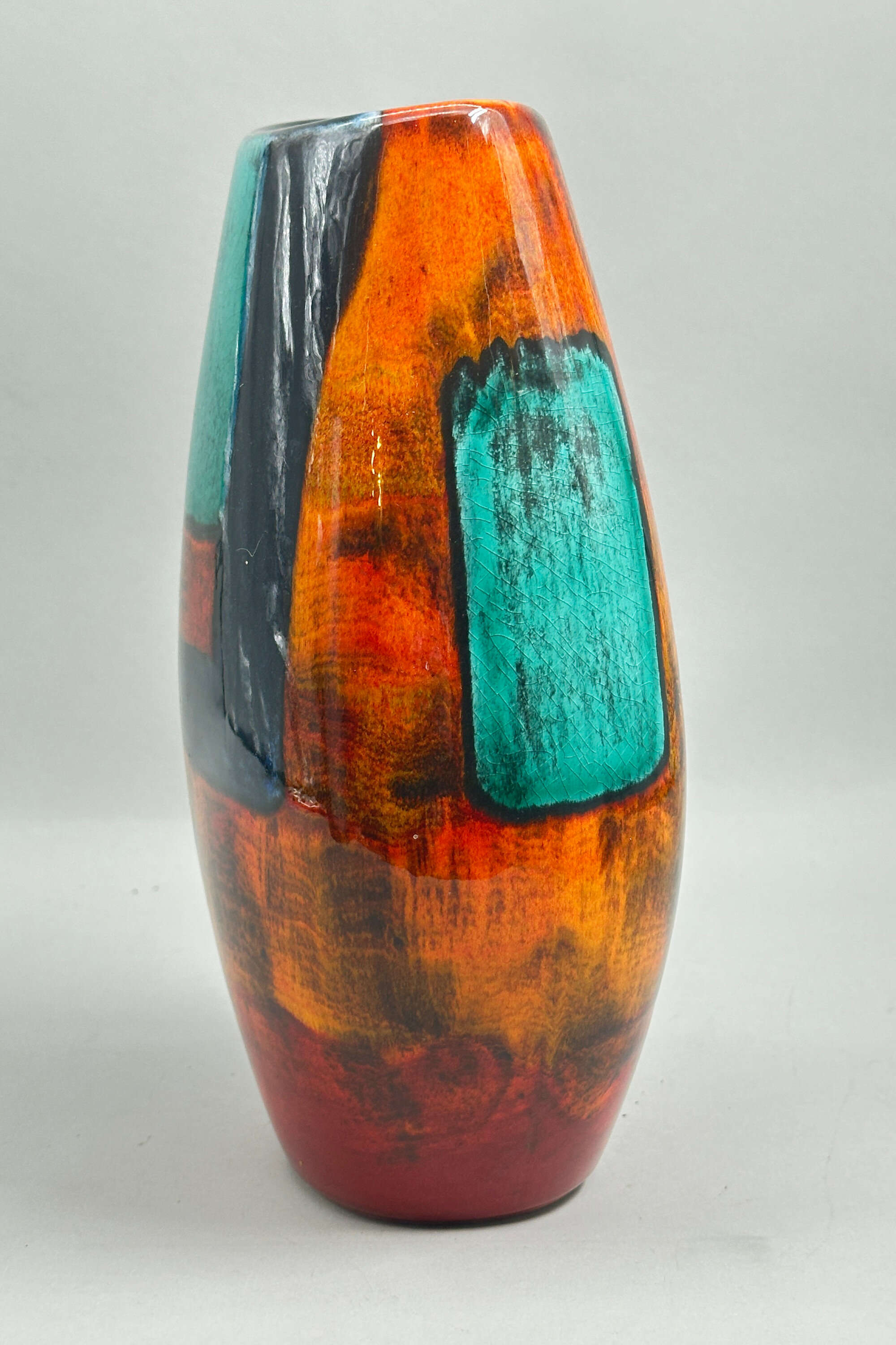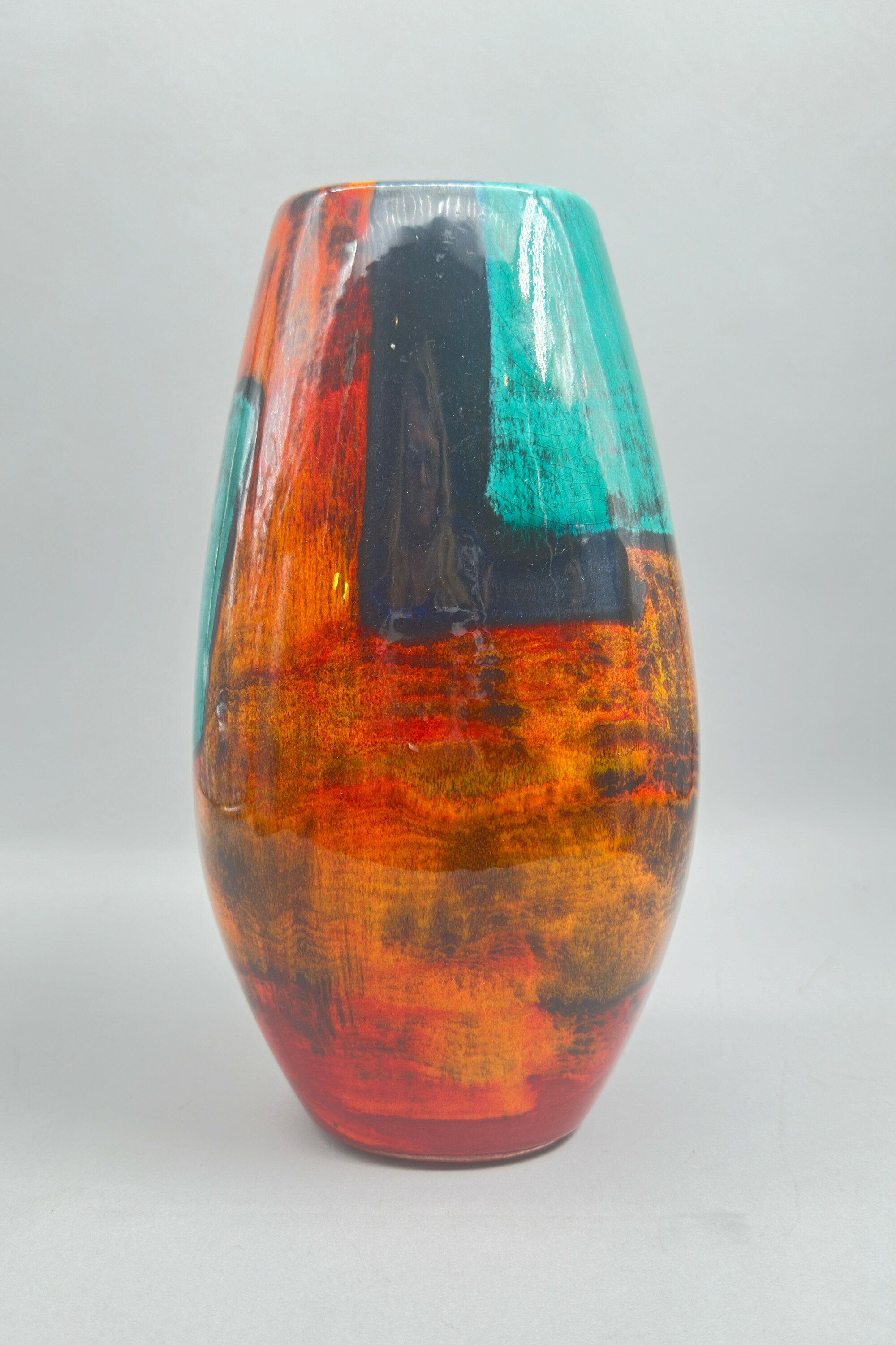 A ceramic vase of flattened ovoid form, decorated with abstract designs in multicoloured glazes, the interior glazed black and the base glazed in tomato red with the white glaze mark ‘Poole England’ and a script signature possibly reading ‘GF’. This vase is a good example of the ‘gemstones’ pattern produced by Poole Pottery in the 1980s but continued thereafter. Abstract slabs of coloured decoration in various shades are combined with a mottled ground in orange, red and grisaille. The shape is generally termed torpedo and was made in a variety of designs and colourings. The glaze effects here are particularly pleasing and well complement the simplicity of the shape.| Size: | H 26 cm, W 16 cm, D 10 cm |