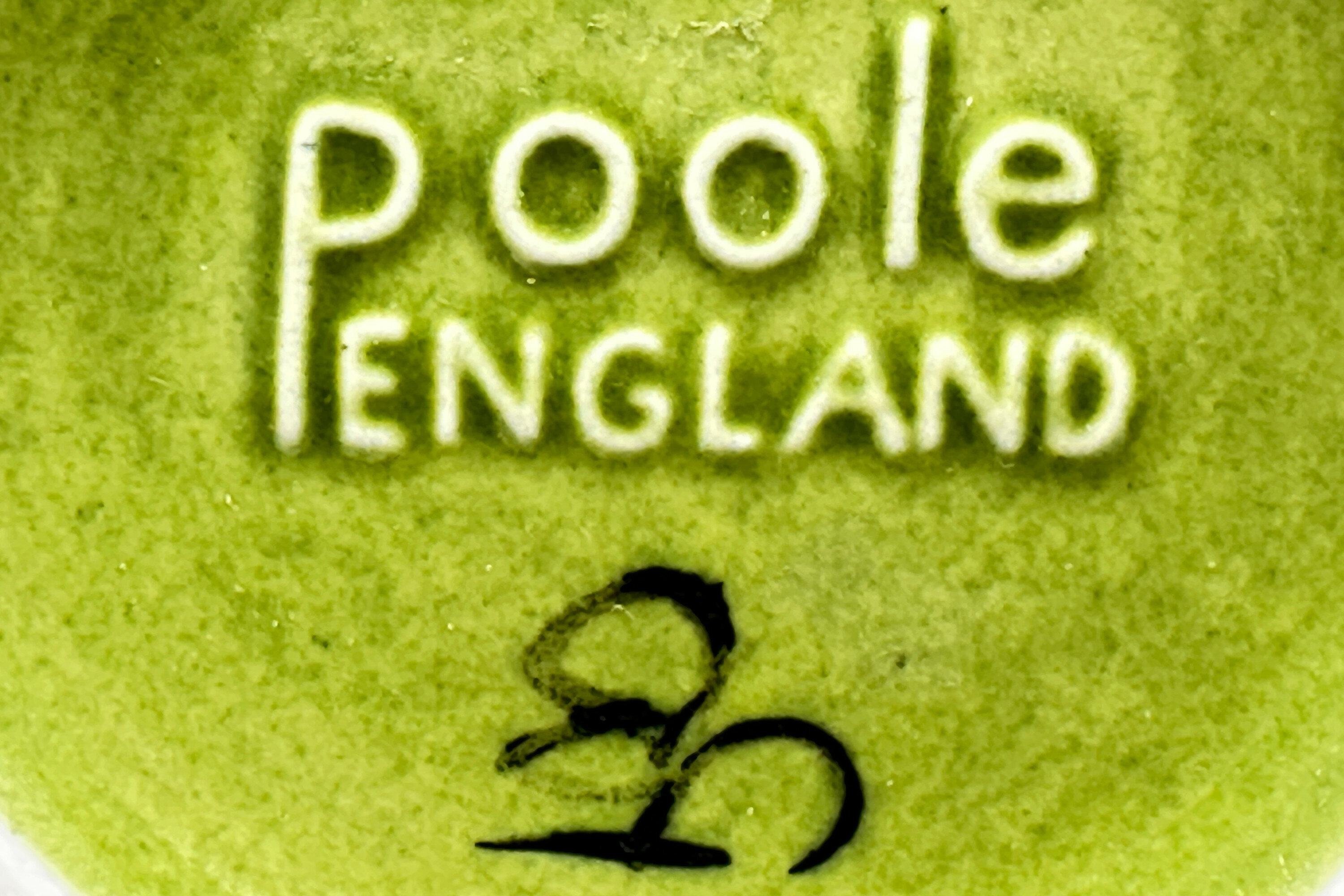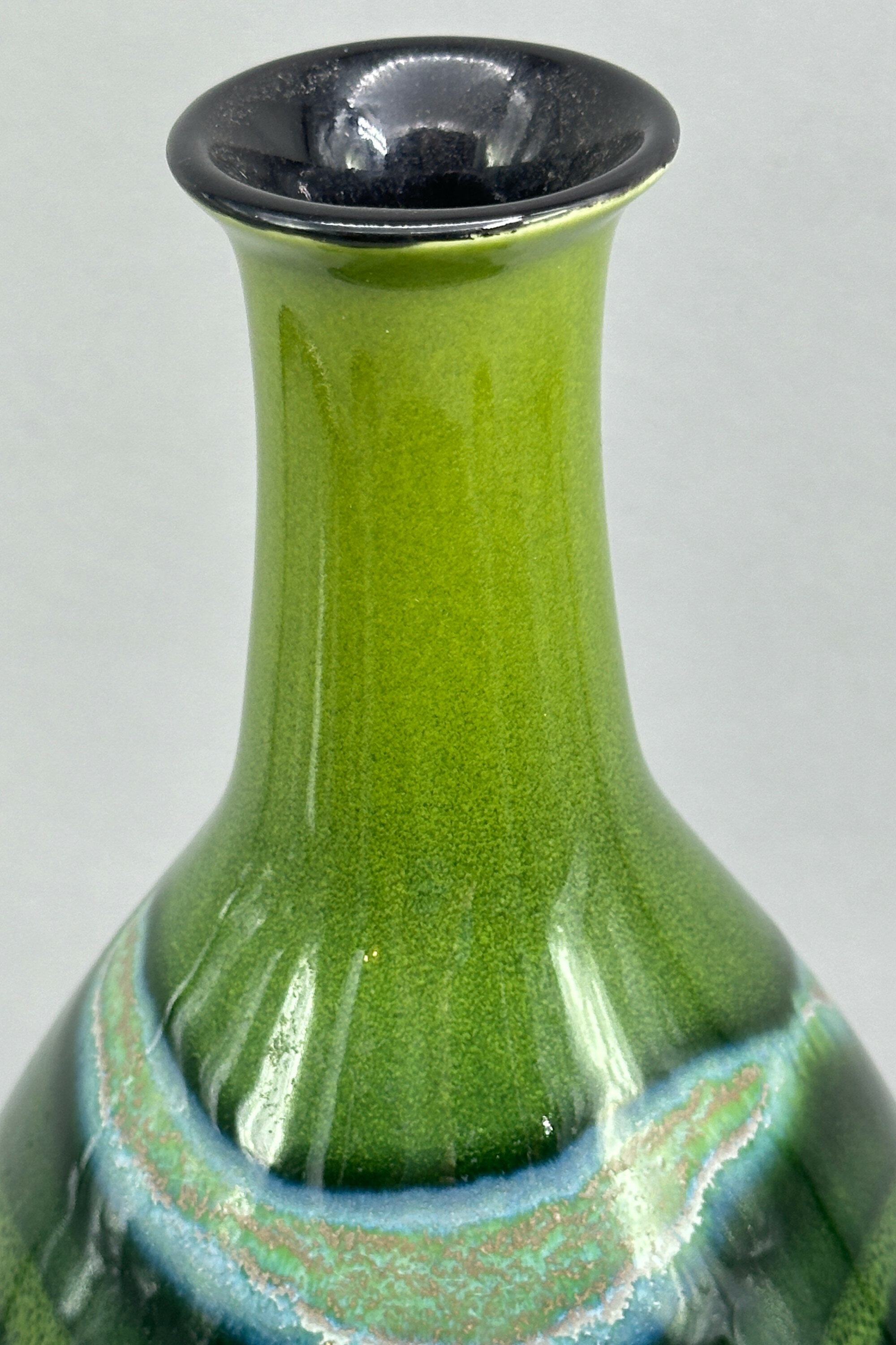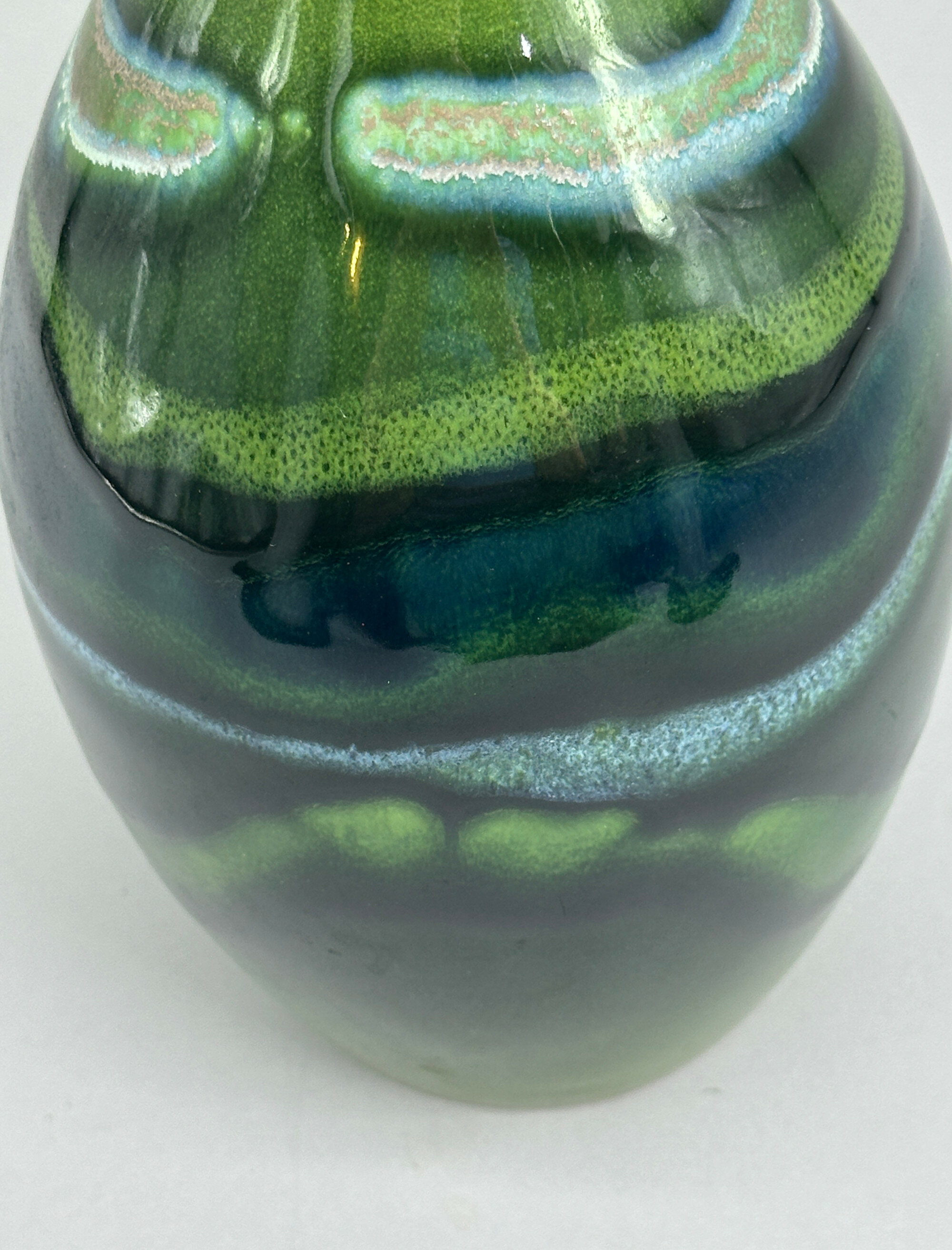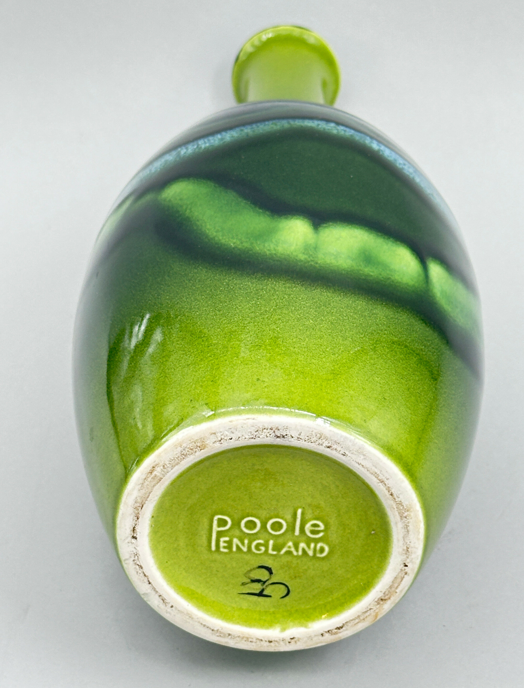 A Poole Pottery bottle form vase, the slender ovoid body rising to a short narrow neck, the rim slightly everted, glazed overall in a mixture of mottled green and blue ‘wave’ designs which blend into one another, the base glazed green with a raised mark for ‘poole’ ‘england’ and two painted initials ‘JB’.This fine quality vase is from the Maya range made by Poole Pottery, some of the pieces still being in production today and described in the maker’s catalogue as follows “Poole Pottery’s Maya collection is inspired by British landscapes and earthy tones. The greens and blues in this stunning range represent the earth meeting the sky in a natural yet bold design. Here at Poole Pottery, all our Maya ceramics are hand-cast and made using our signature reactive glaze in the famous Middleport Pottery in Staffordshire. The distinctive pieces you see here are created via our Living Glaze technique, where layers of colourful glazes react with one another to create a unique, glossy and dynamic finish.” But this particular form does not appear in the current catalogue and does not seem to be otherwise available. The form of the mark appears on other Poole pieces of more recent manufacture and dating is probably to around twenty years ago. The initials are for the artist’s signature and Poole write “Items are personalised with the artist's own individual mark, adding value to the collectability of each piece.” Given its scarcity, this vase would make an interesting addition to a collection of Poole Pottery aside from being a highly decorative item in its own right.