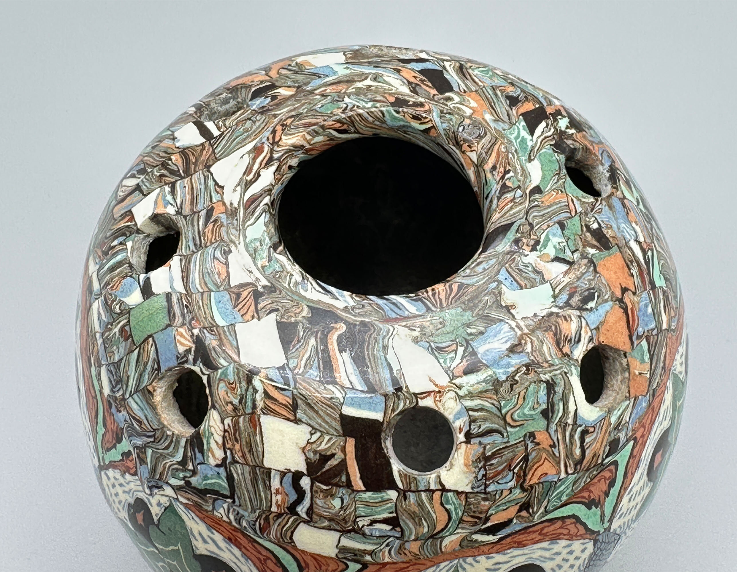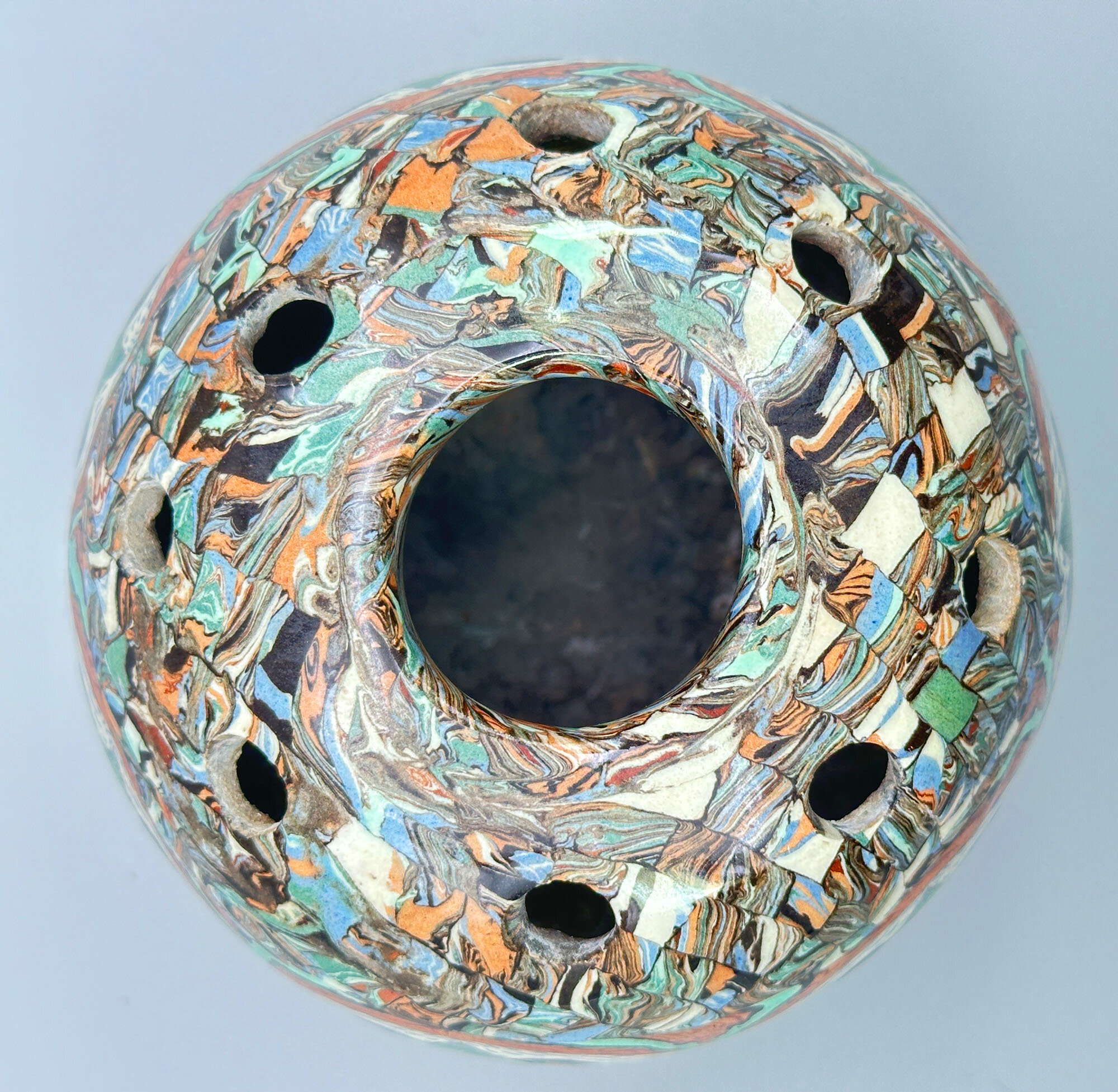 An earthenware vase of globular form pierced on the shoulder with six holes and with a circular opening at the top, probably for the display of small flowers, the base with an unglazed foot bearing impressed marks for ‘Vallauris’ and ‘Gerbino’, decorated overall with detailed and colourful mosaic patterns incorporating floral motifs.Known for its ceramics since Roman times, when the deposits of clay found locally acted as stimulus for the production of pottery, the French Riviera town of Vallauris has been called the ‘city of 100 potters’. Pottery has been made there continuously since the classical period with a growth in production in the late nineteenth century followed by the establishment of various well known ateliers in the twentieth and the residence of Picasso himself who is said to have produced over 3500 pieces there.