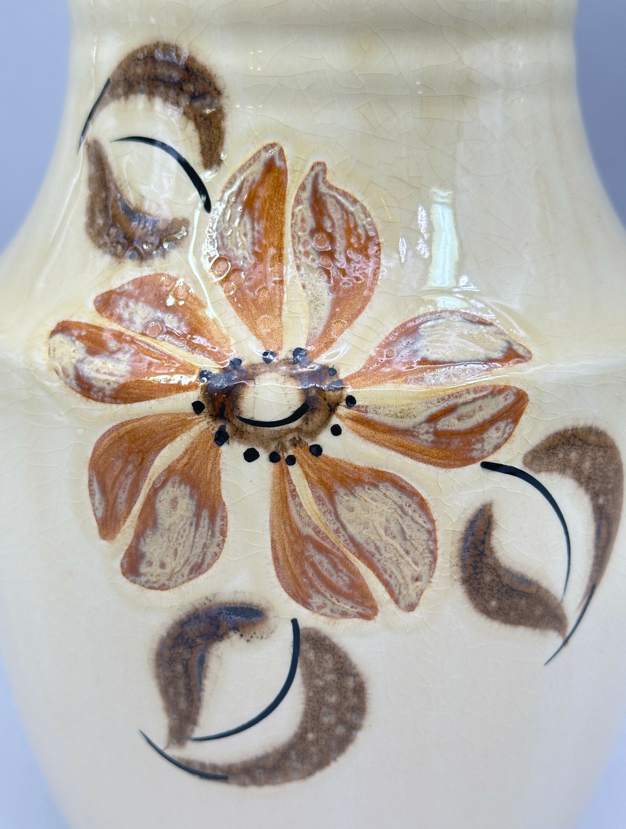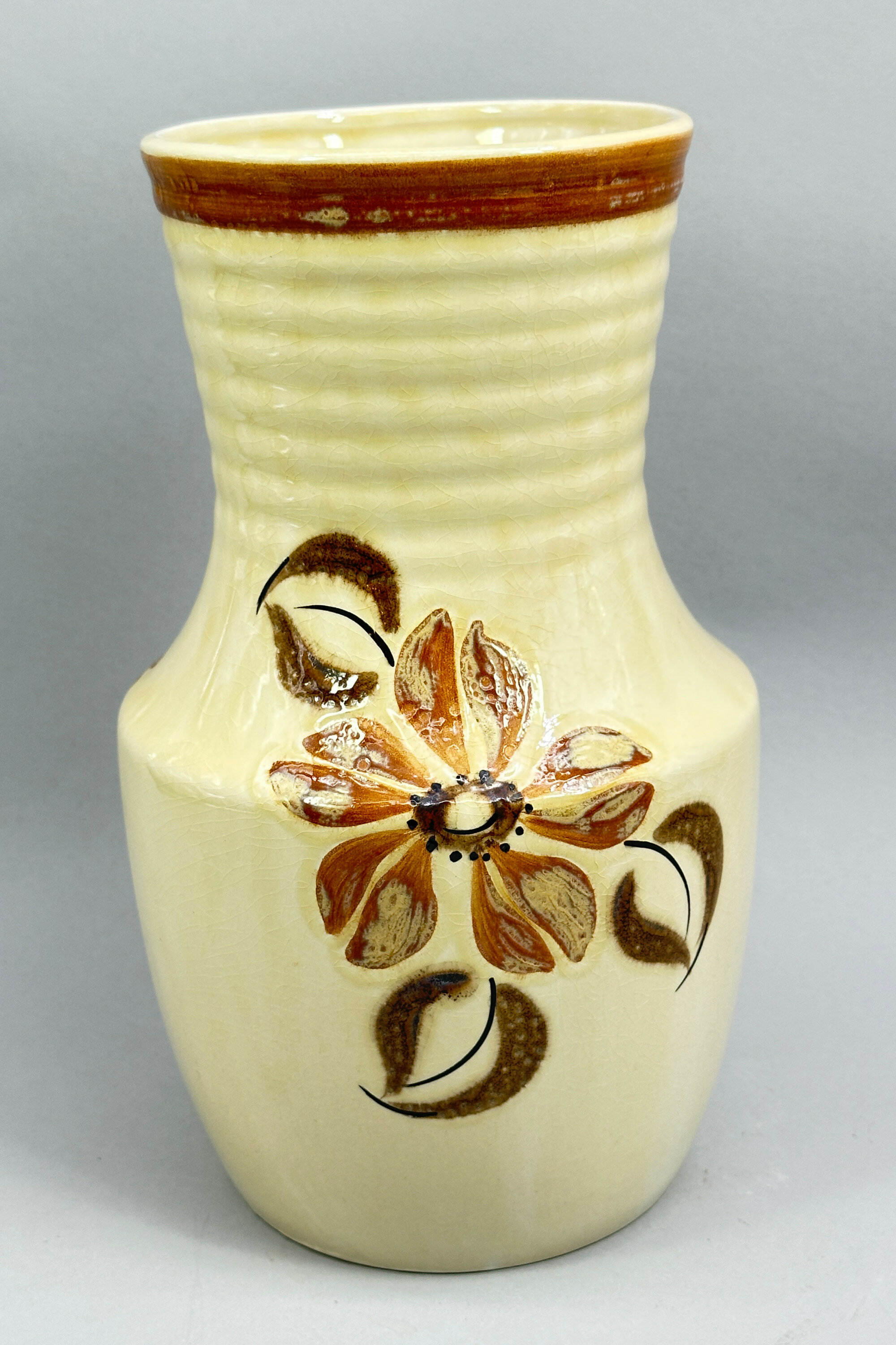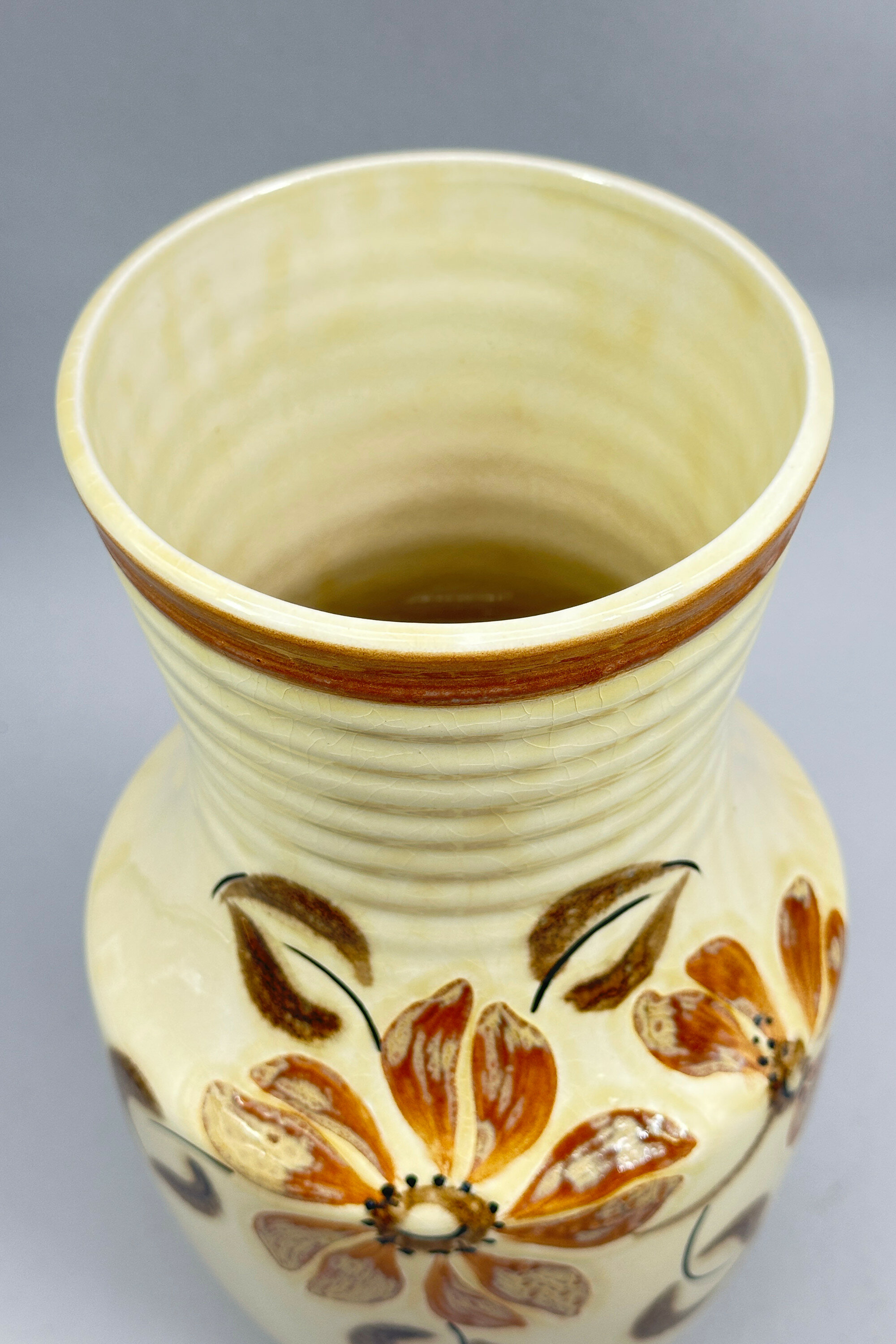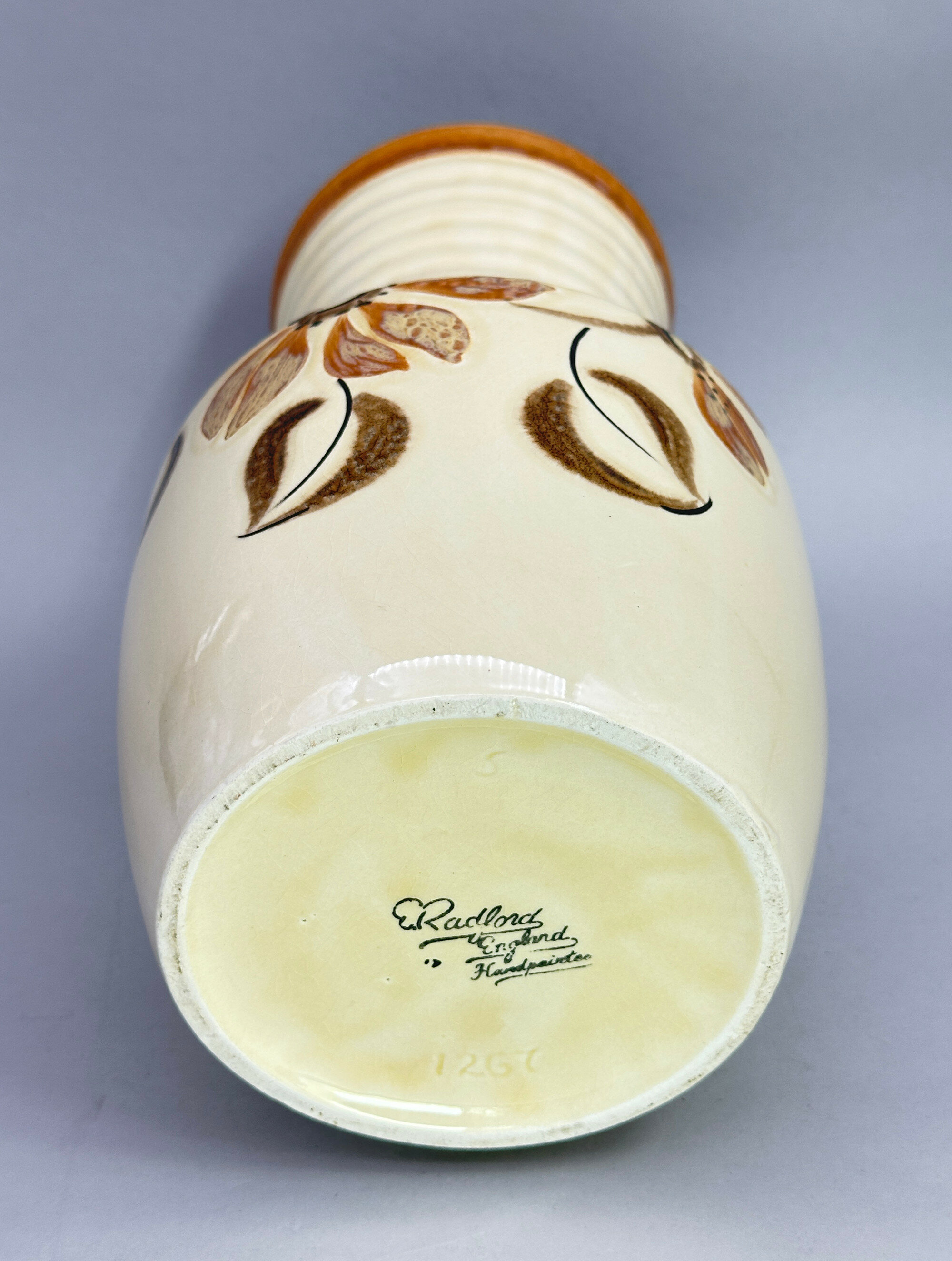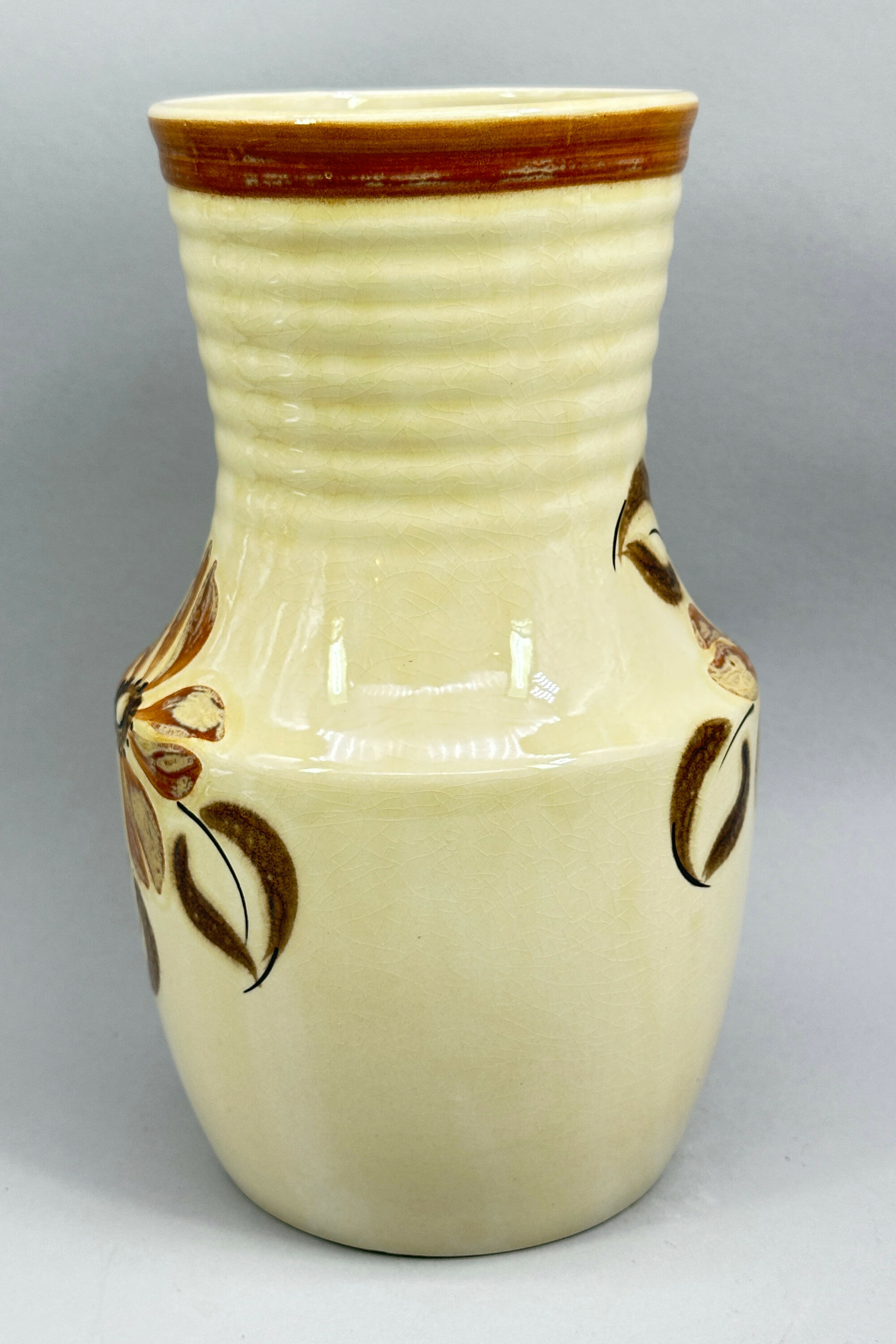 A ceramic vase of broad shouldered ovoid from with a wide ribbed neck slightly flaring at the top, glazed overall in light yellow with a feint craquelure, a brown band at the top and the body boldly painted with two floral sprays in shades of brown, the base with a printed script mark ‘E.Radford’ ‘England’ ‘Hand painted’ and the impressed numbers ‘1267’.There were, in fact, two craftsmen working in the C20th British pottery industry with the name Edward Radford, father and son. Radford senior worked for Pilkington’s Royal Lancastrian Pottery in Manchester from 1903 until his retirement in 1936, acting as their main thrower. Radford junior joined his Father in 1905, but the First World War intervened, in which he won a Military Cross for his actions at Passchendaele in 1917 and afterwards he settled in Stoke on Trent, the heart of Britain’s pottery industry. An association developed with H.J.Wood’s Alexandra Pottery in Burslem who produced a range of wares bearing his name in the 1930s, although Radford himself may have acted as more a salesman than the designer. Production continued after the war and even after Radford’s retirement in 1948. The form of mark used here implies a later dating and both the shape, indicated by the model number underneath which is found on other vases with different decoration, and the decoration itself suggest the post war era, probably in the 1950s. There is, though, a modest charm here which would blend comfortably with a modern interior.