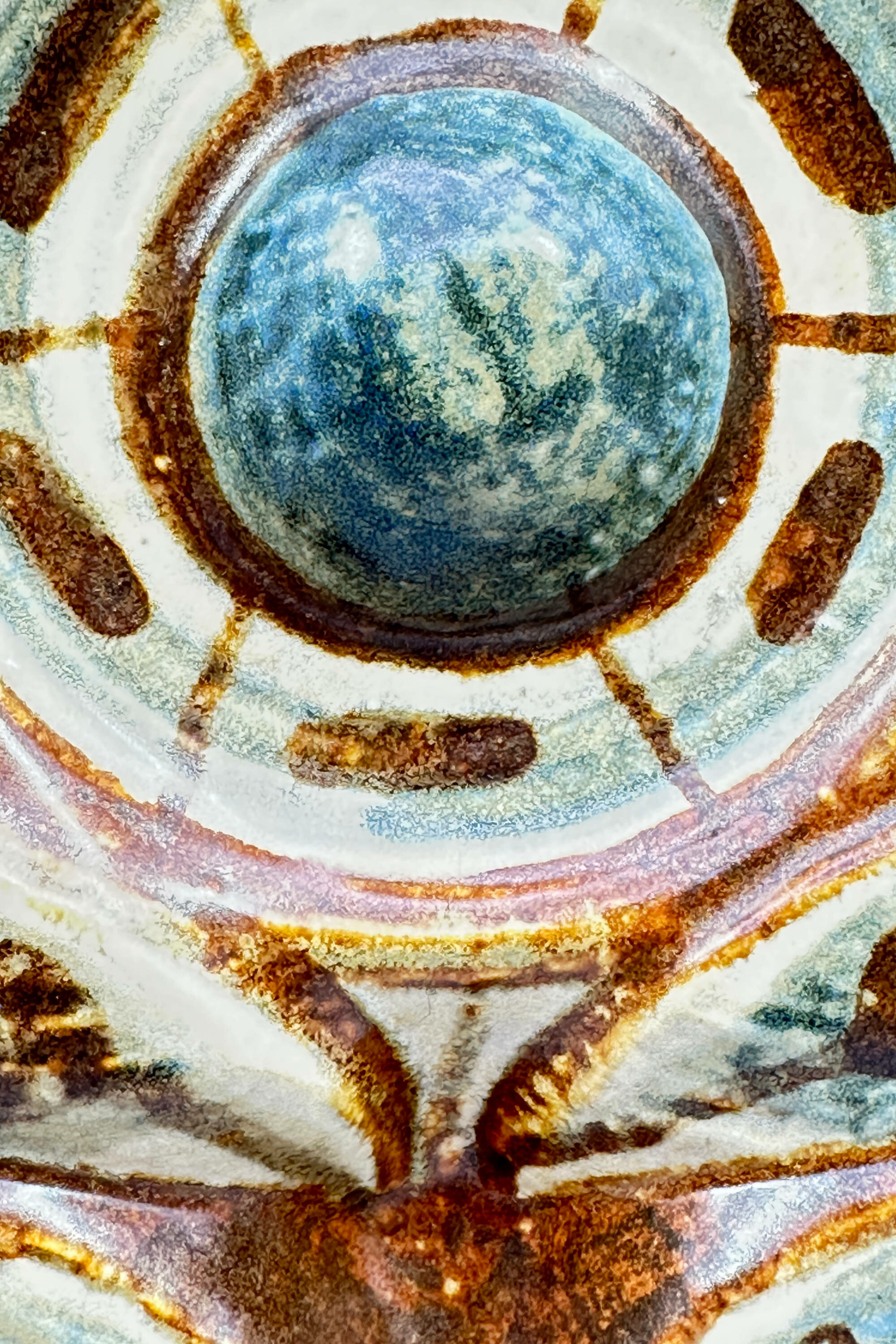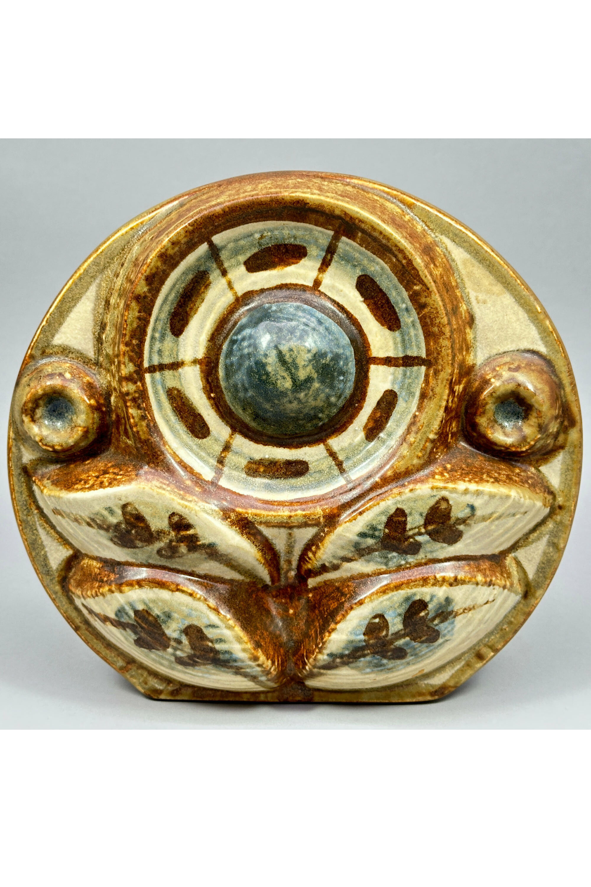 A stoneware wall vase of flattened rounded form, decorated to the front with an abstract floral design in shades of cream, brown and blue/green, the sides and base with a brown speckle glaze and the back unglazed and pierced for hanging. On the side is the first name of the designer ‘Noomi’ and at the back are impressed script marks ‘Søholm’ ‘Denmark’ ‘Stentøj’ with the numbers ‘3575’ for the model.The company Søholm Stentøj was founded by Herman Sonne Wolffsen and Edvard Christian Sonne in 1835 at Rønne, the principal town of Bornholm, a Danish island off the south coast of Sweden. One of the most respected of the Danish potteries it continued producing a wide range of ceramics until the firm closed in 1996. Noomi Backhausen was a designer for Søholm from 1966 to 1990 and set up her own pottery in Rønne in 1996 after the closure of her old employers. This wall vase is a typical example of her abstract organic designs and would be a worthy addition to a collection of twentieth century Danish design.
