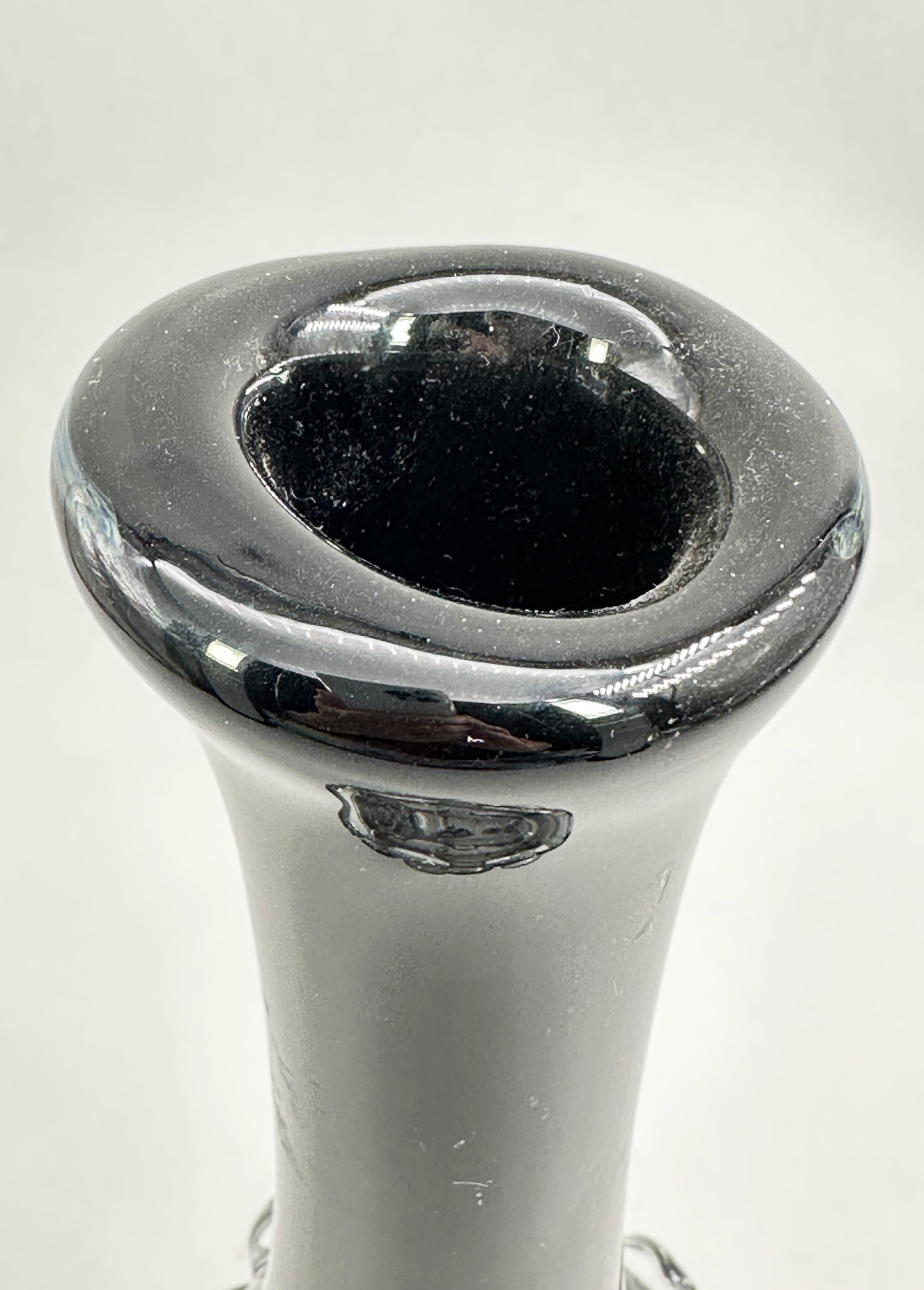 An art glass vase of slender bottle form, the lightly flaring rim resembling a spout, the black body encased in clear glass with irregular modelled shapes often held to resemble thumbprints. This vase was made by the firm Aseda Glasbruk which was a Swedish glass factory located in Åseda, Kronoberg County. It began production in 1947 and continued through until 1975 when it was incorporated into the Royal Krona group, which unfortunately then went into liquidation in 1977. Åseda Glasbruk's chief designer was Bo Borgstrom, who graduated from Stockholm's Swedish School of Arts and Crafts in 1951. Known as an artist in ceramics Borgstrom joined the firm in 1961 and perhaps his earlier work influenced his later creations for his new employers and can be seen here in what is certainly rather a sculptural piece. The design shows the influence of other pieces produced in the 1960s and early 1970s allowing us to place the date of manufacture at around that time. It is a fine example of clean Scandinavian elegance.| Size: | Ht 30.5cm, Width (max) 11cm, Base 7cm |