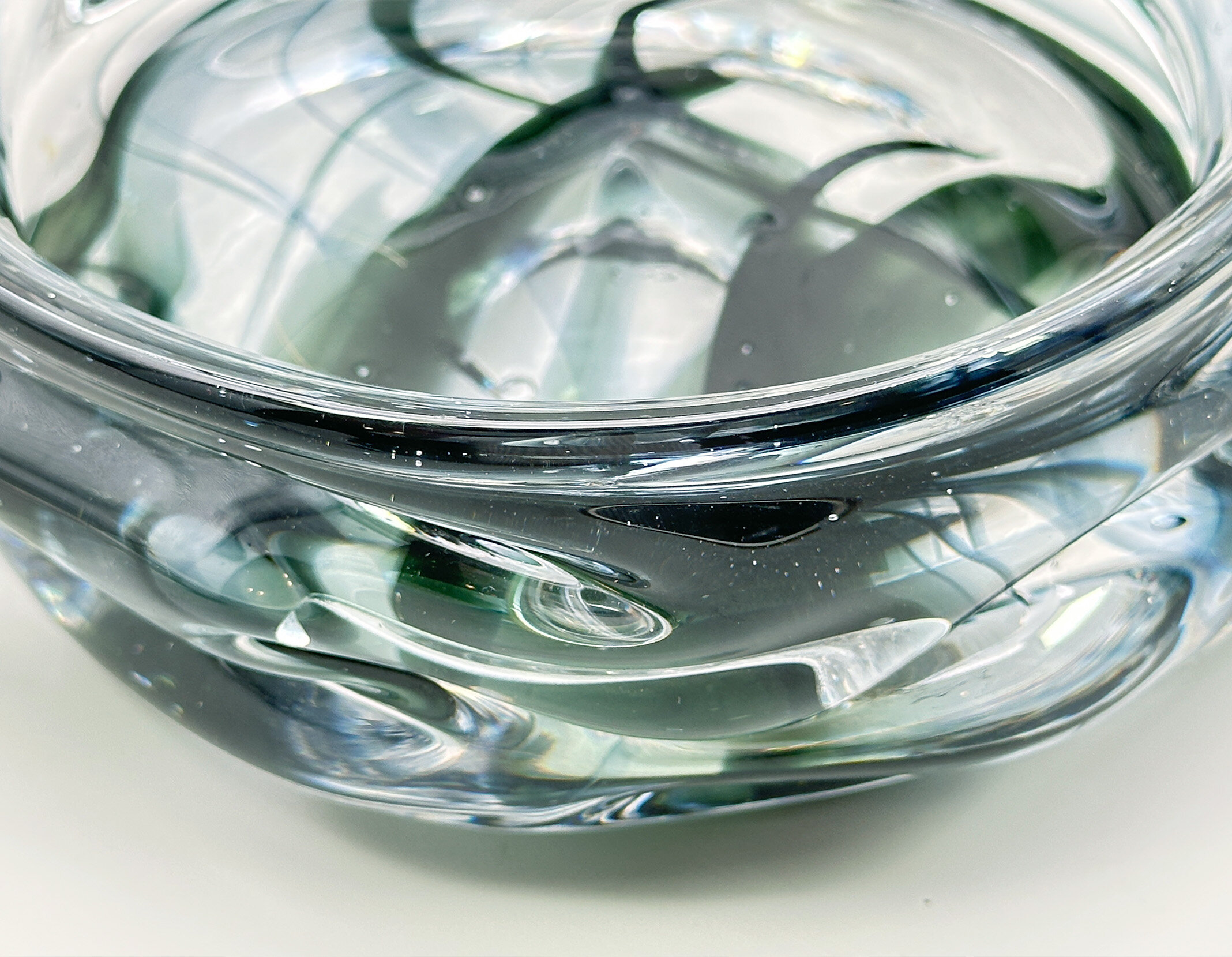An amorphous rounded glass bowl with heavily modelled, undulating sides producing a ‘knobbly’ effect, the clear glass streaked with dark grey/green glass trails. This semi abstract, almost organic design is well known and was produced at the Whitefriars glassworks in the late 1960s and early 1970s. Founded by James Powell in 1834, who bought an existing glassworks in Whitefriars, London, the firm continued through the generations, relocating to Wealdstone in Middlesex in 1923. Many designers worked for it including Geoffrey Baxter, who created the celebrated ‘banjo’ and ‘drunken bricklayer’ vases, but bowls of this form and similar pieces with a ‘knobbly’ form were designed by William Wilson, Whitefriars’ chief designer, and Harry Dyer, this particular bowl with the pattern number 9613 and to be found in the catalogues from 1964 to 1973 (see image 8 for the 1964 catalogue). Unfortunately the high labour costs of handmade glass and the economic difficulties in the UK in the late 1970s made Whitefriars uncompetitive and it ceased trading in 1980 after which its factory was demolished.| Size: | Width (max) 9.5cm, Top rim 8.5cm/7cm, base 5cm |