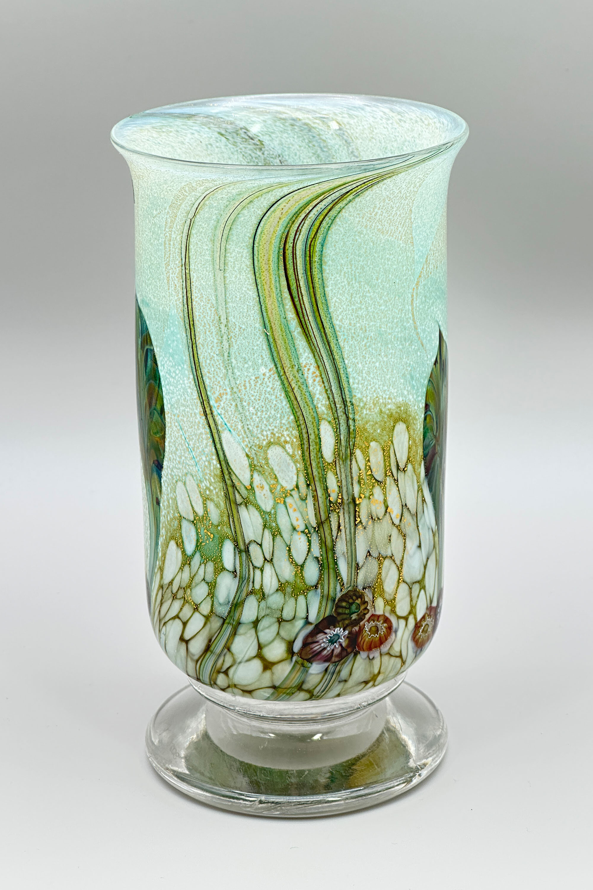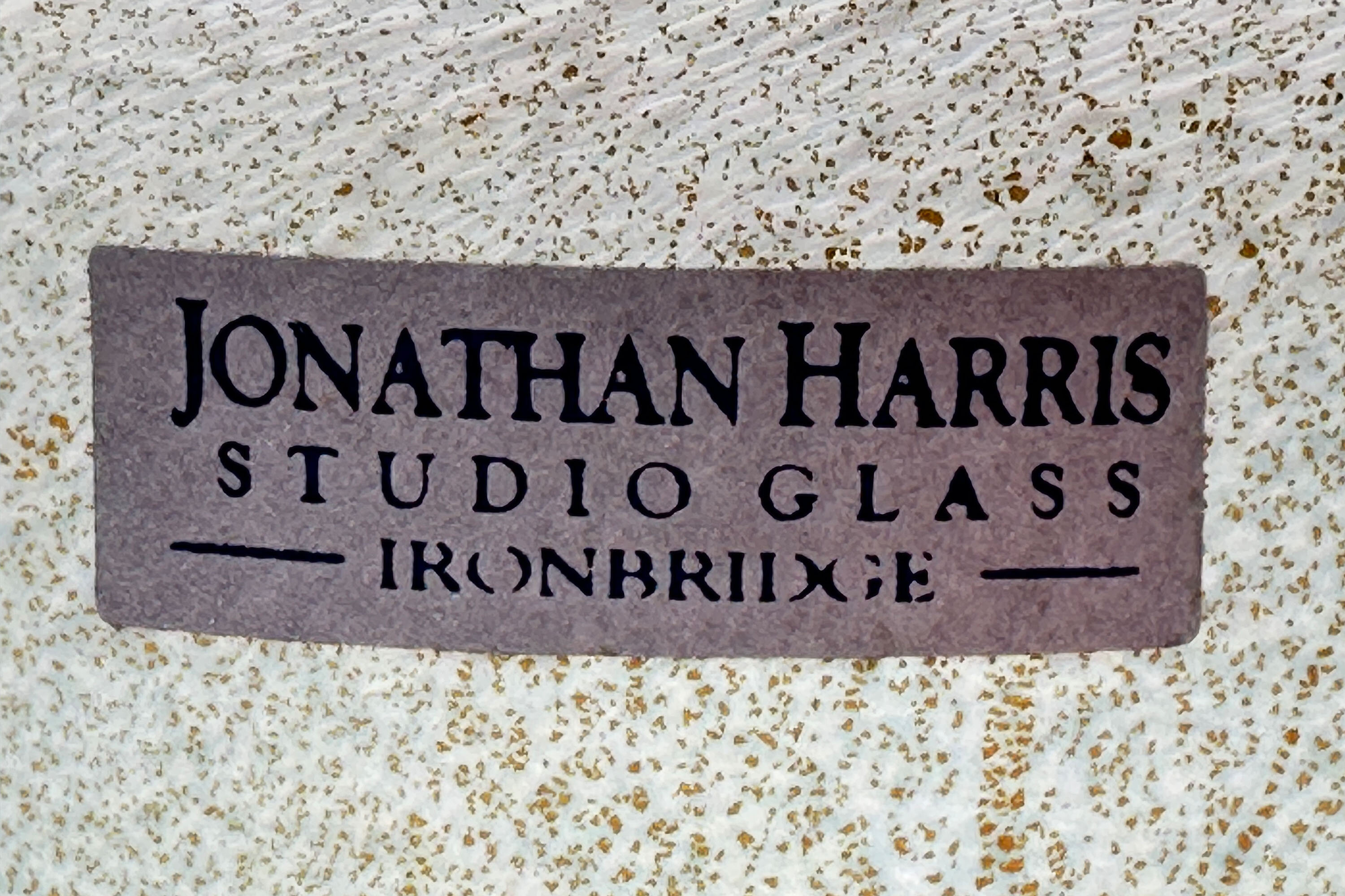 An art glass vase of upright beaker form curving inwards towards the spreading foot and outwards towards the top rim, the pale green ground intricately decorated using cameo techniques and gilt metal flakes with a design of lily leaves and reads issuing from a stylised rocky base, the ground speckled to resemble water. The base carries an etched signature for the artist ‘Jonathan Harris’ ‘Stourbridge’ ‘England’ ‘2006’ and there is also a label for the studio ‘Jonathan Harris’ ‘Studio Glass’ ‘Ironbridge’.Born in 1965 Jonathan Harris (see image 13) is one of the sons of the famous glassmaker Michael Harris who founded Mdina glass in 1968 and then Isle of Wight Glass in 1972. Jonathan worked with his Father in the Isle of Wight studio and is said, with his Father’s help, to have blown a glass fish, aged eight. After studying glass at Stourbridge college and a long spell at Isle of Wight Glass, where he became managing director 1992, Jonathan and his wife Alison set up their own studio in the Ironbridge Gorge, Shropshire in 2000 being given permission to establish their own premises within the Coalport China Museum complex.