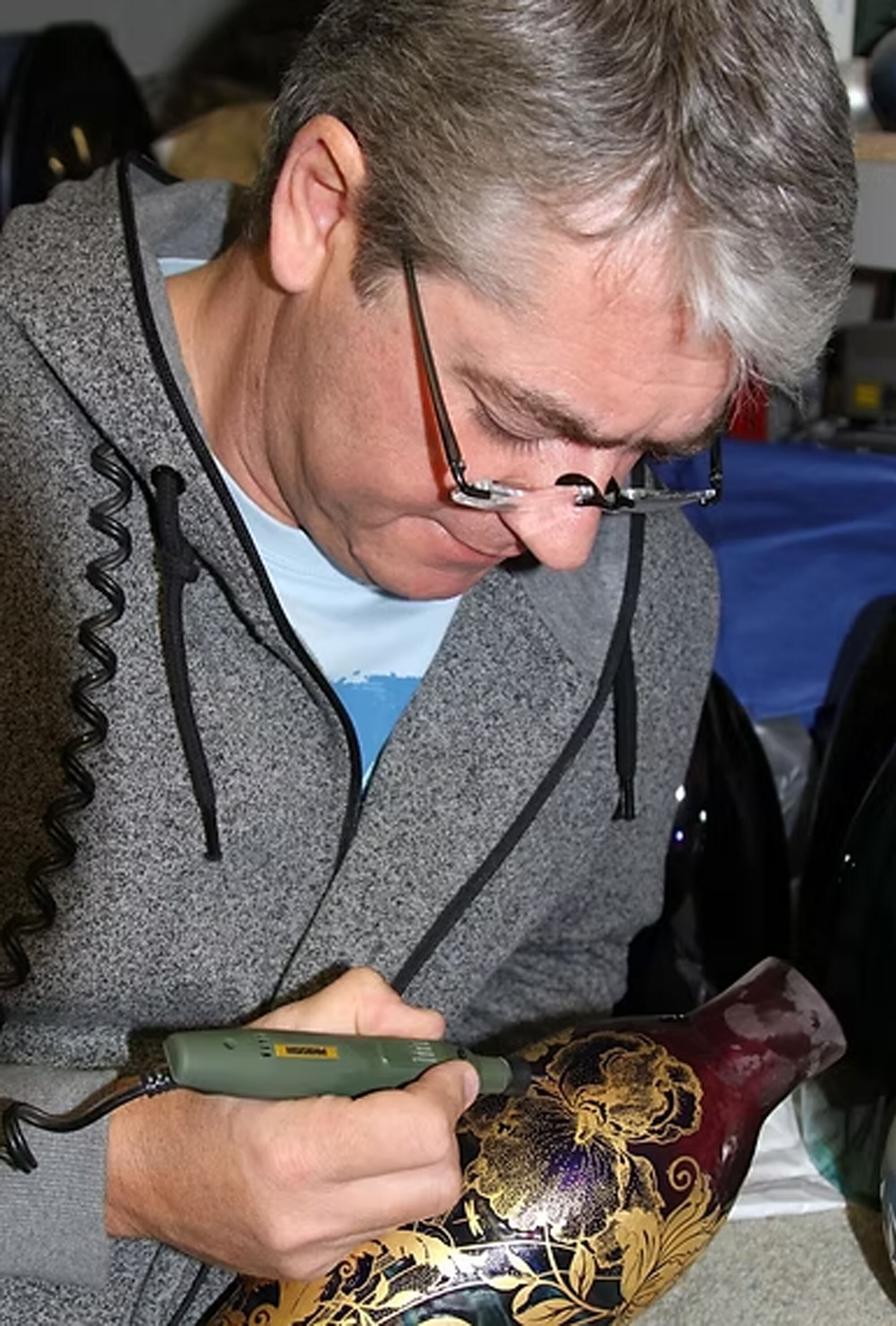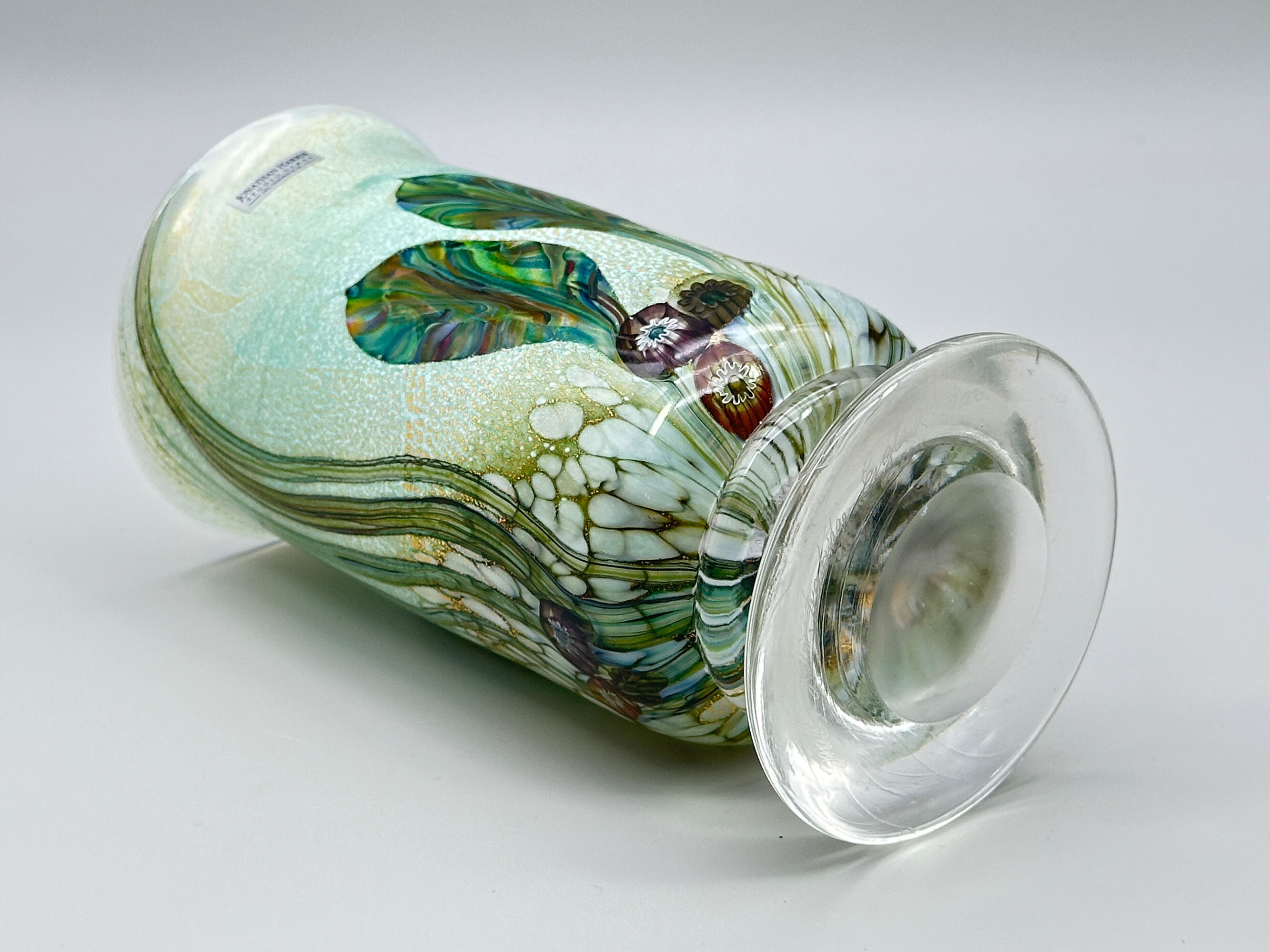 The aim of the studio was to assemble a highly talented team of glassmakers to develop complex and intricate glass making techniques drawing inspiration from such designers as Galle and Tiffany but also, like his Father, from the natural world. A wide variety of influences can be seen including Gothic, Art Nouveau and Art Deco. It is perhaps the second of these which is most closely seen here and the technique is one resembling cameo glass where the surface of the glass is skilfully carved by hand through layers of enamel colours, 24ct gold & sterling silver leaf to reveal an intricate design in outstanding detail. All the art glass pieces are unique and all hand signed by Jonathan Harris himself making this vase an impressive example of his studio’s output.