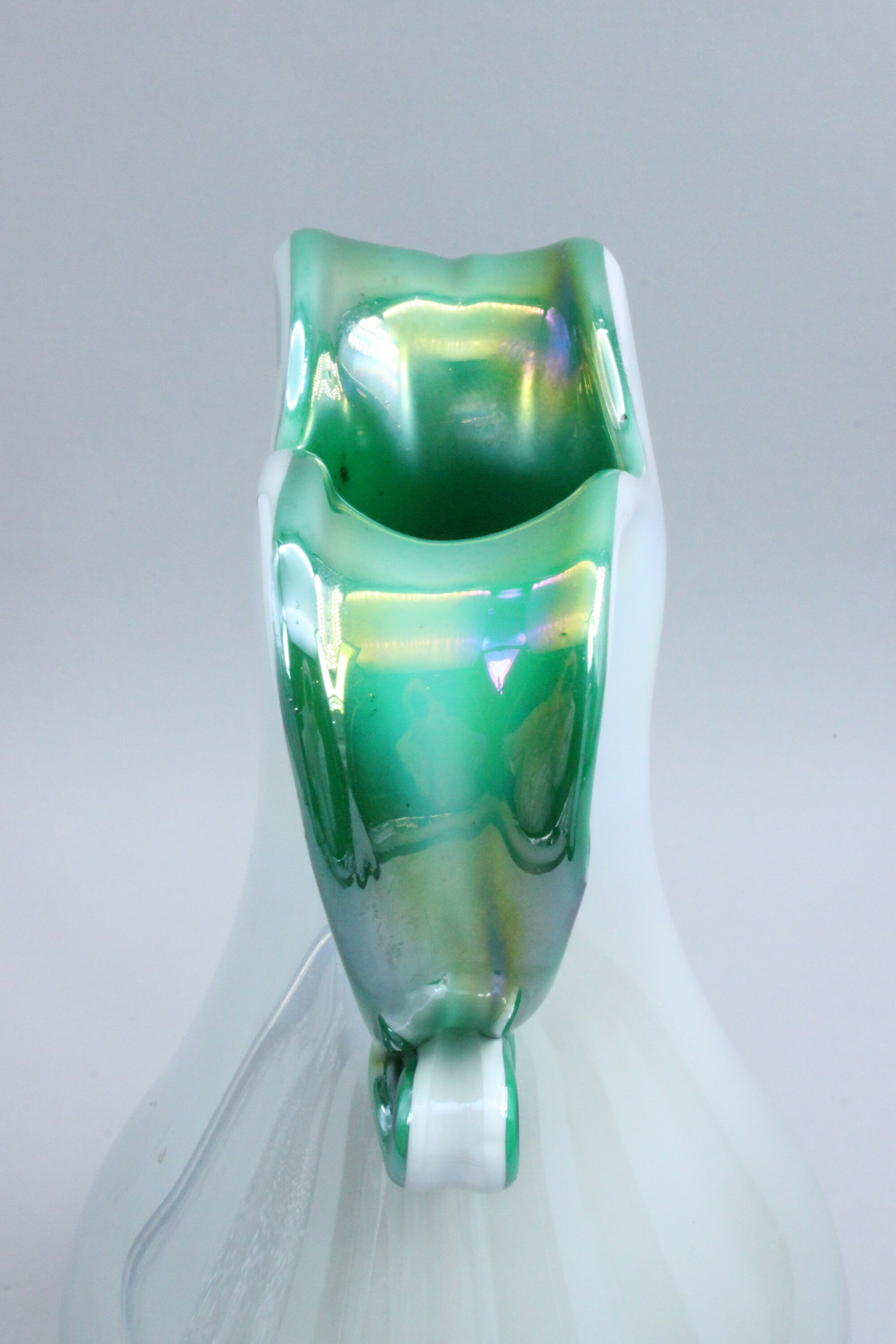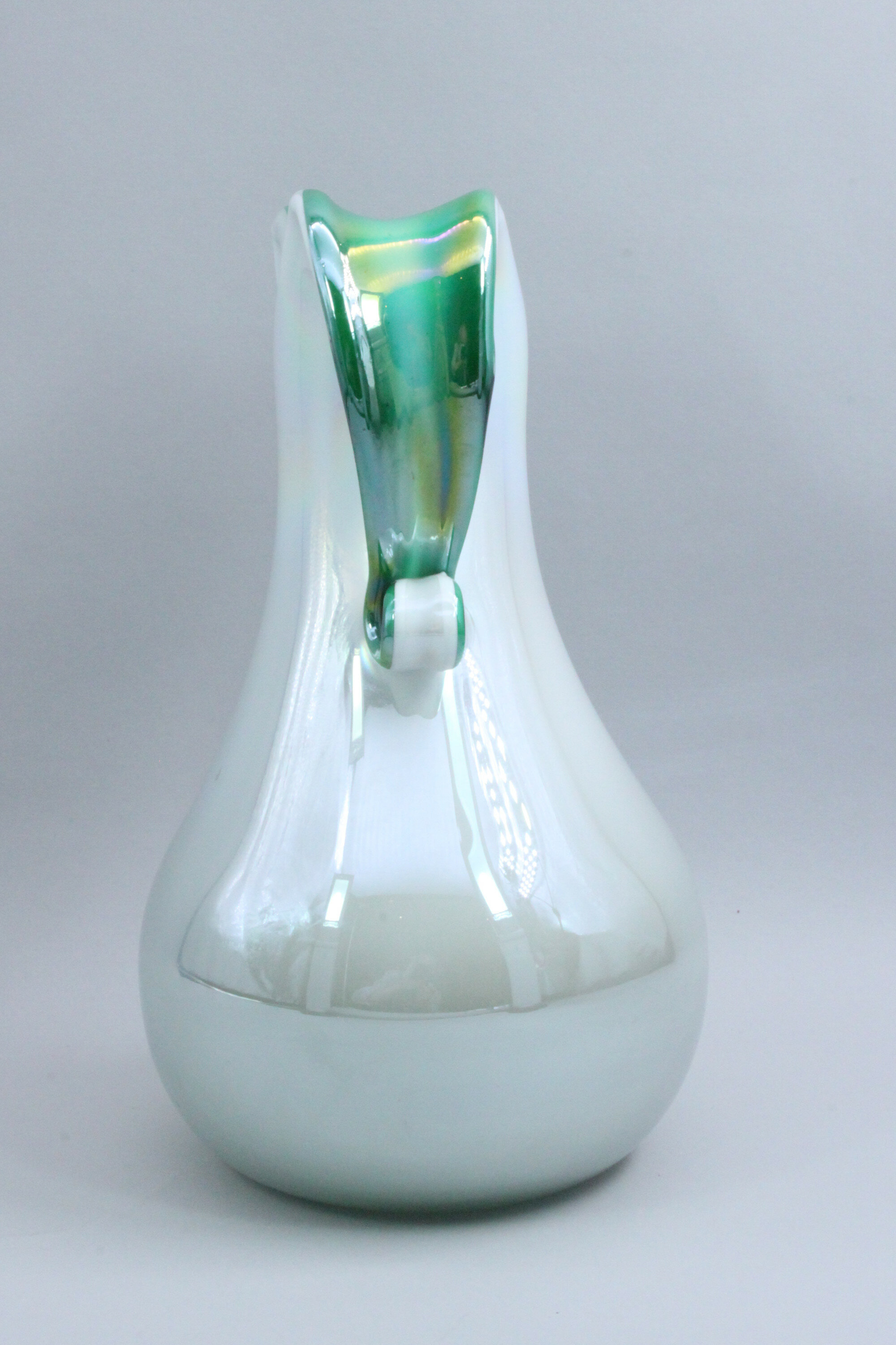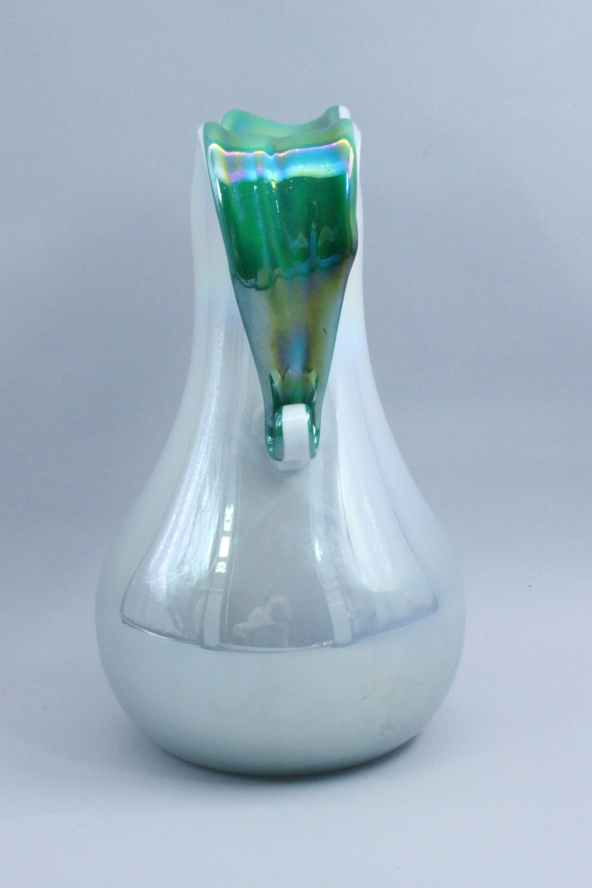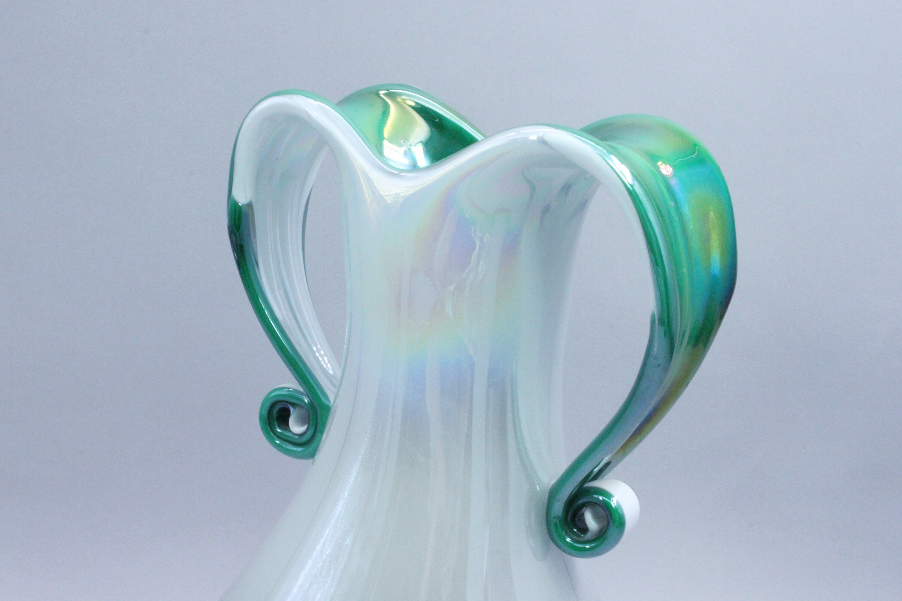 A fine quality art glass vase, the broad pear shape body flaring to the neck which turns over to form two large loop form handles, the cream iridescent glaze skillfully combined with an iridescent green highlighting the inside of the neck and the handles. The quality of manufacture here is self evident but a provenance hard to determine. The flowing lines employed can reflect pieces form Czechoslovakia or Italy and the general finish some of the productions of the Orrefors factory in Sweden. Dating is equally problematic but the mid twentieth century seems a reasonable attribution.| Size: | Ht 23cm Width 15cm (max) |