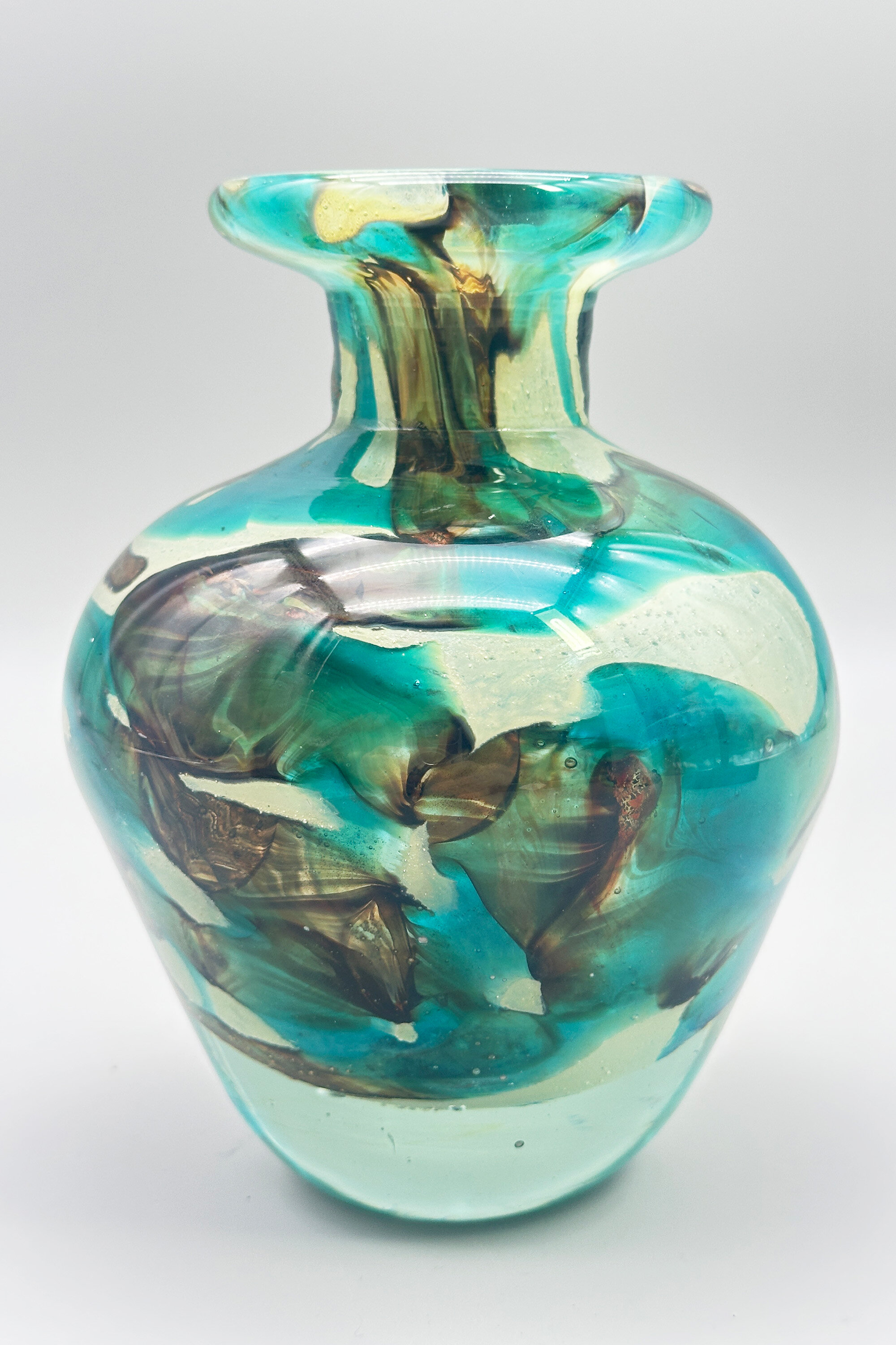A stoutly blown glass vase of tapering ovoid form with a broad neck and a flaring rim, the base flat with an etched signature ‘Mdina’, decorated in browns and blues with a marble effect pattern.Mdina Glass was founded in the Maltese town of Mdina in 1968 by Michael Harris and Eric Dobson. The town had no history of glass making but the venture proved to be a success. Its wares, free formed organic glassware, often in colours inspired from the sea, sand, earth and sky, proved very popular with tourists visiting Malta. This vase is one of the earlier productions made by Mdina (the format of the signature confirms this) probably dating to the 1970s. The design is known as the ‘tiger pattern’ and is believed to have been created by Eric Dobson himself. All the pieces in the range have individual variations but this particular version is extremely pleasing and highly characteristic of Mdina’s naturalistic style.