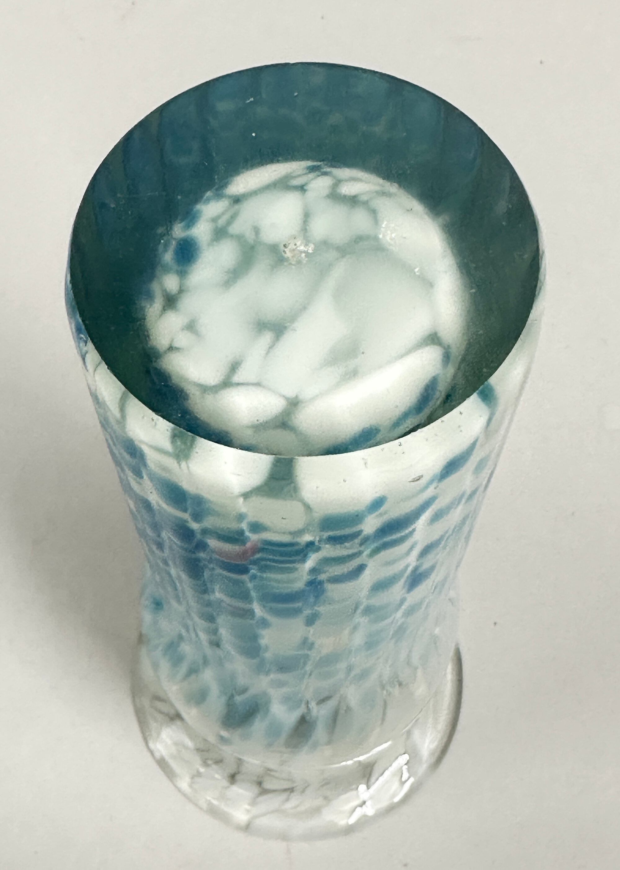A glass vase of fluted cylindrical form slightly swelling towards the top and with an everted rim, the base flat, decorated with a ‘bubble’ design in clear and blue colours, the pattern more elongated towards the top. Both the form and decoration here can be found in other pieces which were made by the Mtarfa glassworks in Malta. Founded in 1979 by Paul Said, the brother of Joseph Said who was at the time the owner of Mdina Glass, the studio produced pieces which were similar in both form and decoration to those made by its more famous rival. Indeed, both brothers were originally trained by Michael Harris, the founder of Mdina Glass, where they both worked. As with the Mdina pieces the glassmakers at Mtarfa took their inspiration from the colourings of the sea and landscape of the Mediterranean which surrounded them. It is perhaps not fanciful to see here bubbles in water. Some of the Mtarfa pieces survive with their original labels which allows the identification of others as here. This vase was probably made in the 1980s and before the rebranding of the firm as ‘Valletta Glass’.| Size: | H 17 cm Diameter 7.5 cm |